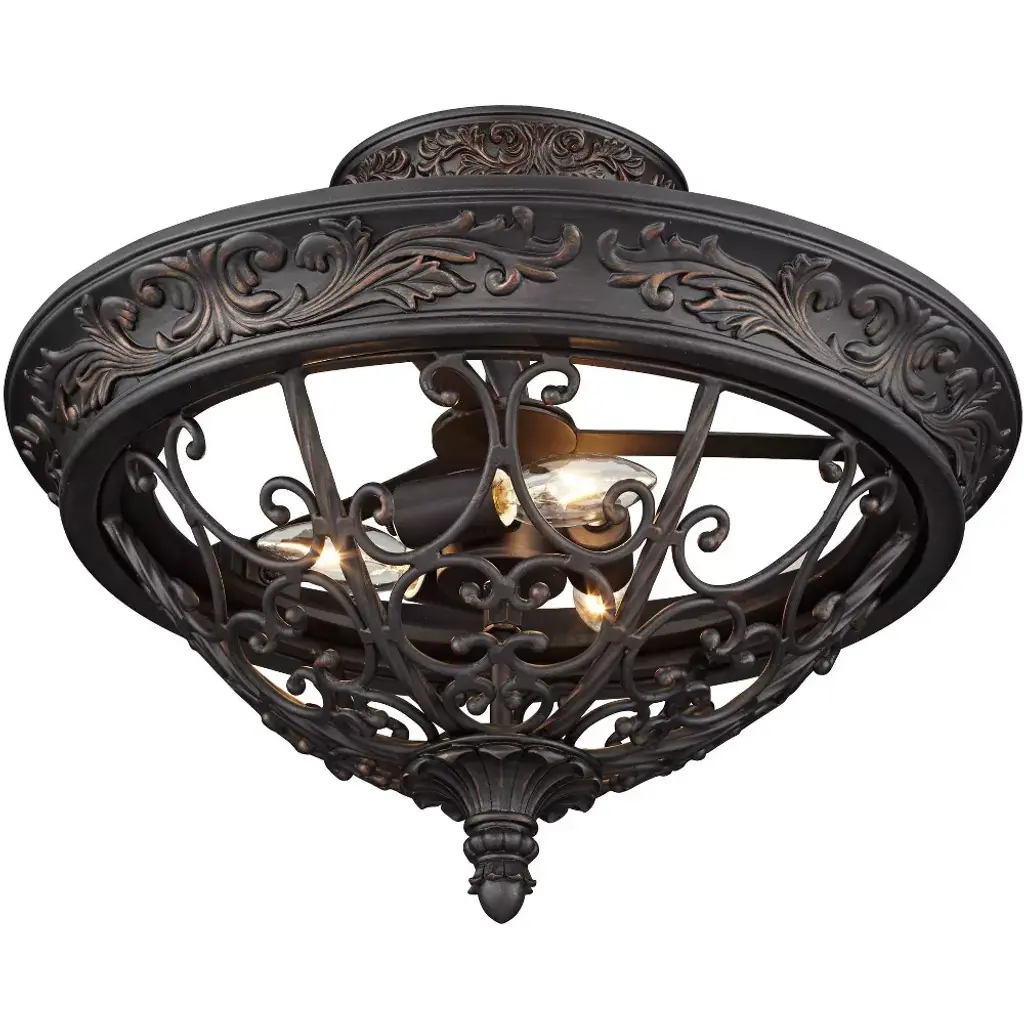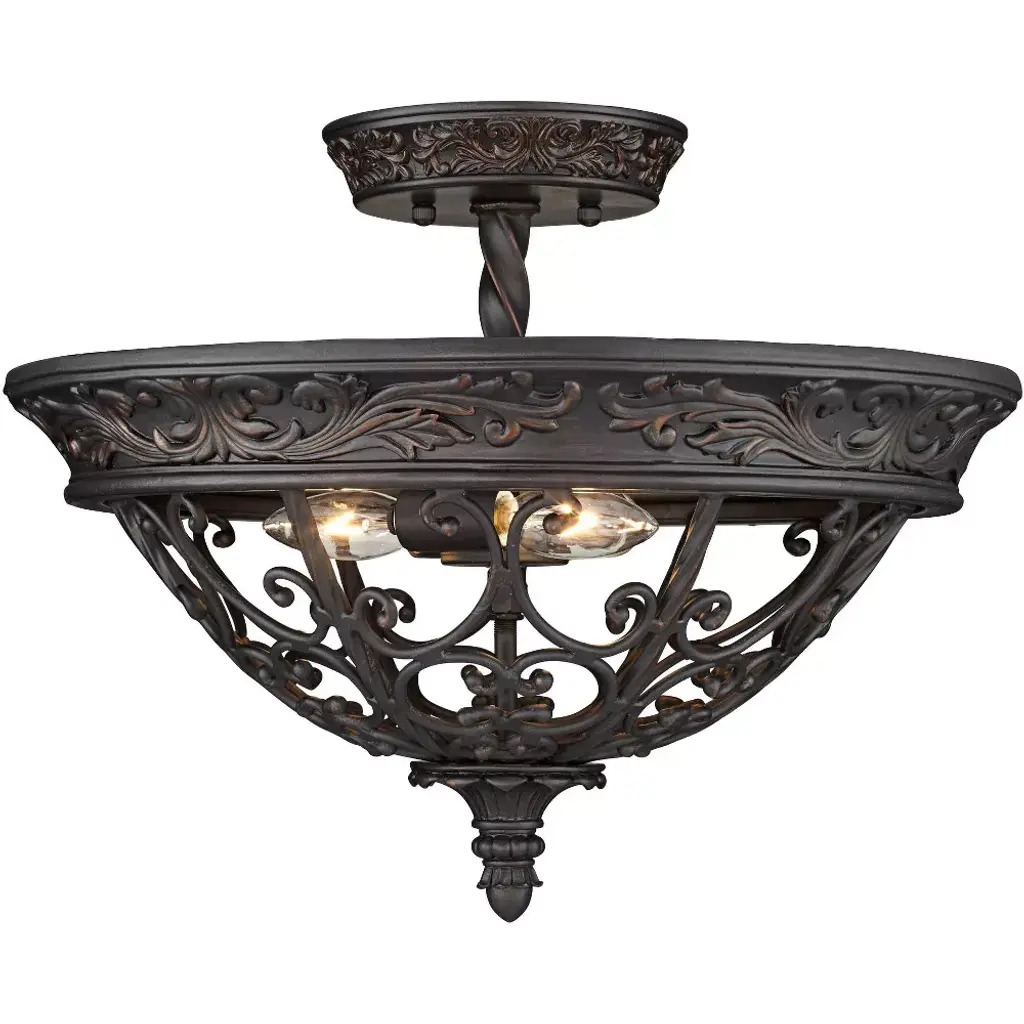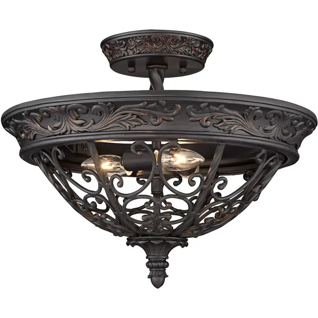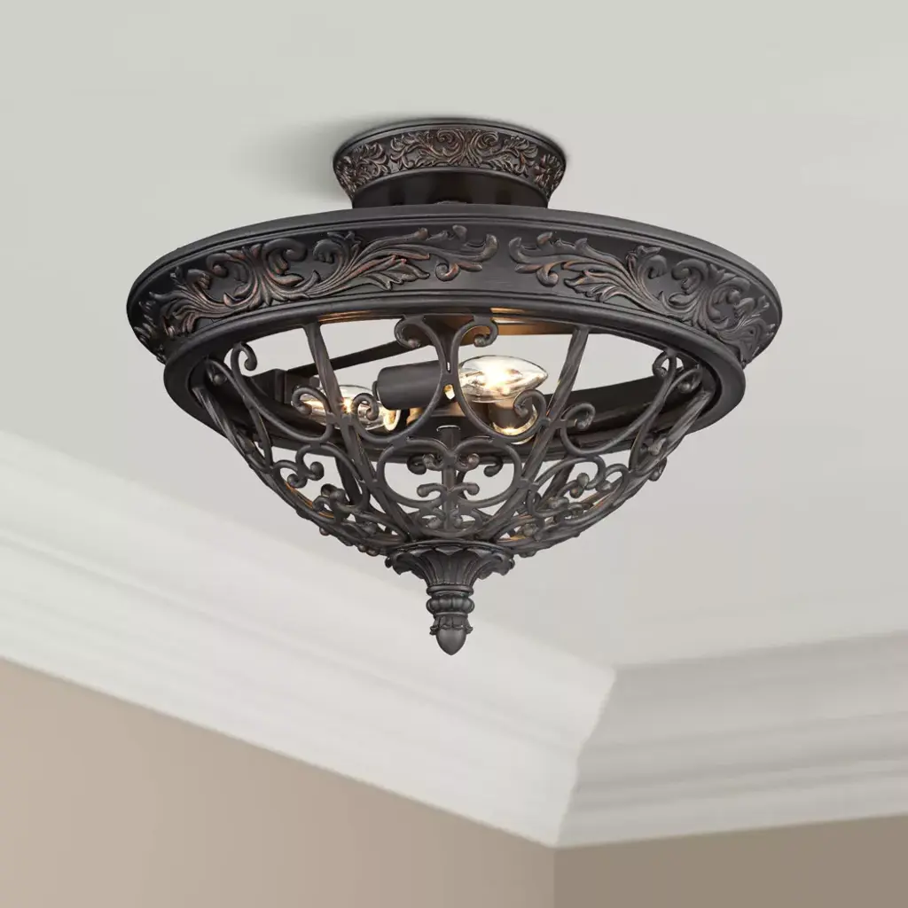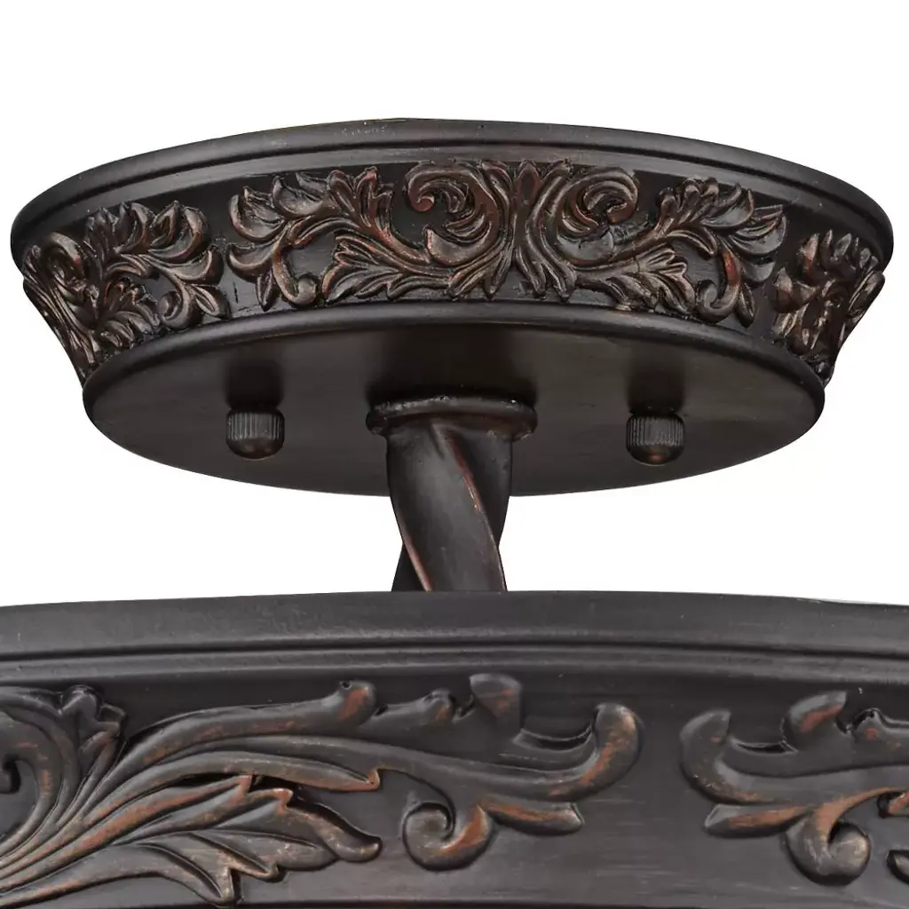 With elegant scrolls and an open look, this semi-flushmount fixture lends beautiful style to entryways and foyer spaces in your home. From the Franklin Iron Works brand, the design features a rubbed bronze finish ornate frame with scroll and acanthus leaf detailing. Three lights are clustered inside the open frame. Add traditional old world elegance to your home with this handsome close-to-ceiling light.