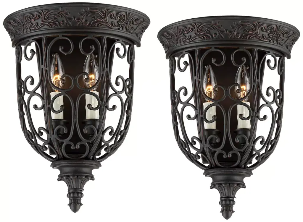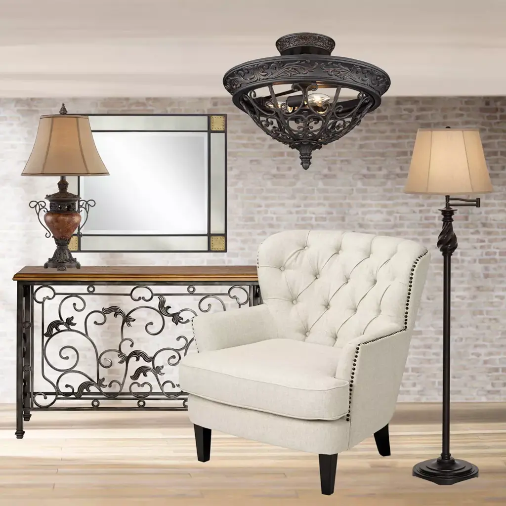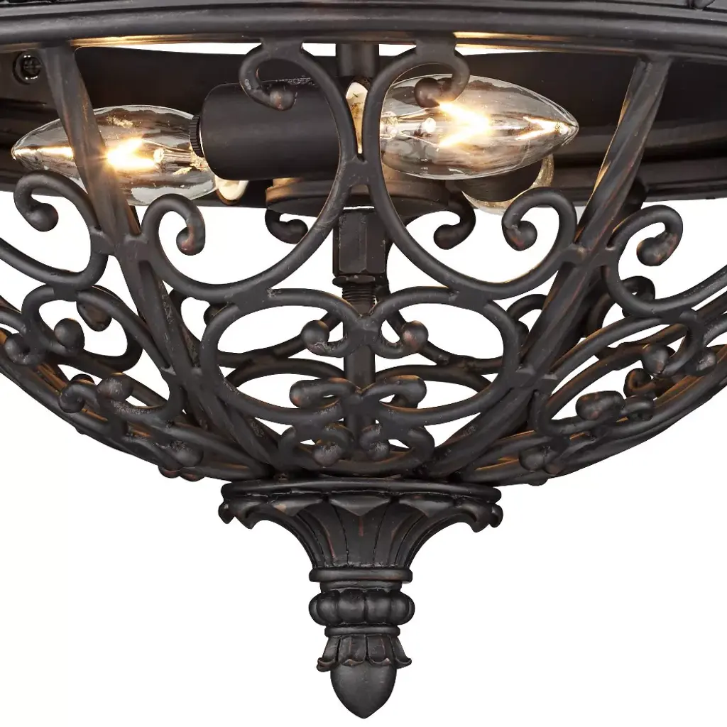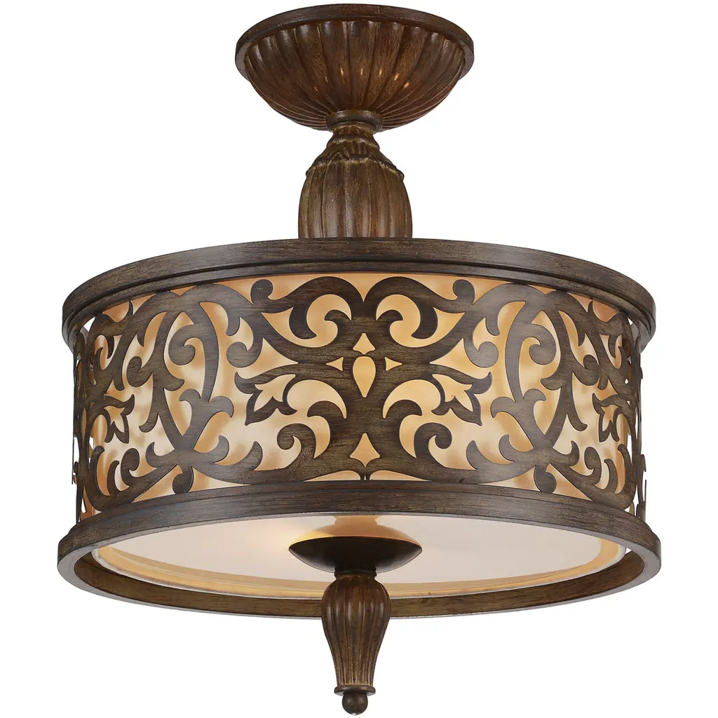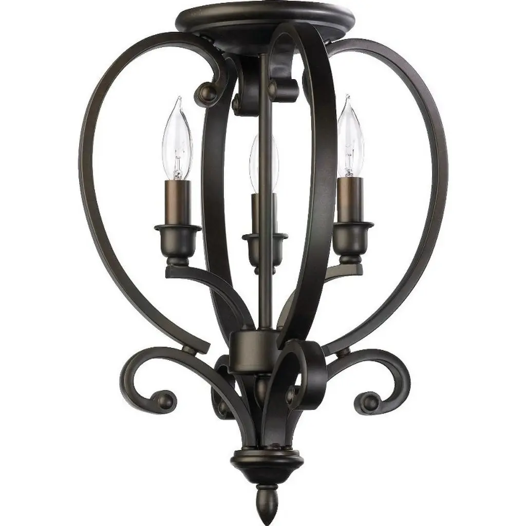 With elegant scrolls and an open look, this semi-flushmount fixture lends beautiful style to entryways and foyer spaces in your home. From the Franklin Iron Works brand, the design features a rubbed bronze finish ornate frame with scroll and acanthus leaf detailing. Three lights are clustered inside the open frame. Add traditional old world elegance to your home with this handsome close-to-ceiling light.