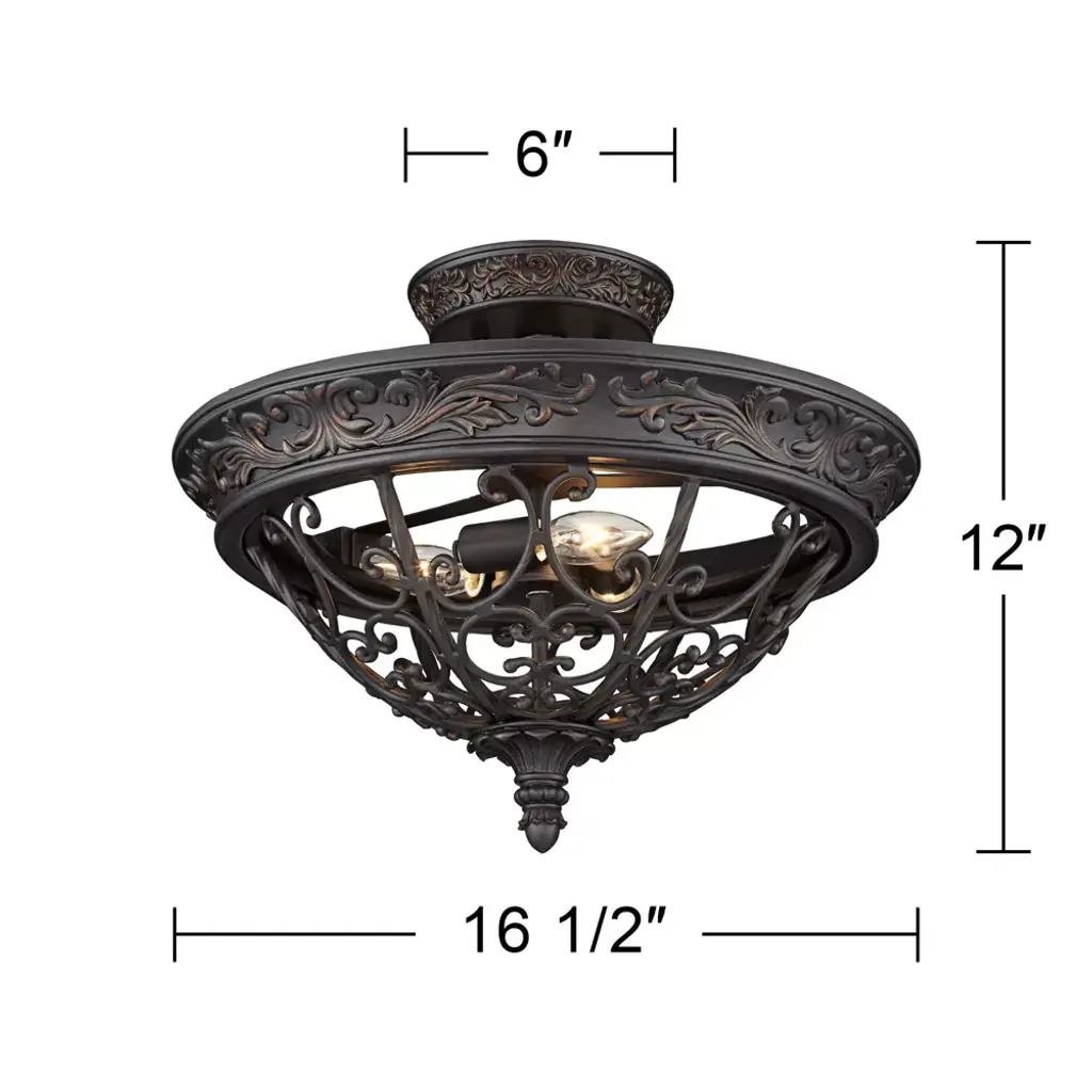 Franklin Iron Works French Scroll Rustic Farmhouse Ceiling Light Semi Flush Mount Fixture 16 1/2" Wide Rubbed Bronze 3-light For Bedroom Kitchen House