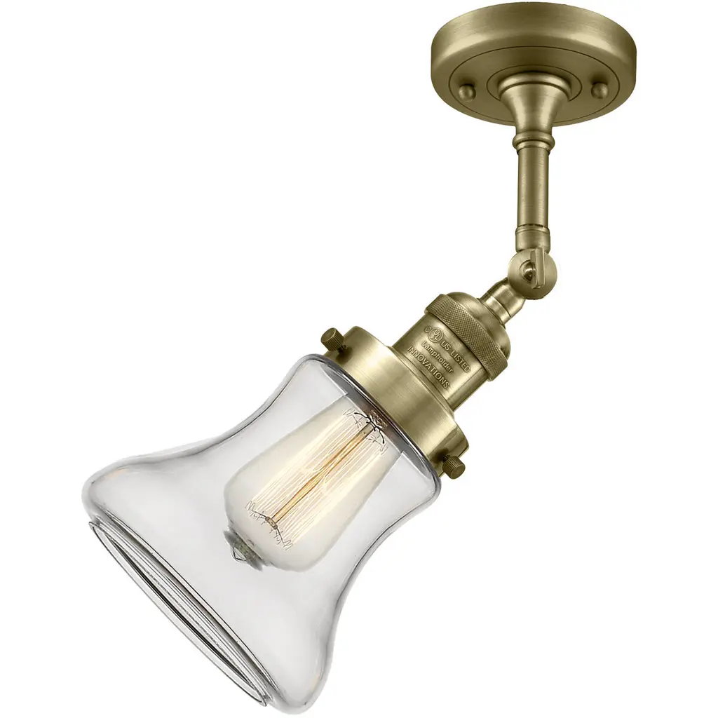 The Bellmont 1 Light Semi-Flush Mount is part of the Franklin Restoration Collection. Solid Brass 180 Degree Adjustable Swivel with internal teeth that lock in at 5 degree intervals With Engraved Cast Cup