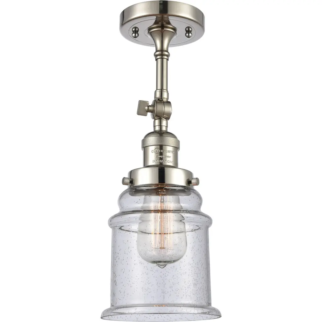 The Canton 1 Light Semi-Flush Mount is part of the Franklin Restoration Collection. Solid Brass 180 Degree Adjustable Swivel with internal teeth that lock in at 5 degree intervals With Engraved Cast Cup