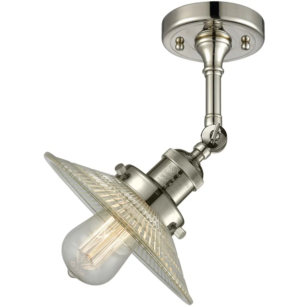The Halophane 1 Light Semi-Flush Mount is part of the Franklin Restoration Collection. Solid Brass 180 Degree Adjustable Swivel with internal teeth that lock in at 5 degree intervals With Engraved Cast Cup