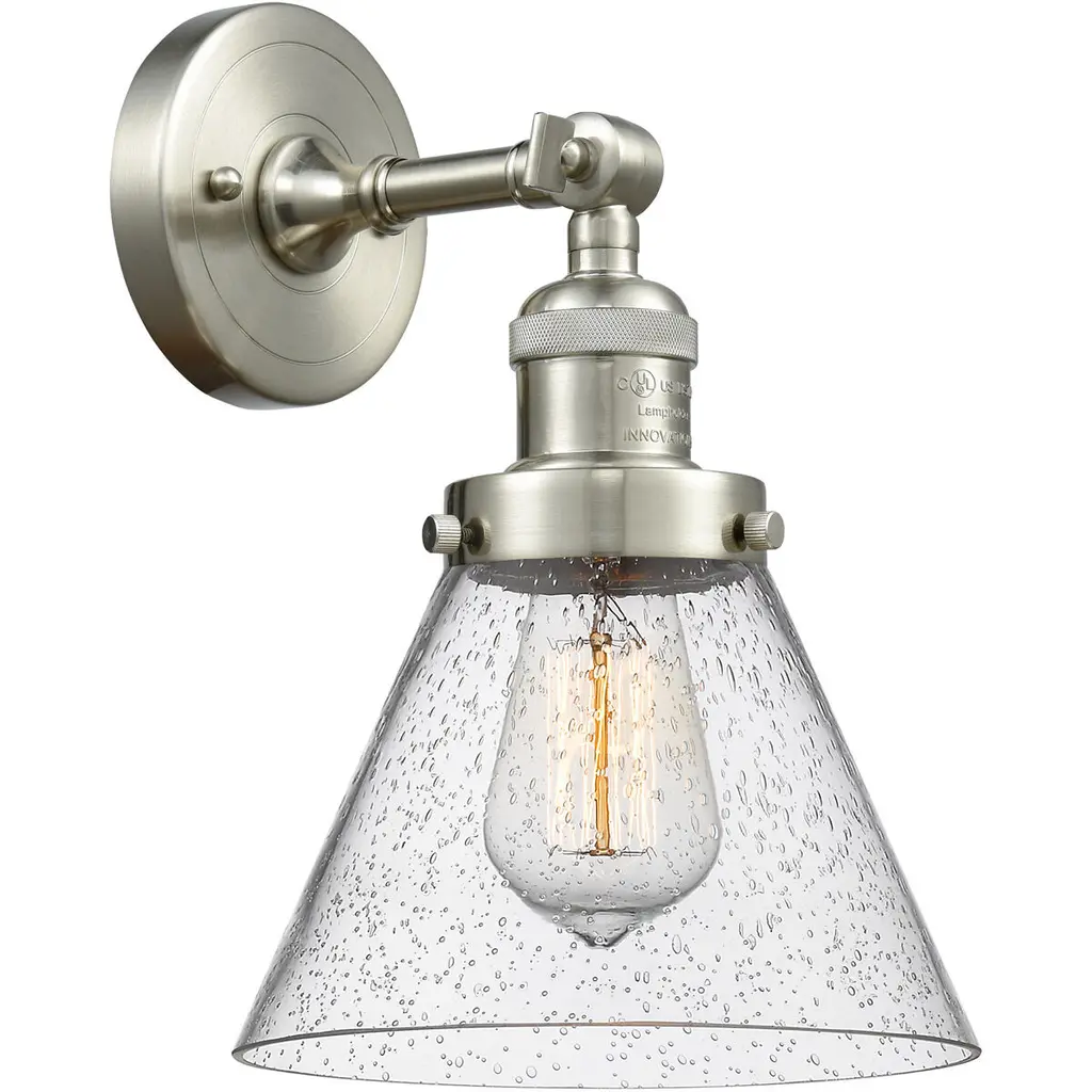 Franklin Restoration Large Cone Led 8 Inch Brushed Satin Nickel Semi-Flush Mount Ceiling Light In Seedy Glass, Franklin Restoration