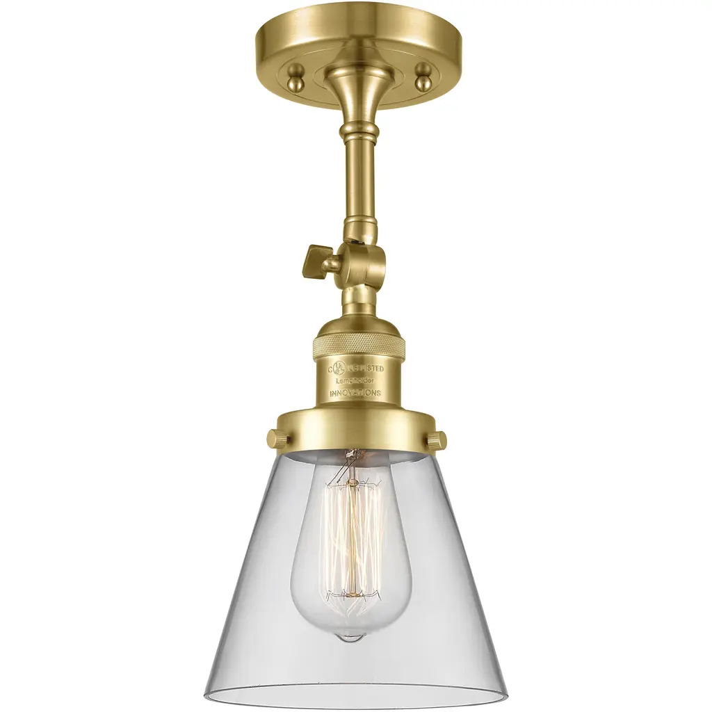 The Small Cone 1 Light Semi-Flush Mount is part of the Franklin Restoration Collection. Solid Brass 180 Degree Adjustable Swivel with internal teeth that lock in at 5 degree intervals With Engraved Cast Cup