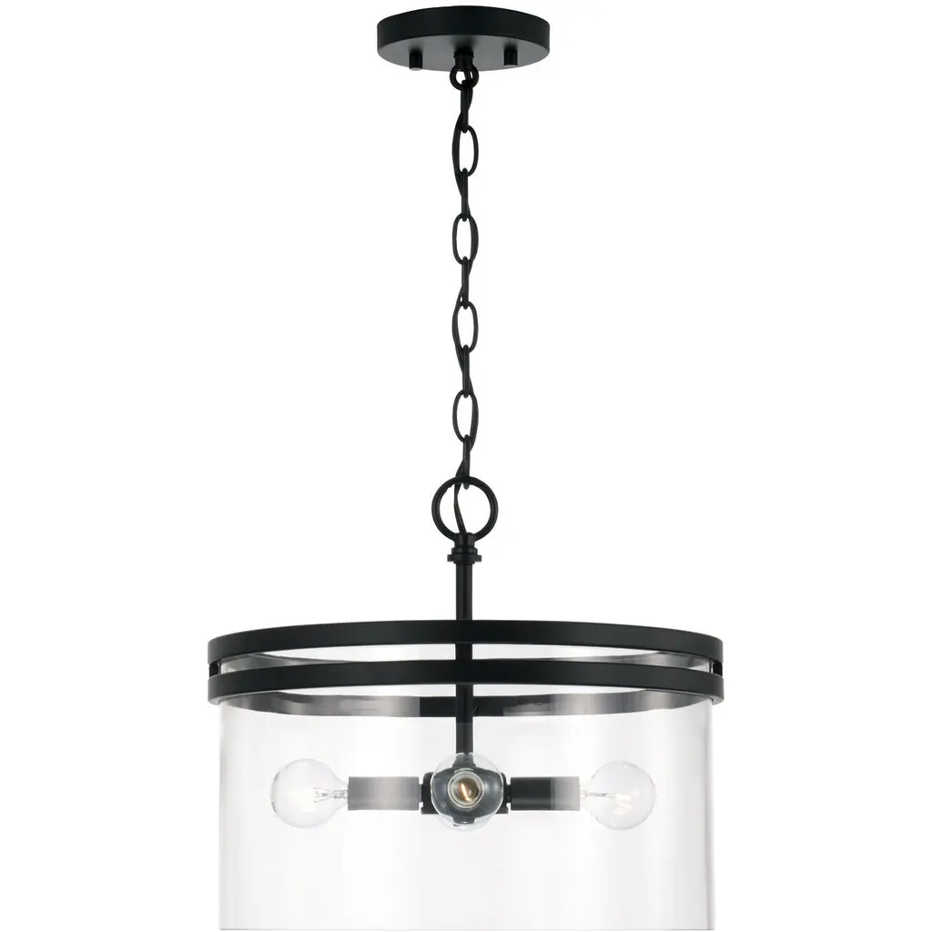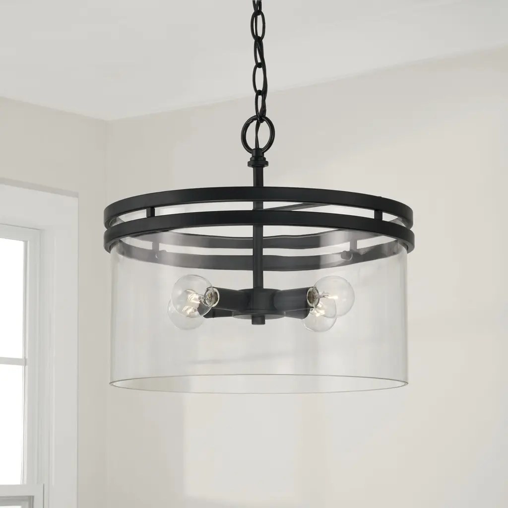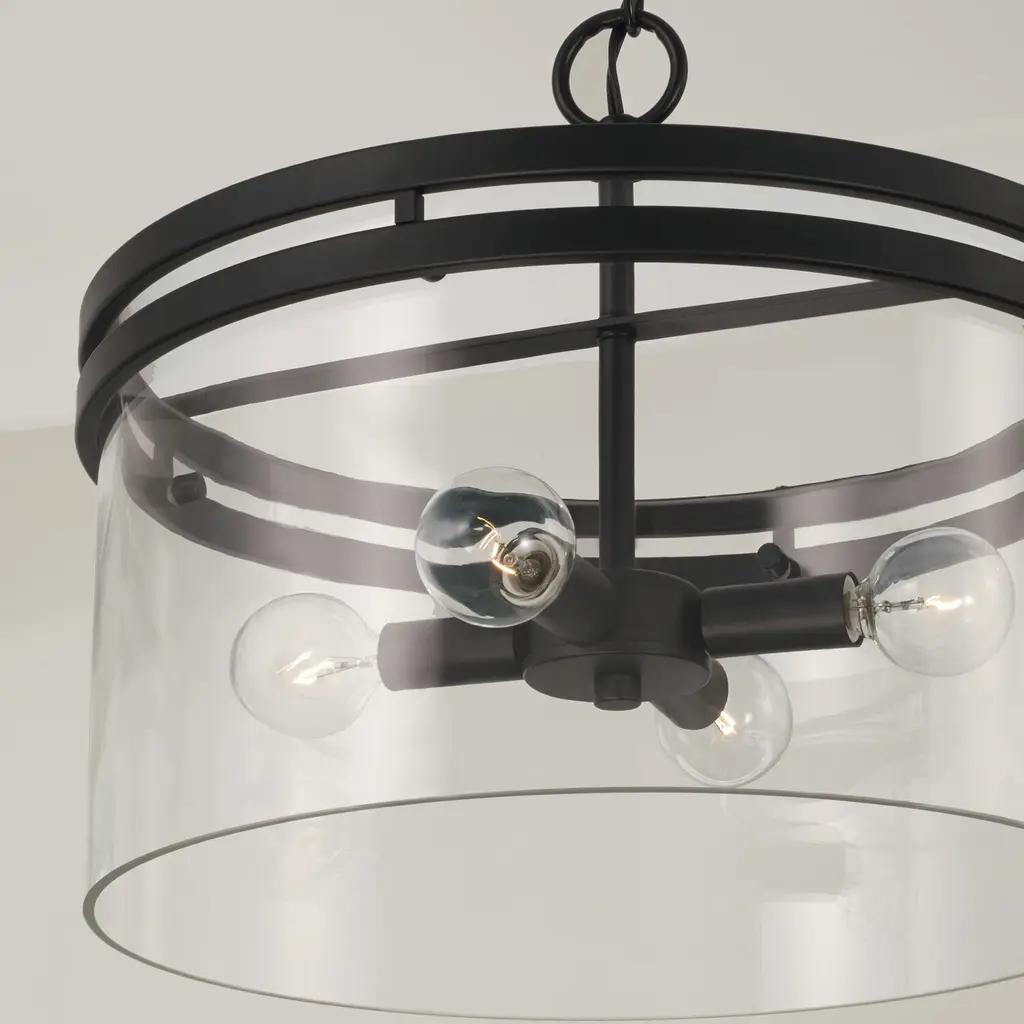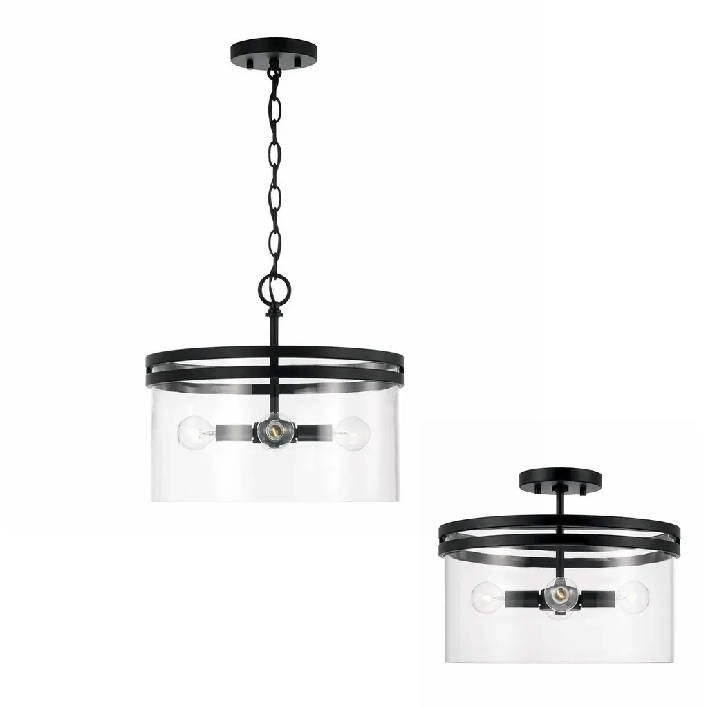With the option to hang as a semi-flush or pendant, the Fuller Dual Mount for HomePlace adds sleek style to any space. The contemporary shape paired with clear glass and the Matte Black finish bring modern sophistication.