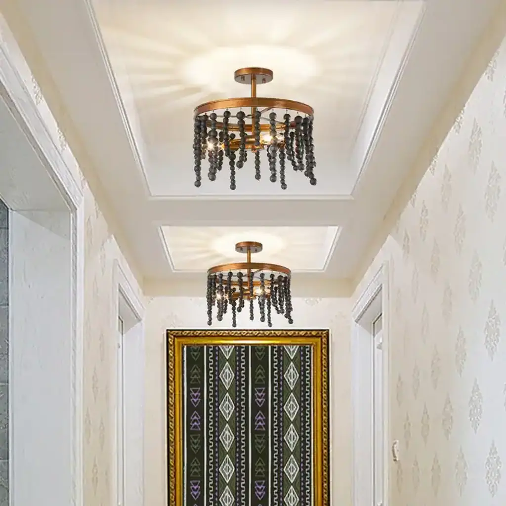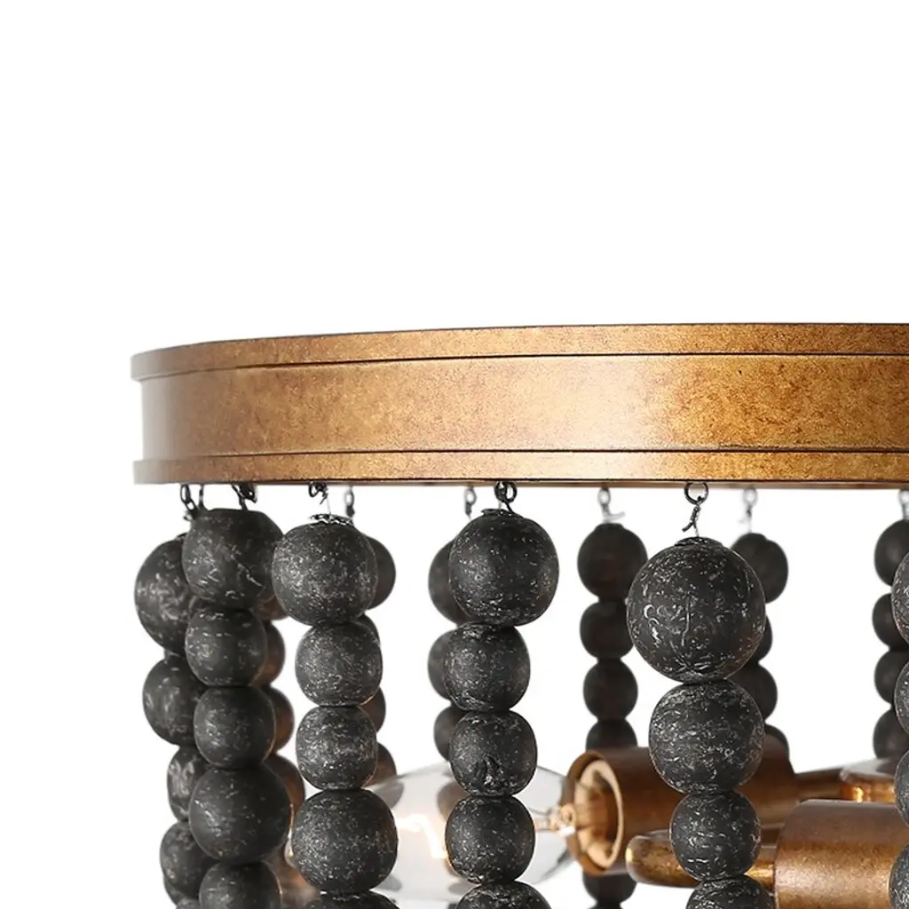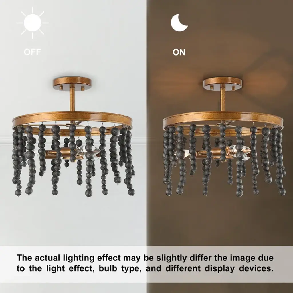 Crafted from a metal frame in antique brass gold finish with strands of hand-painted black wood beads, the wood beads semi-flush mount light has both vintage and boho style.The staggered sorting of ups and downs beads lines breaks the dullness of the space, it will be an eye-catching decoration in your kitchen living room, dining room, and bedroom ceiling space. The scattered light shadow create romance french country style.Dimension: Lamp size: D 14" x H 14" Canopy Size: D 4.7" x H 1"Features: Material: Vintage distressed craft metal frame. Distressed bump Black finish with white speckle, uneven surface.Finish: Antiqued Brass Gold, Distressed Black WoodBulb: 3 x Type B/ Max 40W/ E12 base bulbsCompatible with dimmable/ / LED/ Edison bulbs(BULB NOT INCLUDED) Power Source: Hardwired ETL Listed for safe Warranty: 1-year Limited Manufacturer Indoor dry location use only