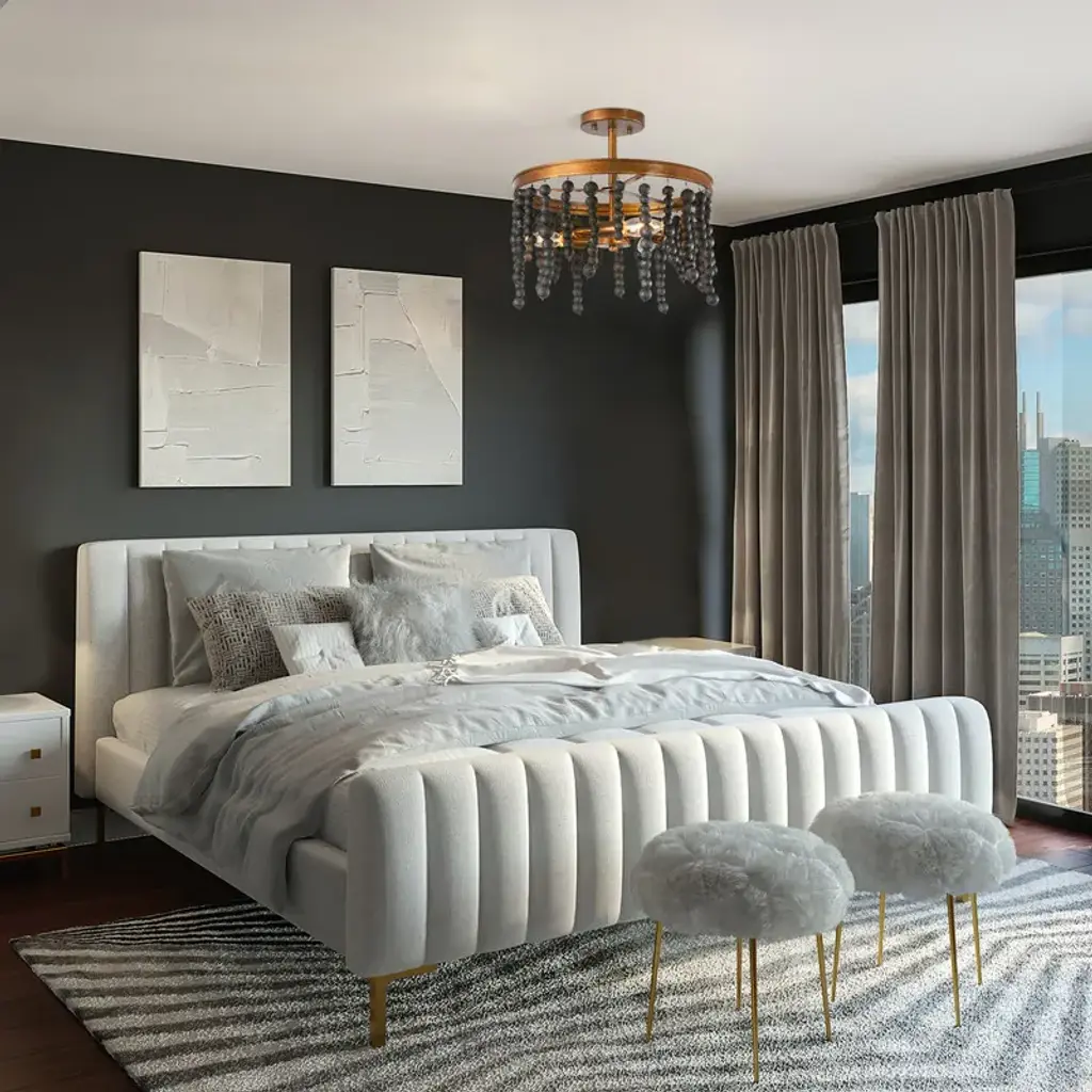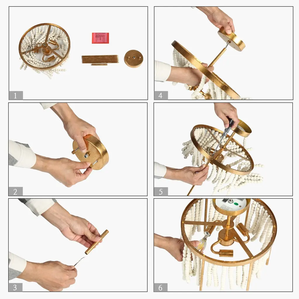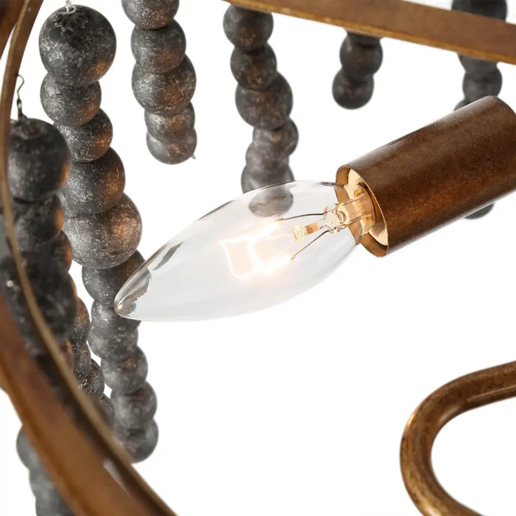 Crafted from a metal frame in antique brass gold finish with strands of hand-painted black wood beads, the wood beads semi-flush mount light has both vintage and boho style.The staggered sorting of ups and downs beads lines breaks the dullness of the space, it will be an eye-catching decoration in your kitchen living room, dining room, and bedroom ceiling space. The scattered light shadow create romance french country style.Dimension: Lamp size: D 14" x H 14" Canopy Size: D 4.7" x H 1"Features: Material: Vintage distressed craft metal frame. Distressed bump Black finish with white speckle, uneven surface.Finish: Antiqued Brass Gold, Distressed Black WoodBulb: 3 x Type B/ Max 40W/ E12 base bulbsCompatible with dimmable/ / LED/ Edison bulbs(BULB NOT INCLUDED) Power Source: Hardwired ETL Listed for safe Warranty: 1-year Limited Manufacturer Indoor dry location use only