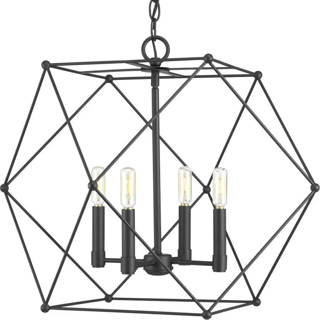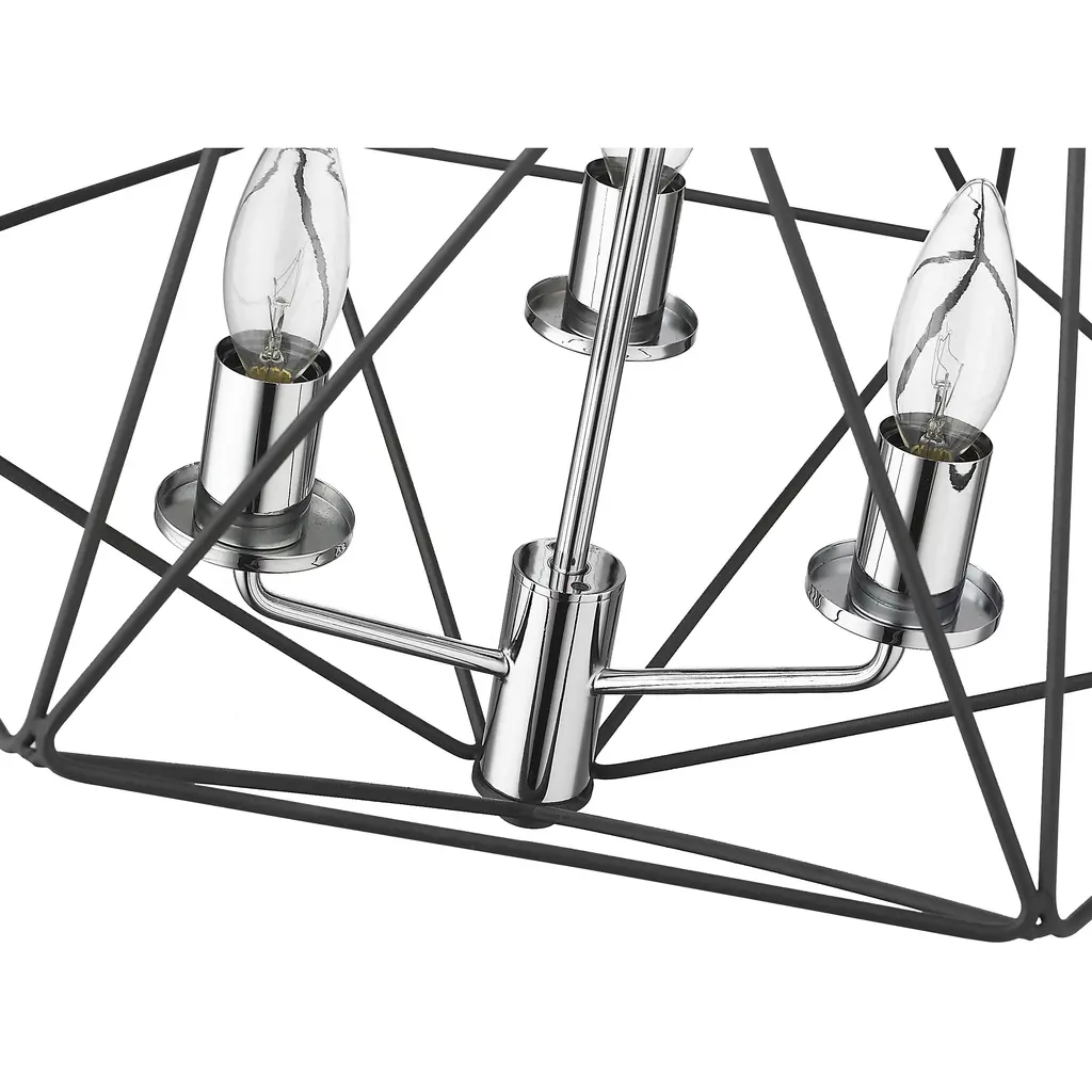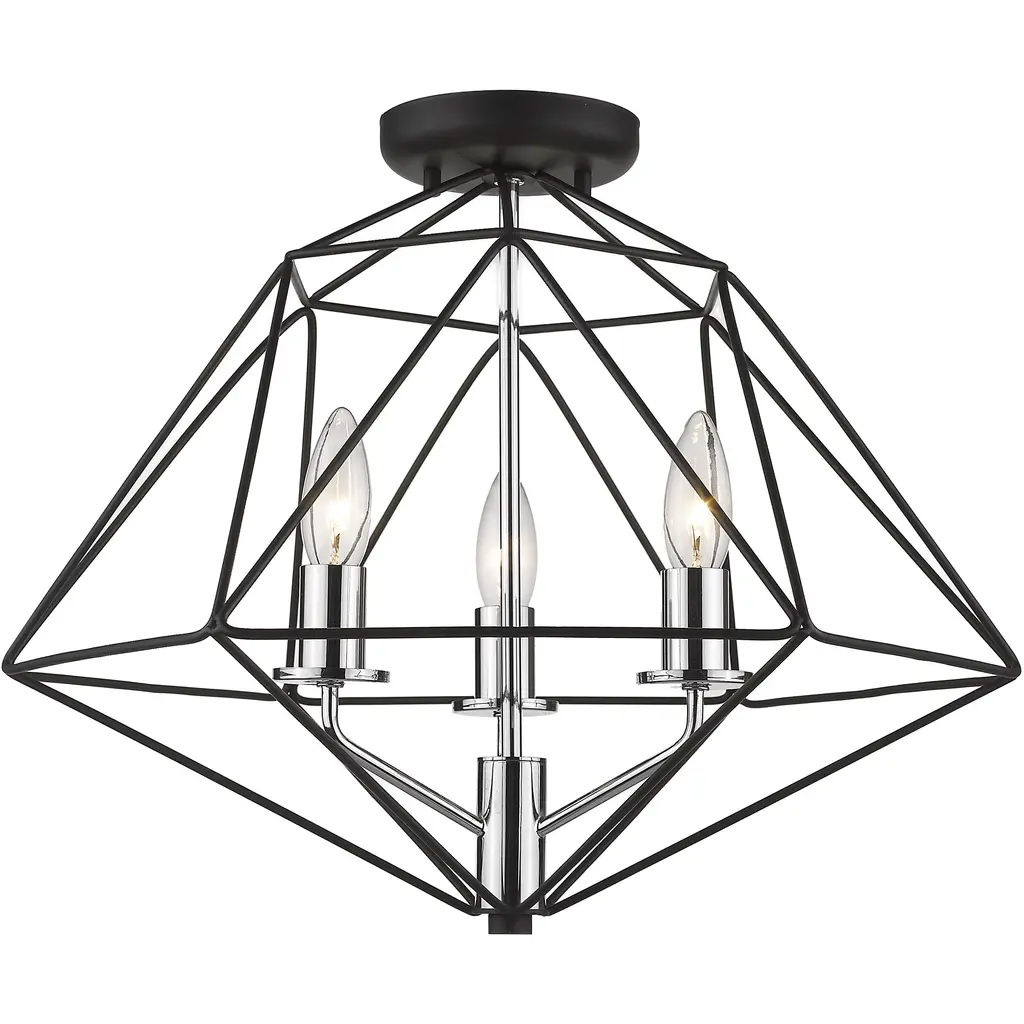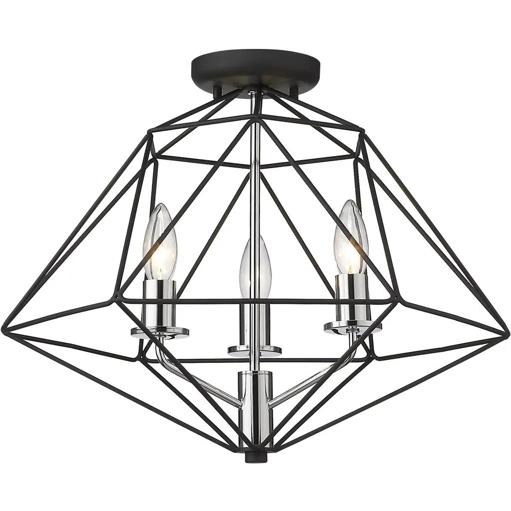 Fully energizing in its sleek geometric silhouette, this three-light semi-flush mount chandelier delivers sophistication and contemporary verve in a modern living or dining space. Follow the angles of an open cage-like frame fashioned from two-tone finish metal in Matte Black and Chrome, and an enticing theme that's ideal for an energetic design scheme.