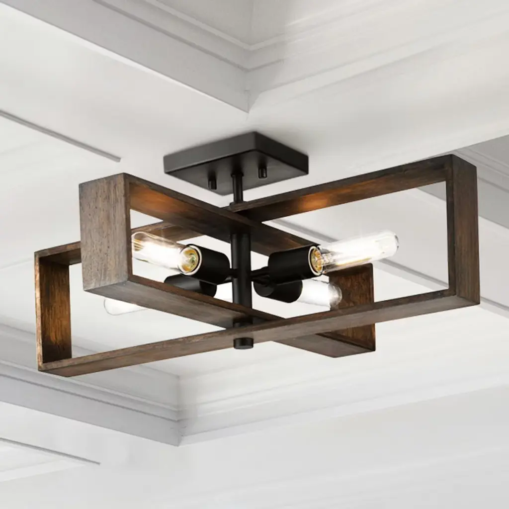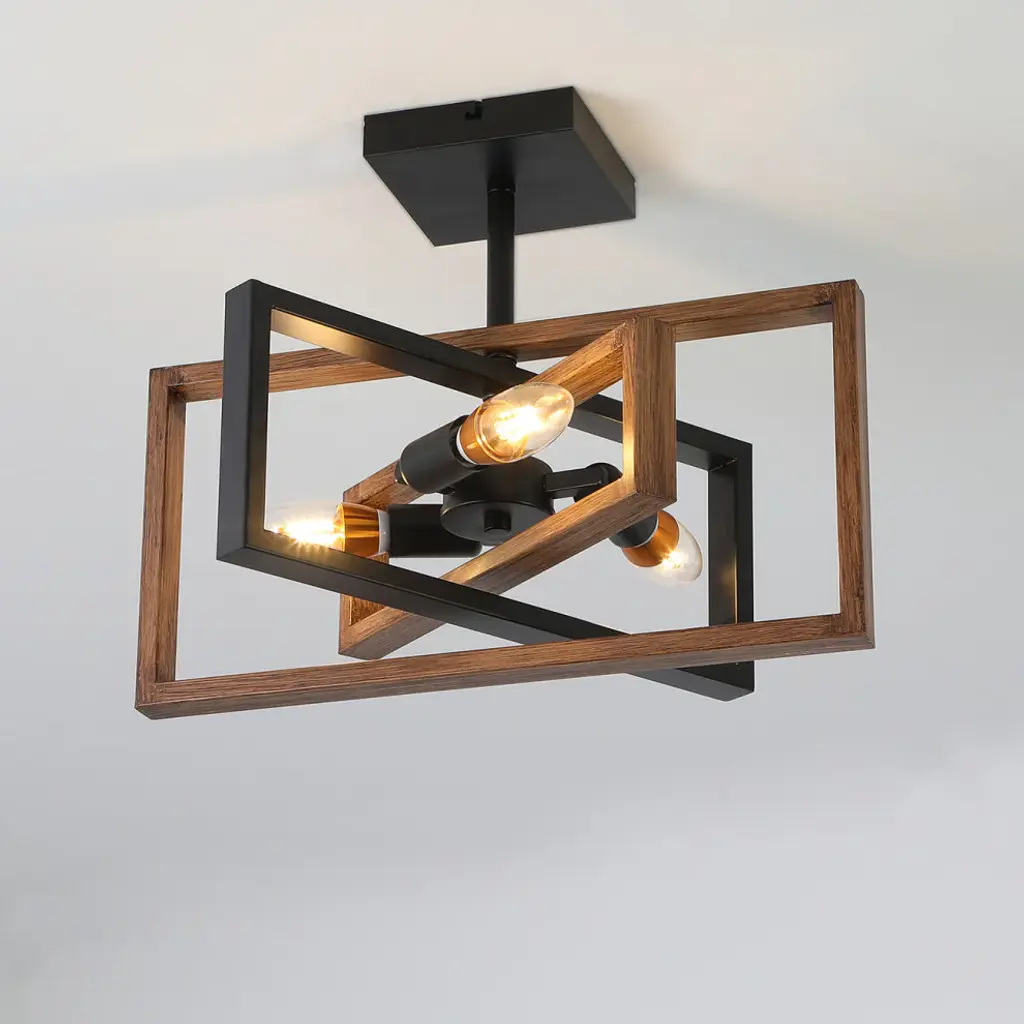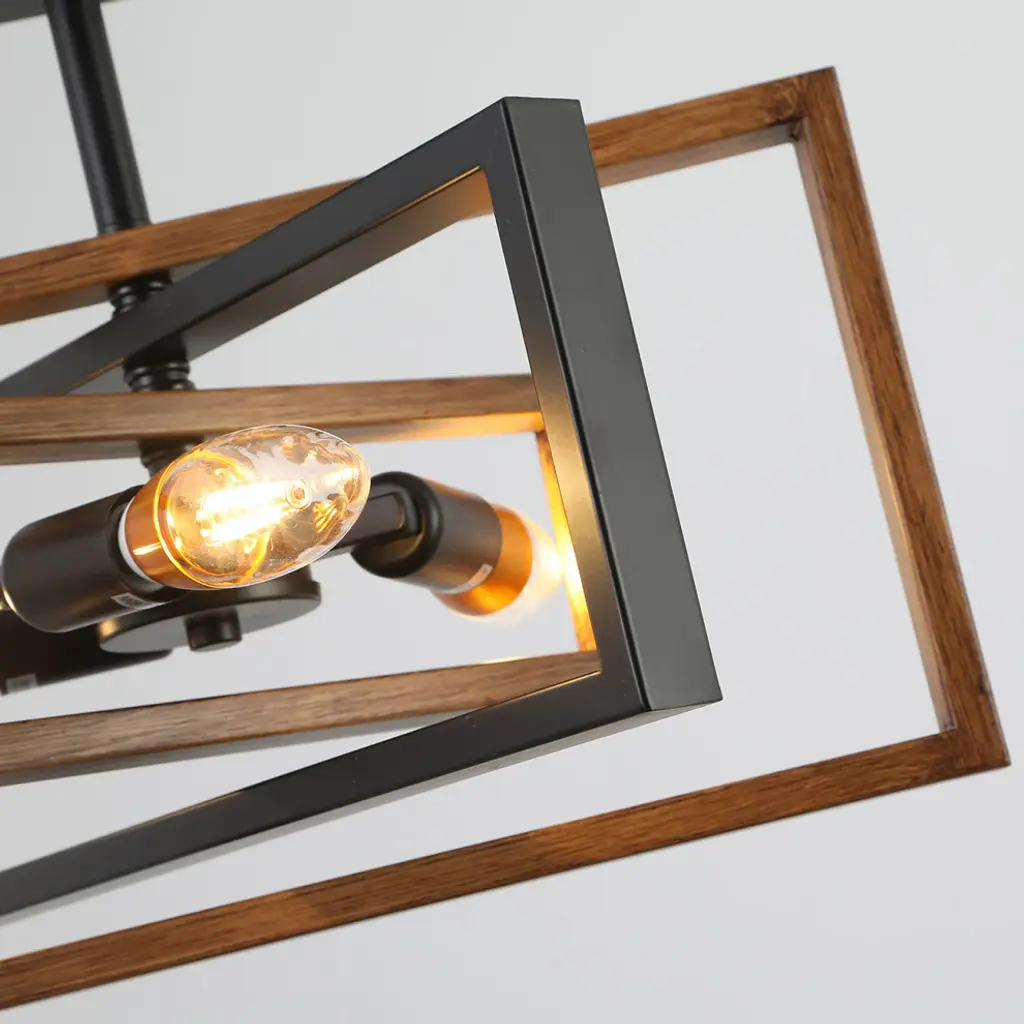 Geometric 3-Light Semi Flush Mount Rectangular Frame Ceiling Light, Brown