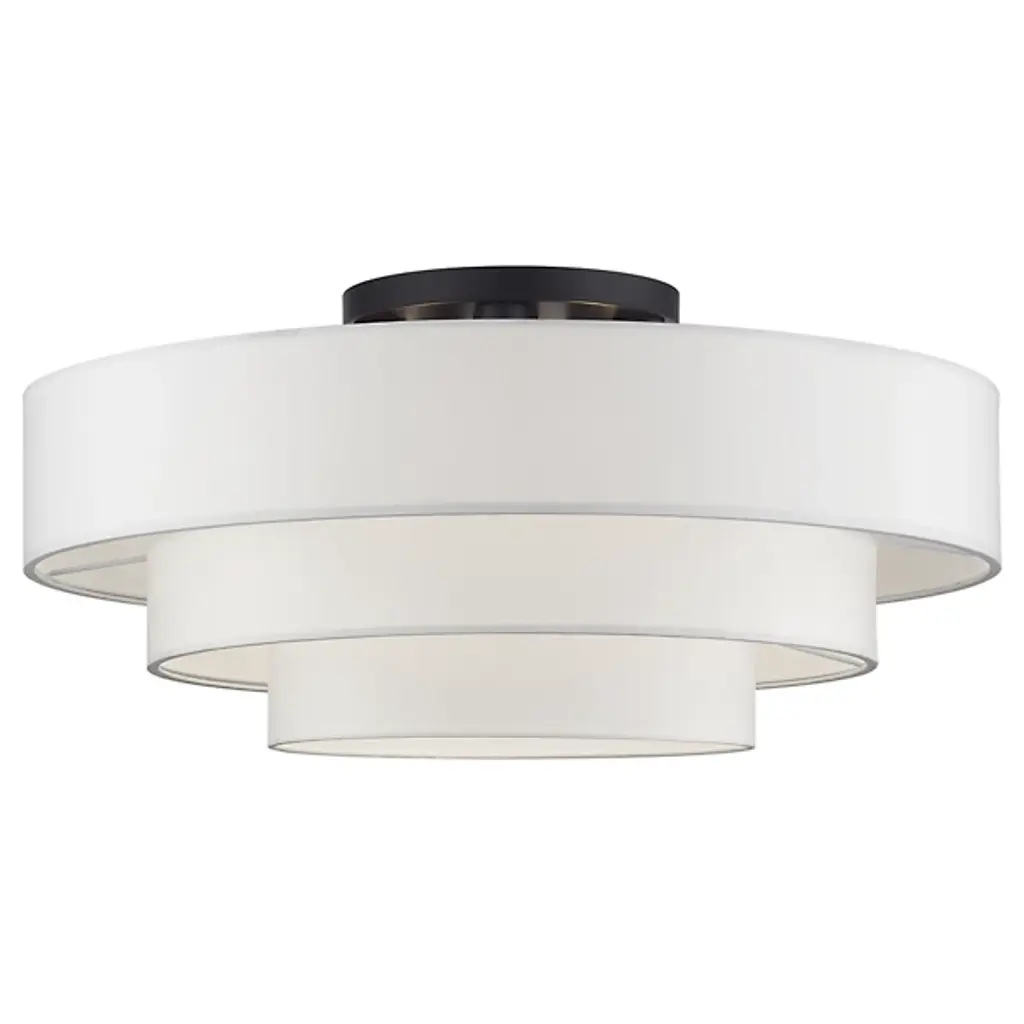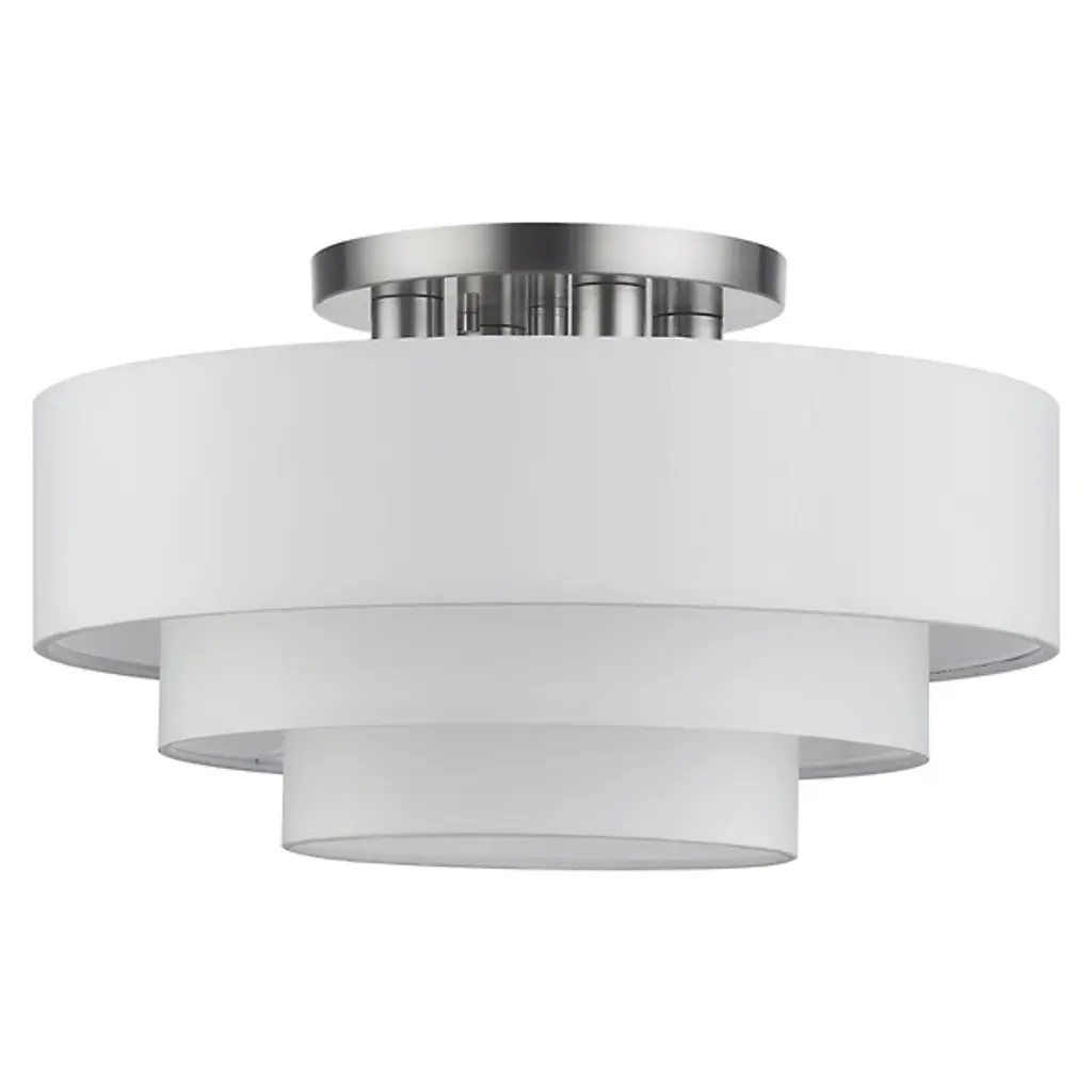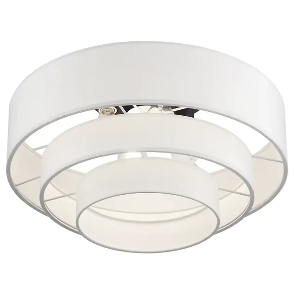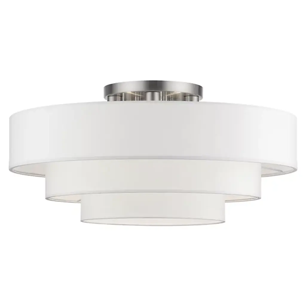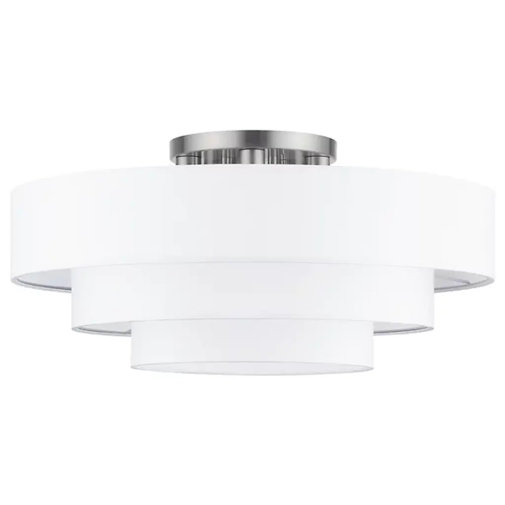 With its inspired and layered design, the Geraldine Large Semi-Flushmount from Alder & Ore adds a welcome transitional style to interiors. The fixture features a series of handcrafted off-white fabric hardback drum shades, which cast a diffused warm light that pairs beautifully with its sleek metal canopy and fittings. The stepped shade layering design brings a touch of modern vibrancy, sculptural and shadowed forms creating a lively ambiance. Its sophisticated look blends downlight with a warm glow cast through the shades, creating a retro character that elevates its surroundings.
