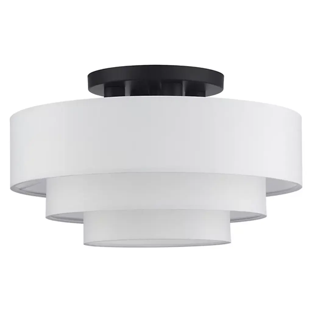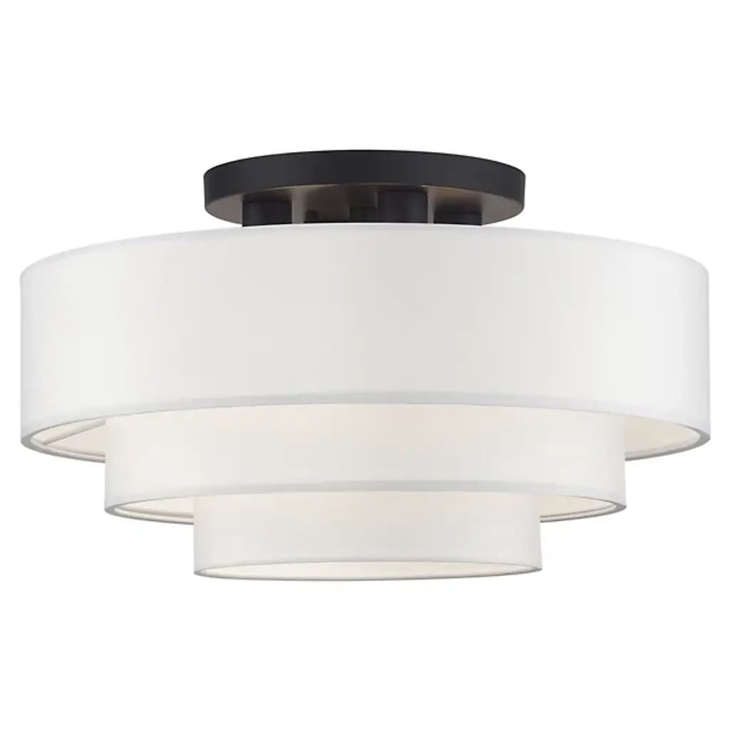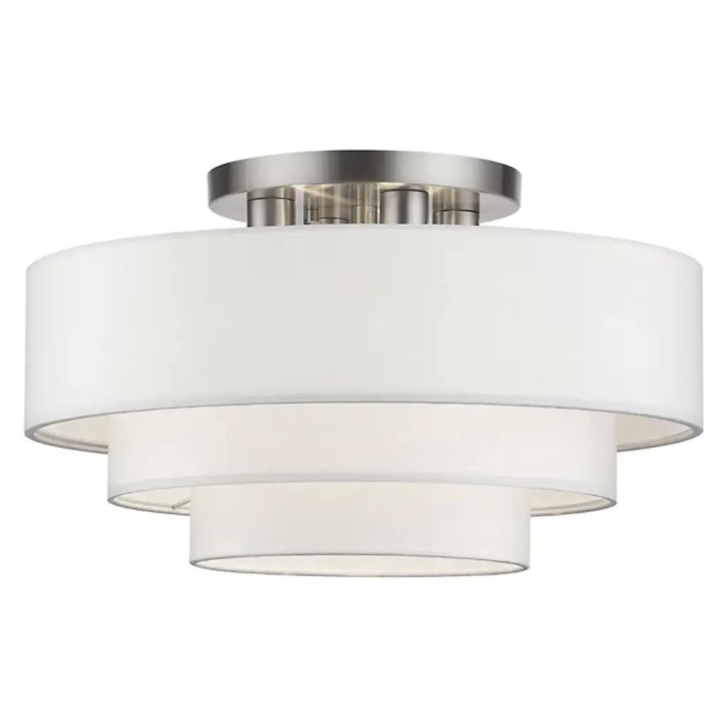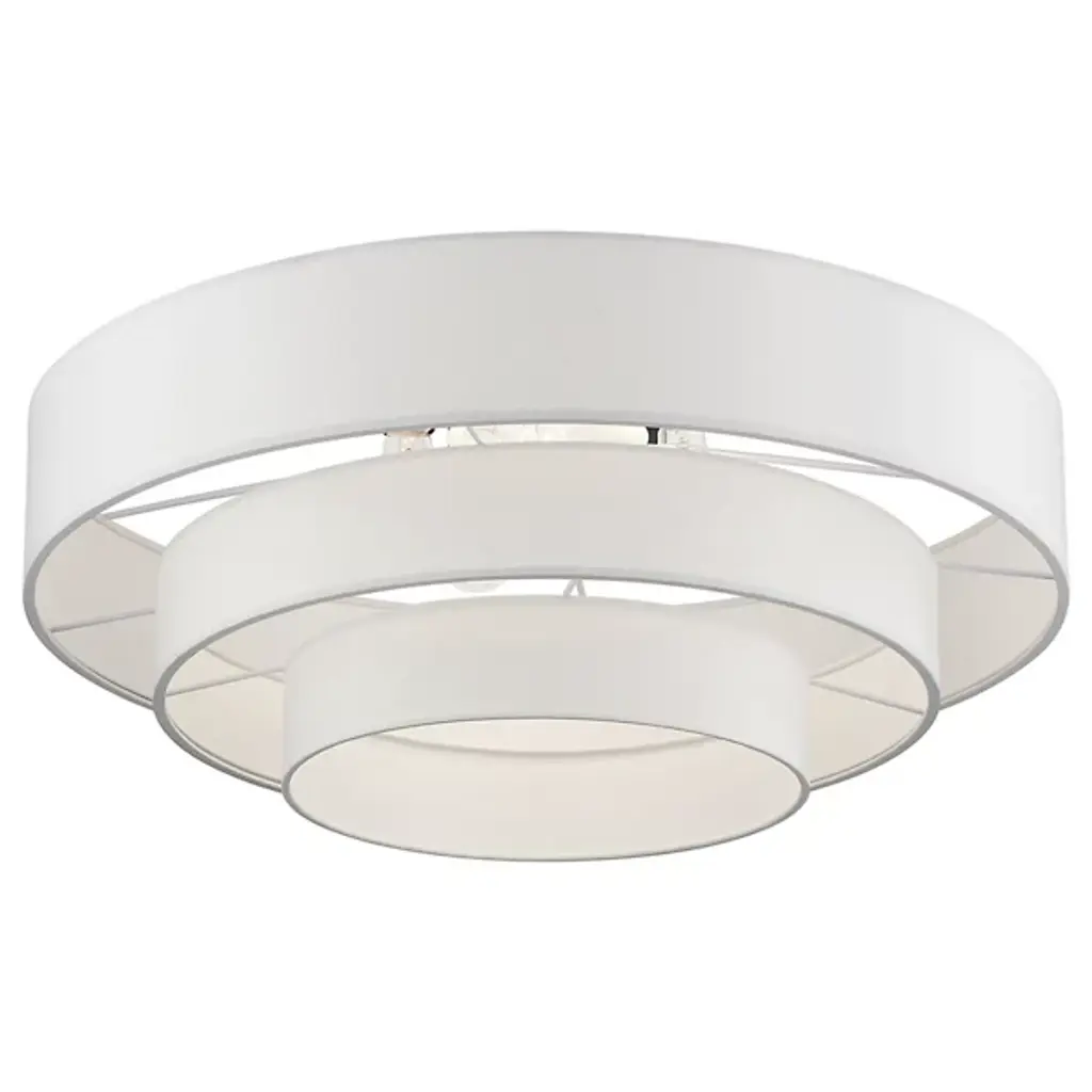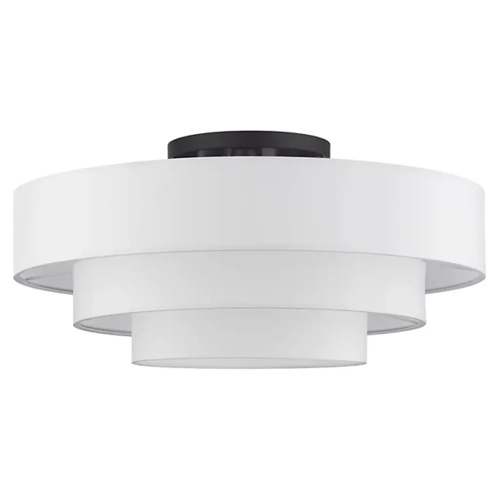 With its inspired and layered design, the Geraldine Large Semi-Flushmount from Alder & Ore adds a welcome transitional style to interiors. The fixture features a series of handcrafted off-white fabric hardback drum shades, which cast a diffused warm light that pairs beautifully with its sleek metal canopy and fittings. The stepped shade layering design brings a touch of modern vibrancy, sculptural and shadowed forms creating a lively ambiance. Its sophisticated look blends downlight with a warm glow cast through the shades, creating a retro character that elevates its surroundings.
