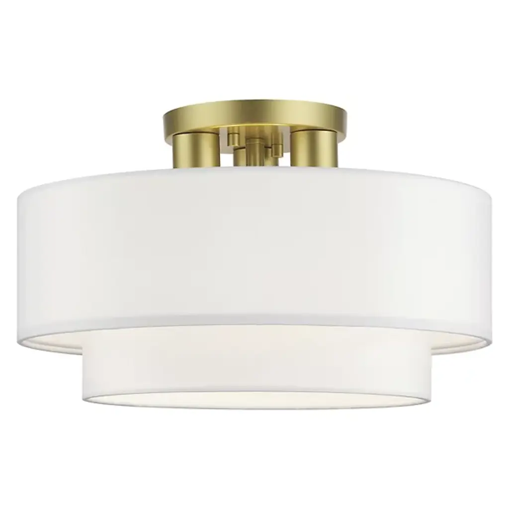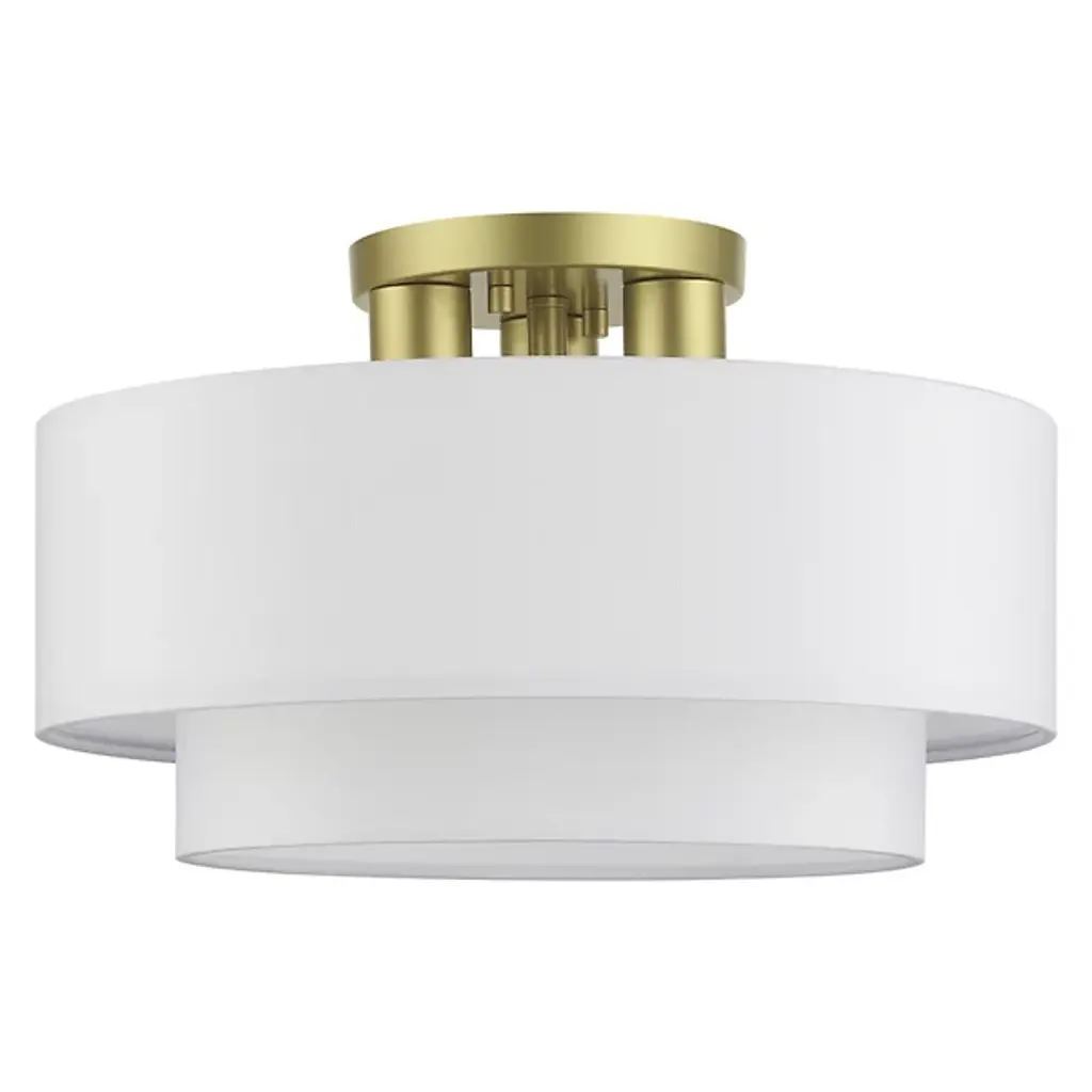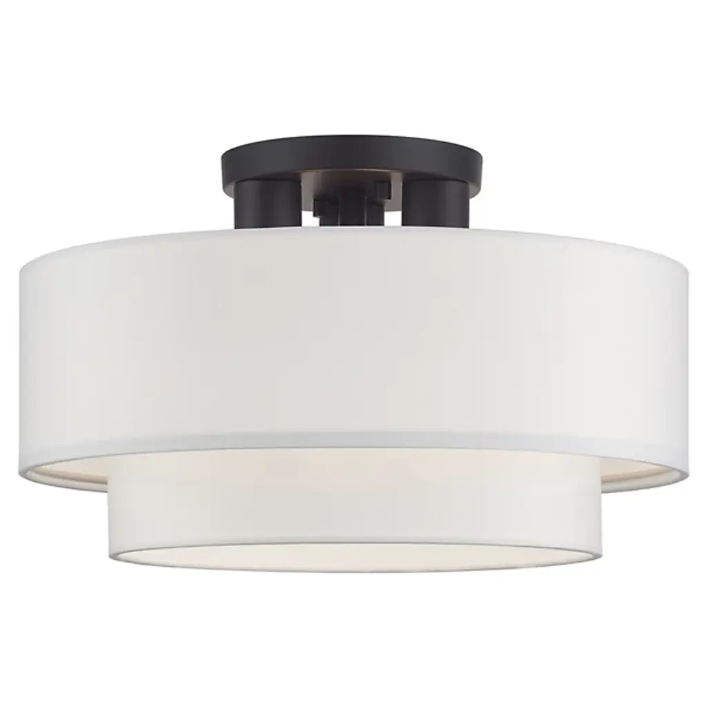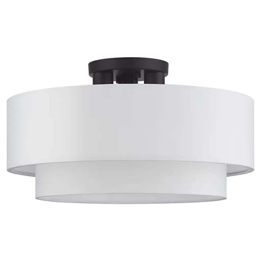 Elegant and luxurious, the Geraldine Semi-Flushmount from Alder & Ore exemplifies transitional style with its clean, crisp look. The handcrafted off-white fabric hardback double drum shades surround strong lamping and provide a diffused warm light, beautifully complementing the sleek metal suspension structure. The layered design adds modern appeal, making it great for living spaces. It elevates any space with its sophisticated design and mixes downlight with even ambiance for an unforgettable retro character.