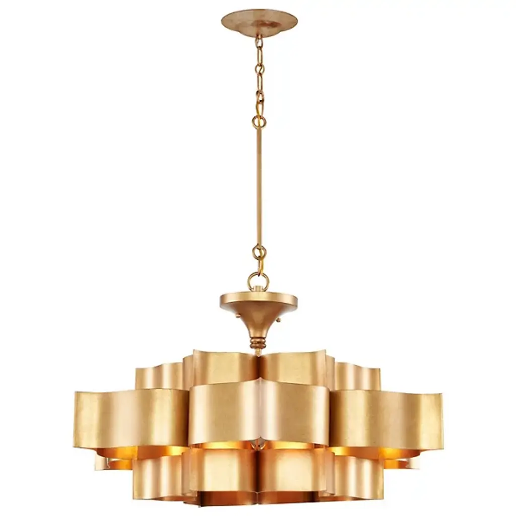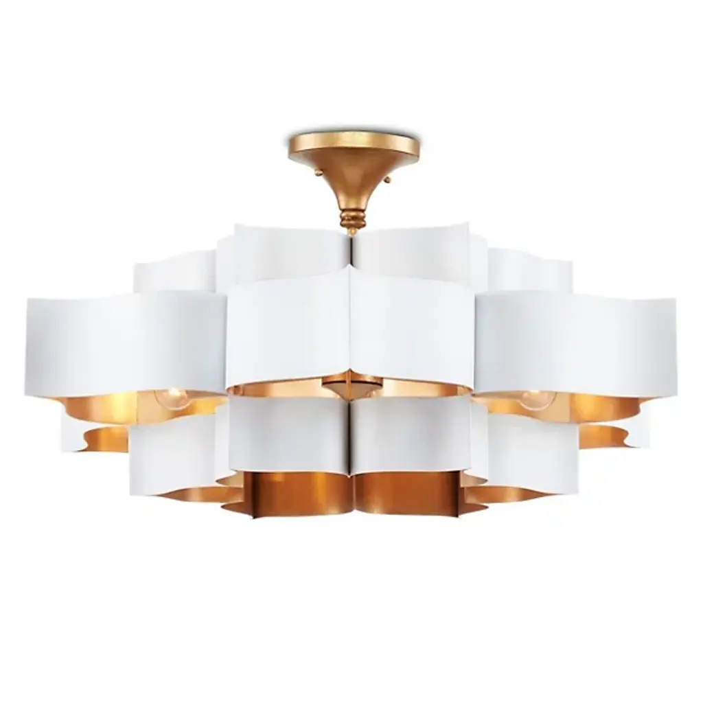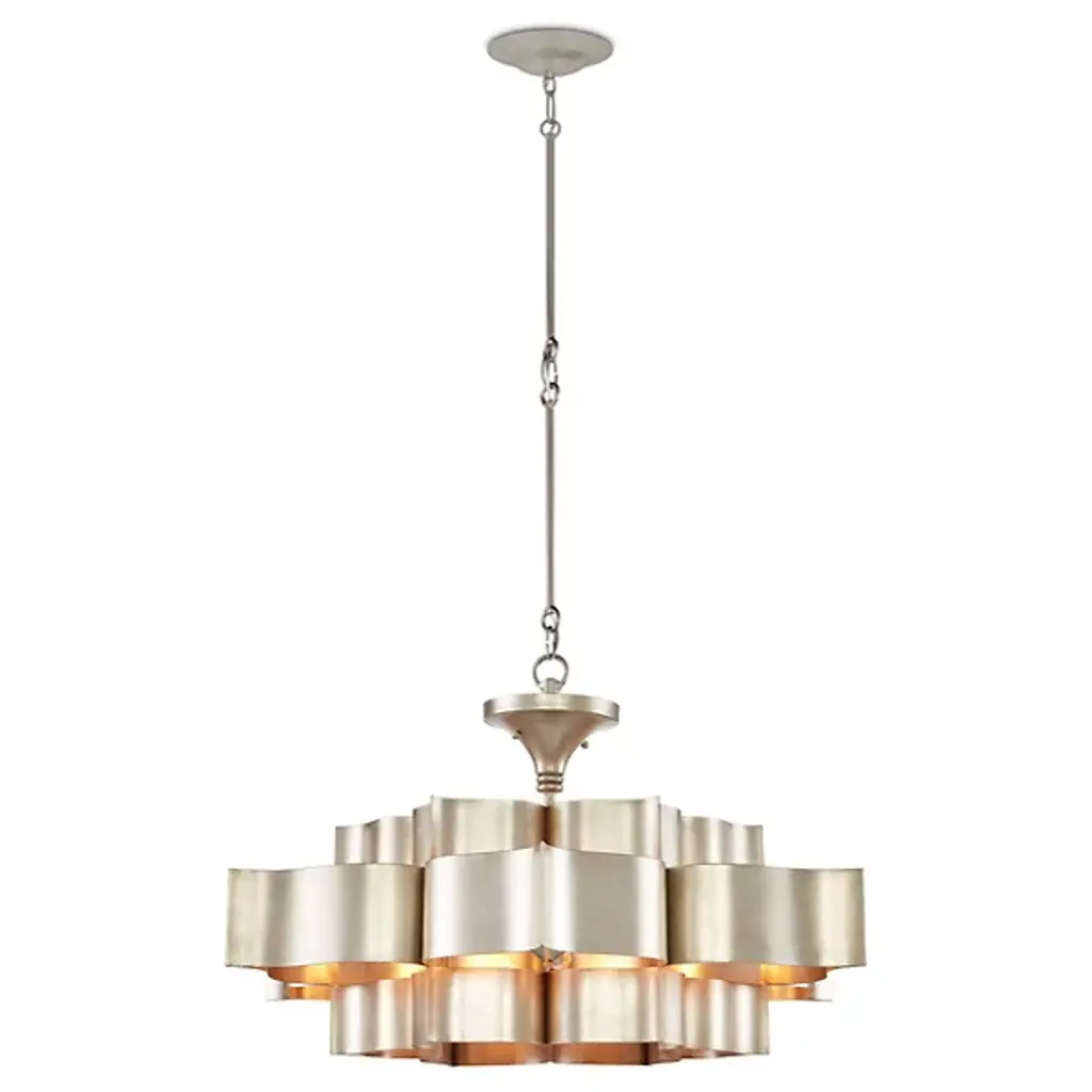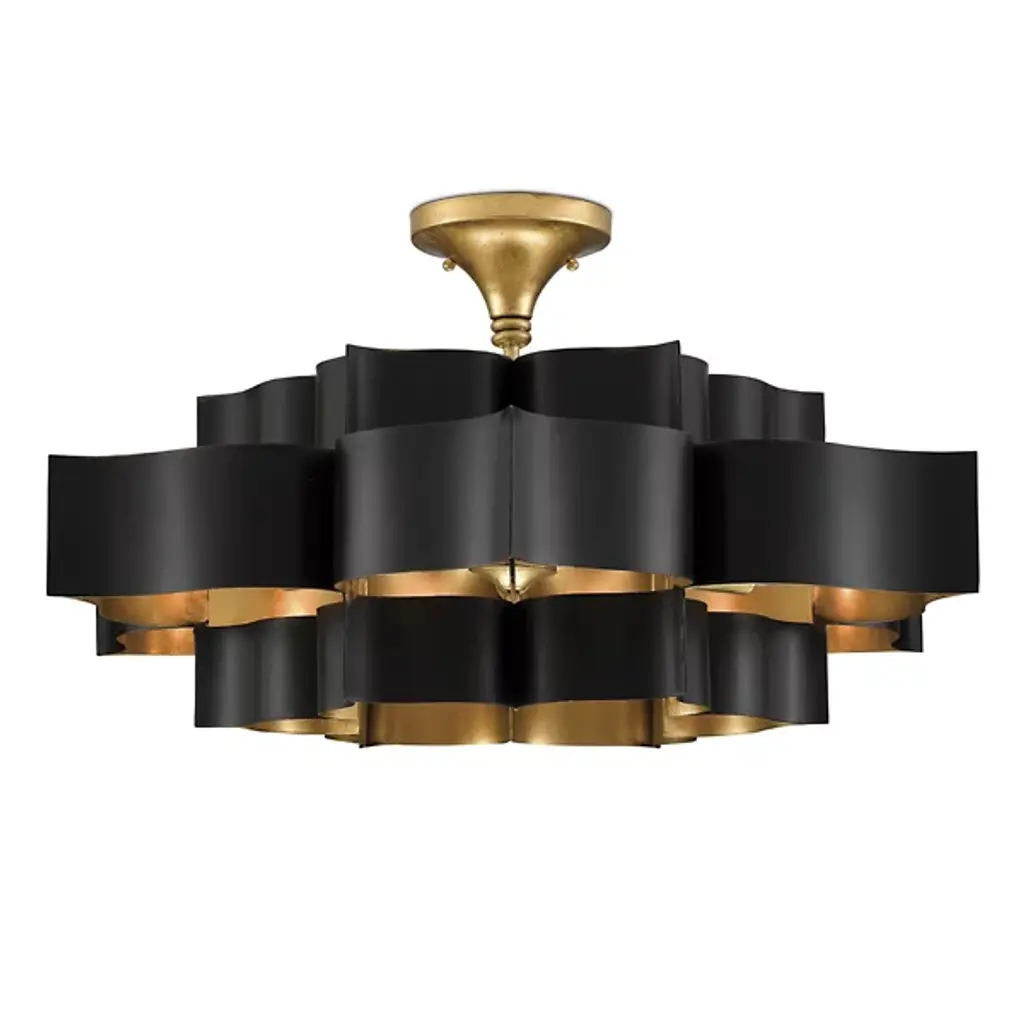 The Currey & Company Grand Lotus Semi-Flushmount/Chandelier is an ornate interpretation of the lotus blossom crafted from Wrought Iron and completed with a stunning finish. The effect of a blooming flower is achieved with a three-tier graphic silhouette of the cherished symbol, illuminating with exposed bulbs which adds a unique sheen to the shiny finish