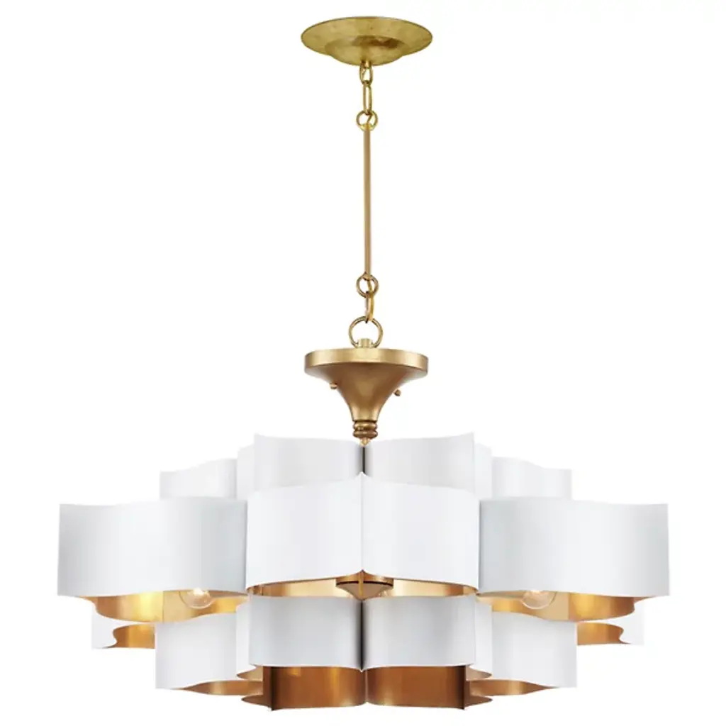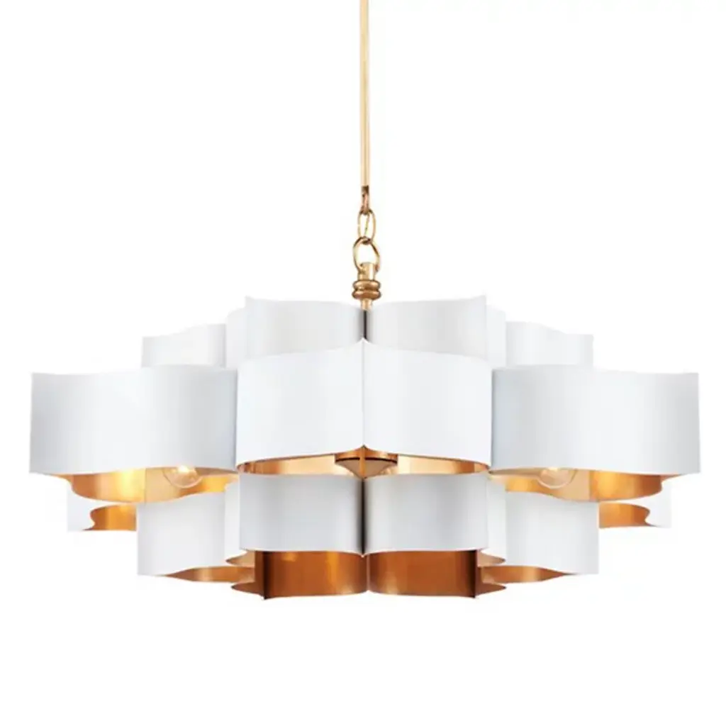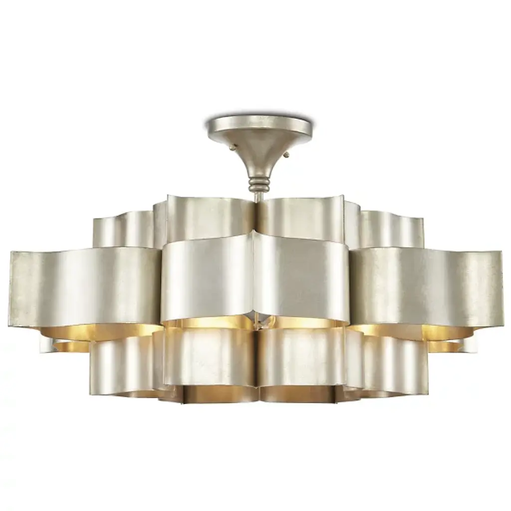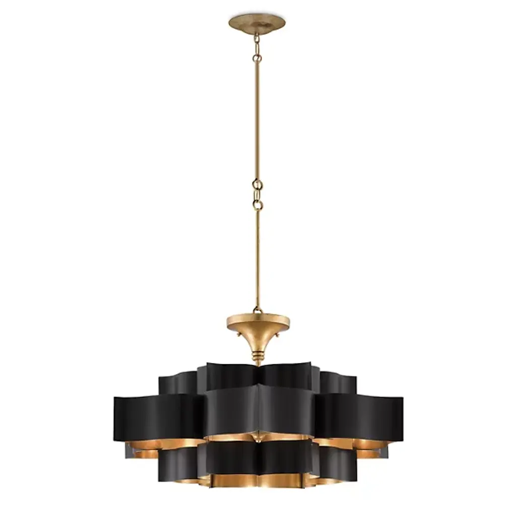 The Currey & Company Grand Lotus Semi-Flushmount/Chandelier is an ornate interpretation of the lotus blossom crafted from Wrought Iron and completed with a stunning finish. The effect of a blooming flower is achieved with a three-tier graphic silhouette of the cherished symbol, illuminating with exposed bulbs which adds a unique sheen to the shiny finish