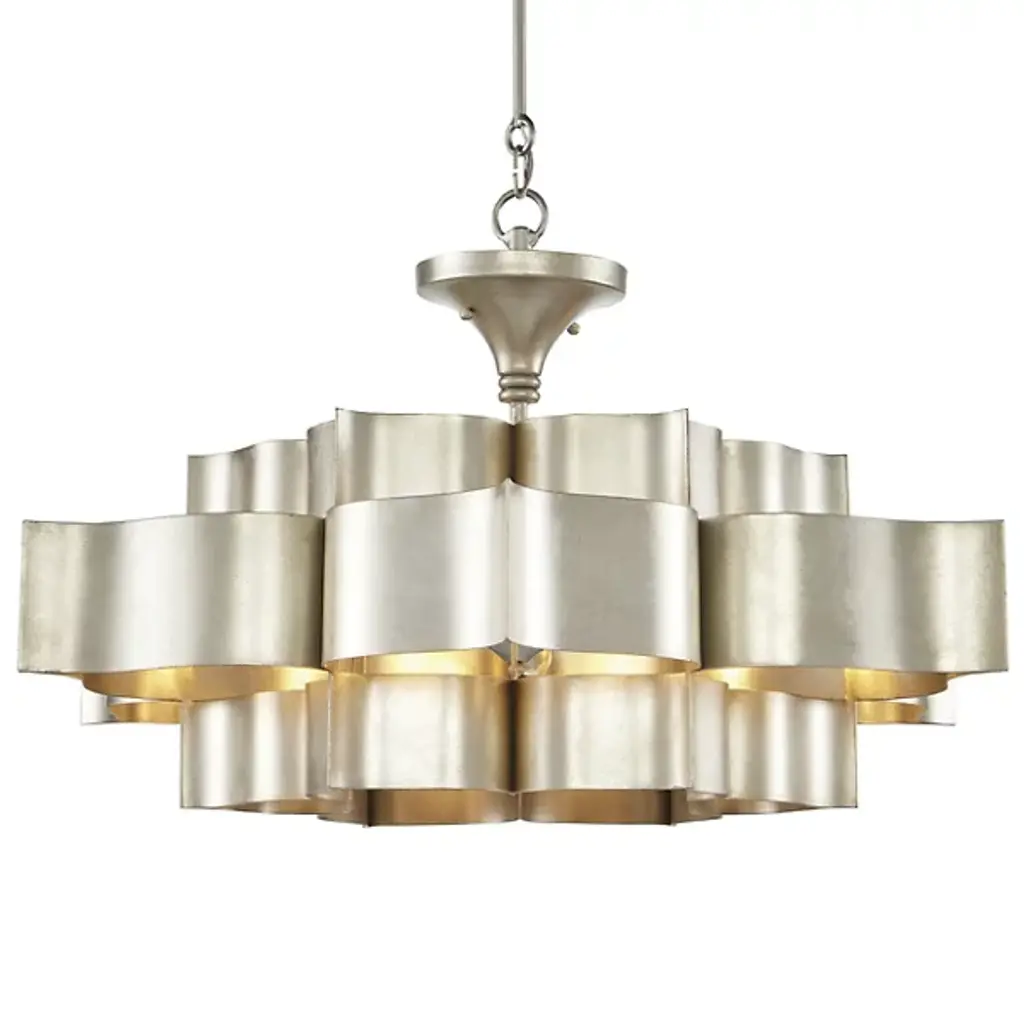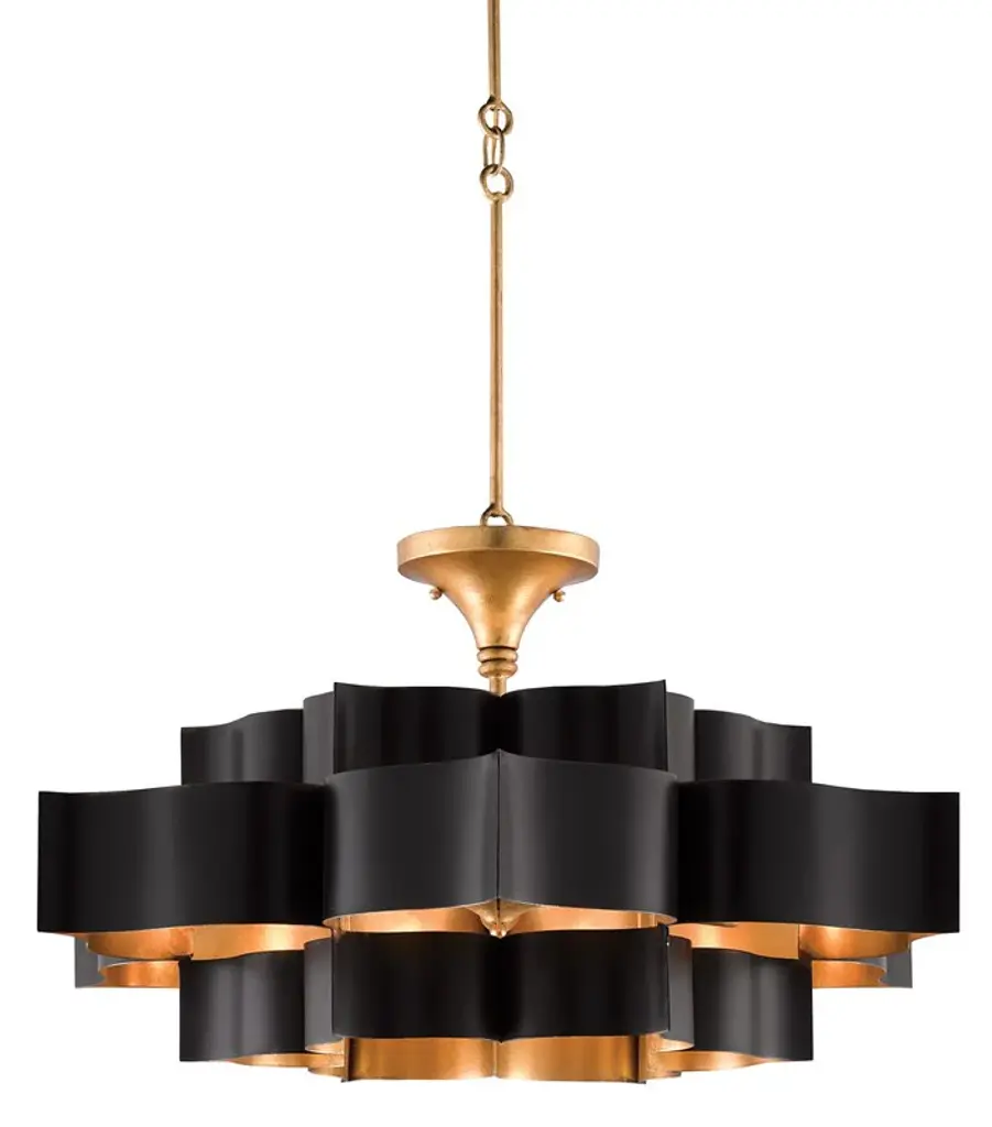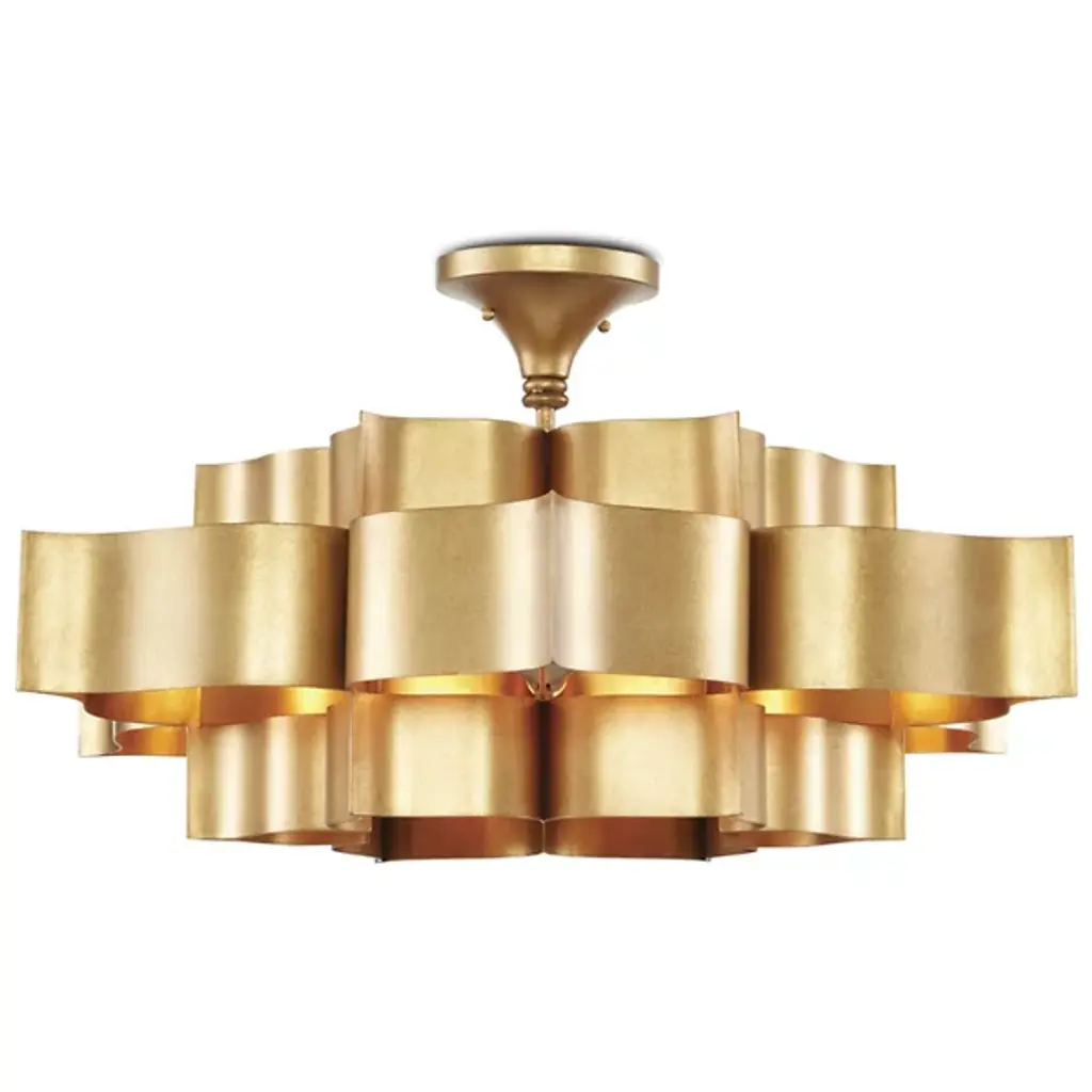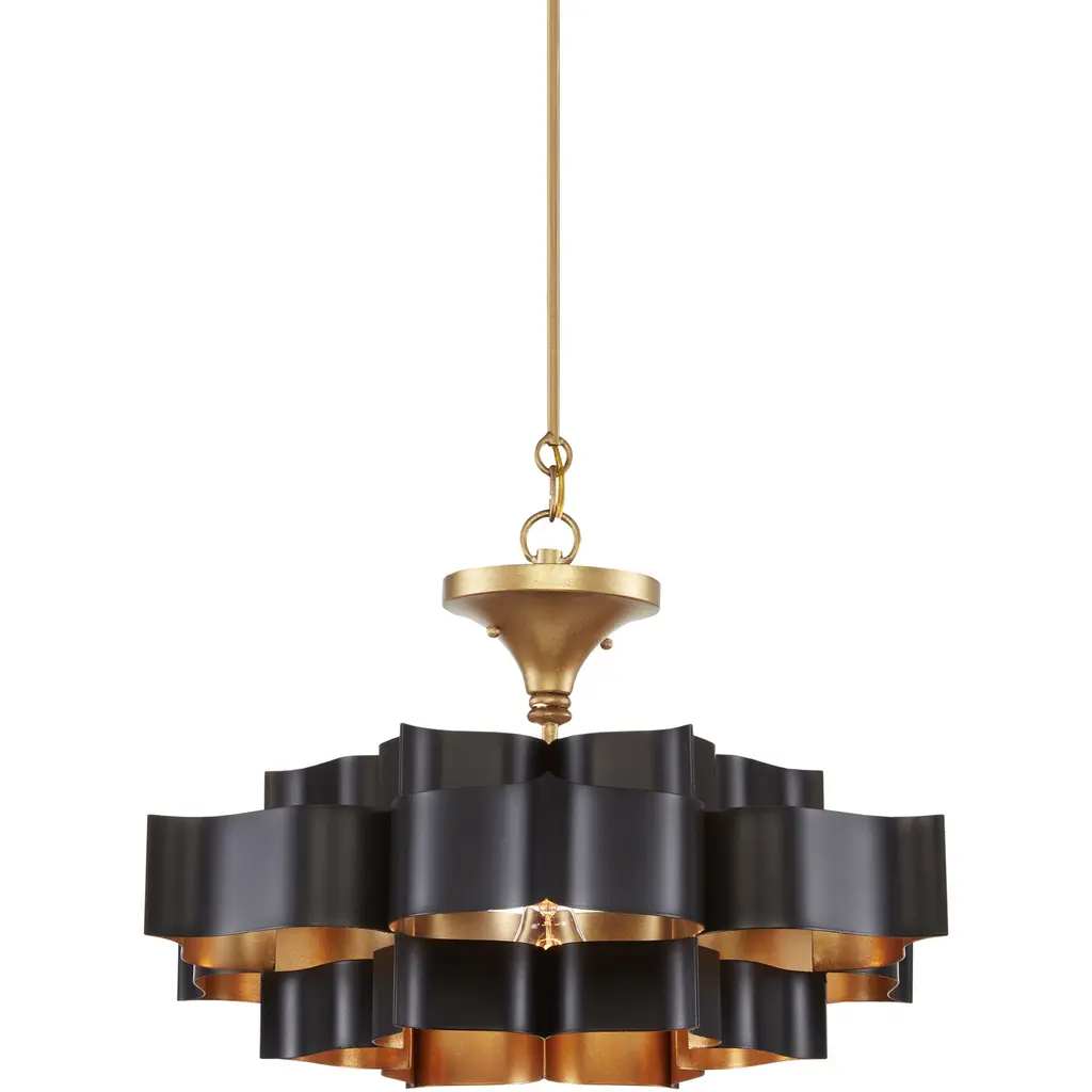 The Currey & Company Grand Lotus Semi-Flushmount/Chandelier is an ornate interpretation of the lotus blossom crafted from Wrought Iron and completed with a stunning finish. The effect of a blooming flower is achieved with a three-tier graphic silhouette of the cherished symbol, illuminating with exposed bulbs which adds a unique sheen to the shiny finish