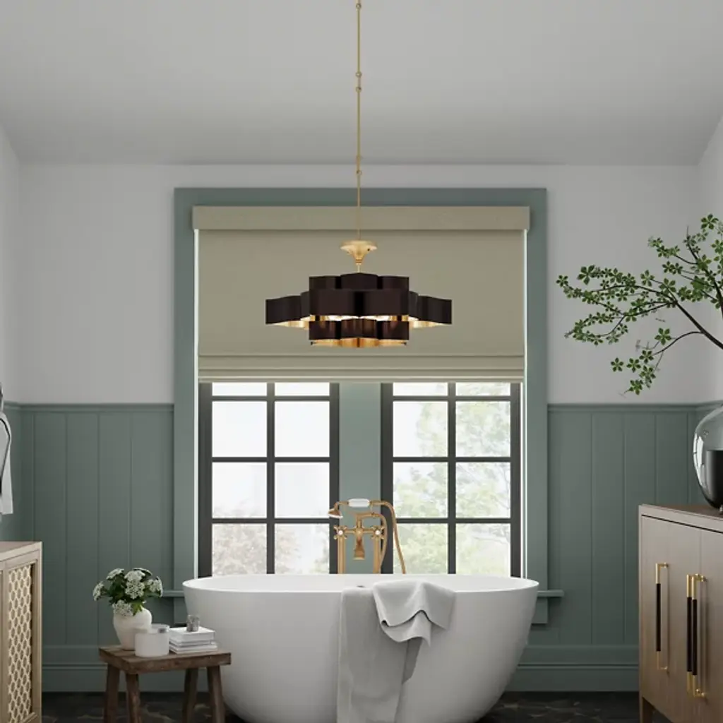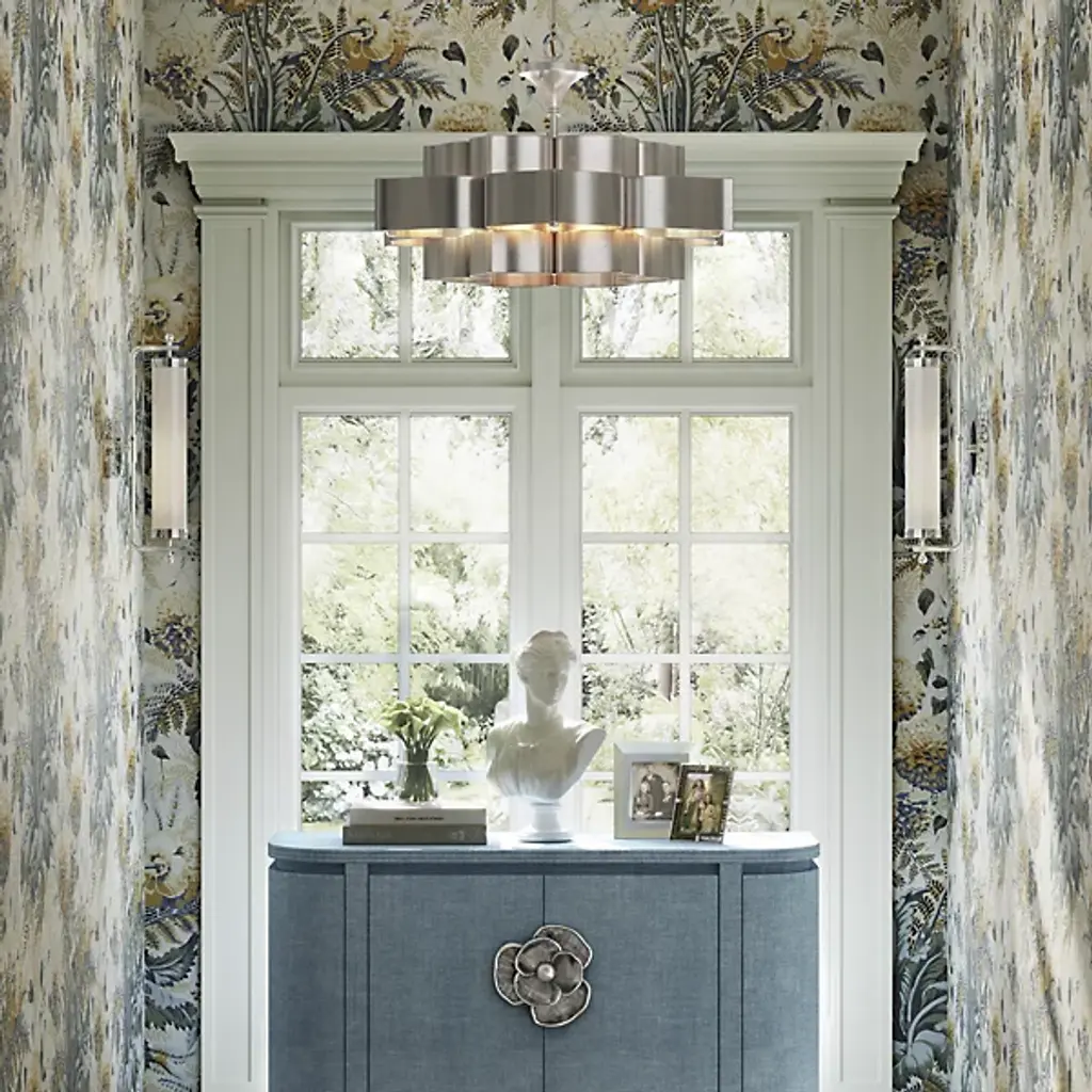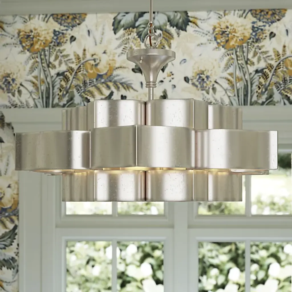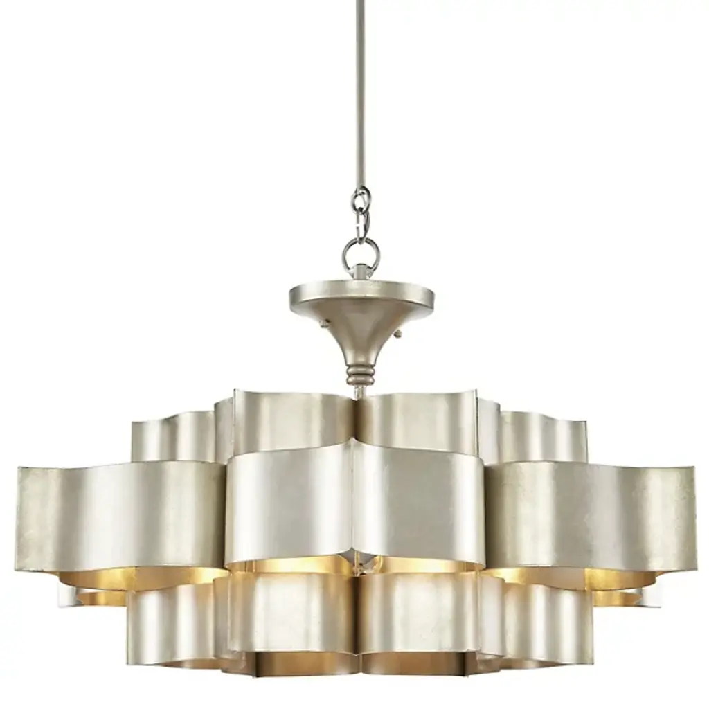 The Currey & Company Grand Lotus Semi-Flushmount/Chandelier is an ornate interpretation of the lotus blossom crafted from Wrought Iron and completed with a stunning finish. The effect of a blooming flower is achieved with a three-tier graphic silhouette of the cherished symbol, illuminating with exposed bulbs which adds a unique sheen to the shiny finish