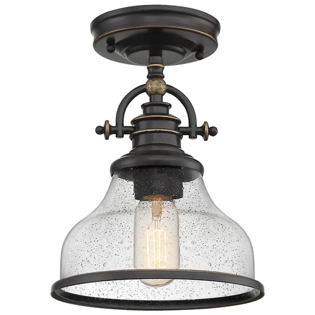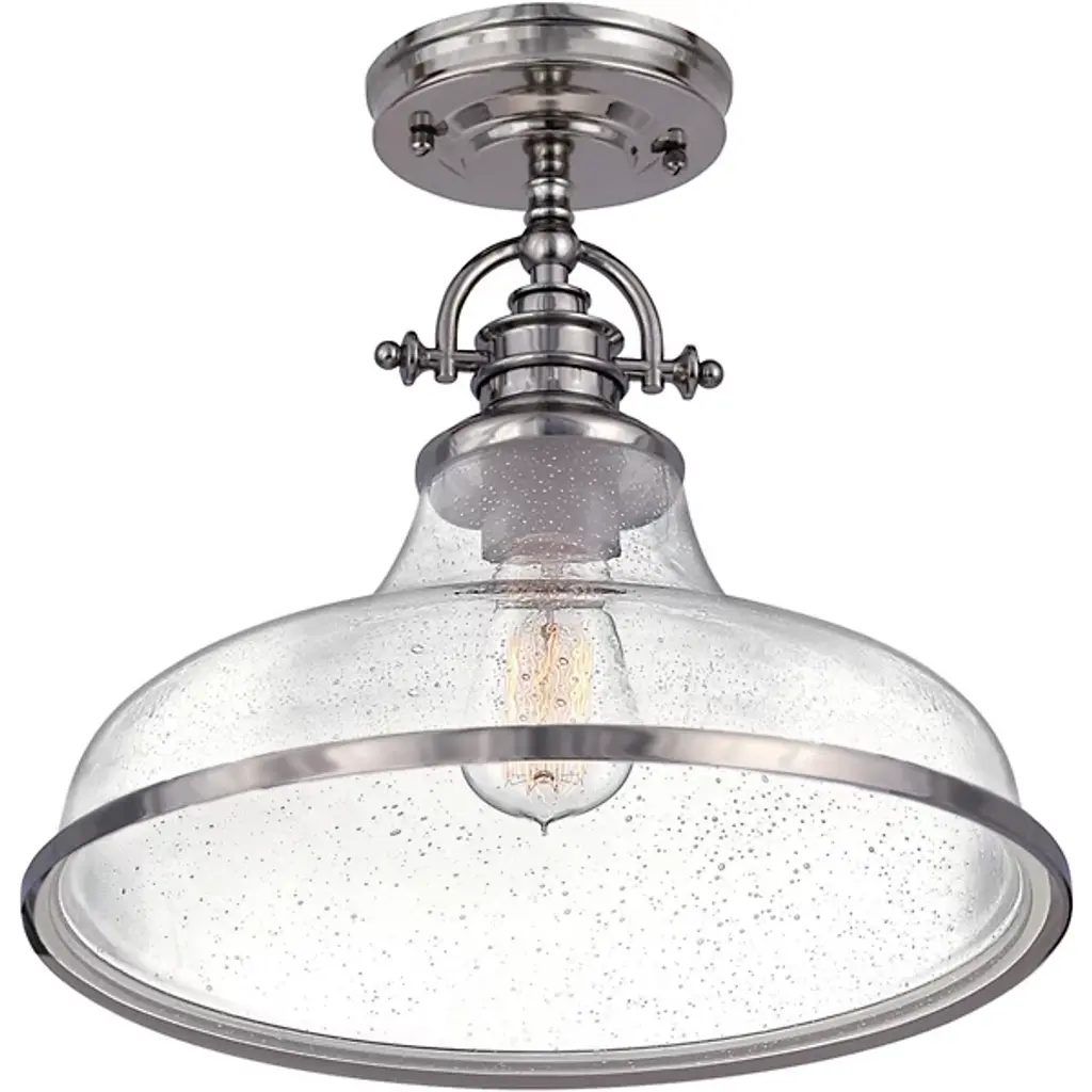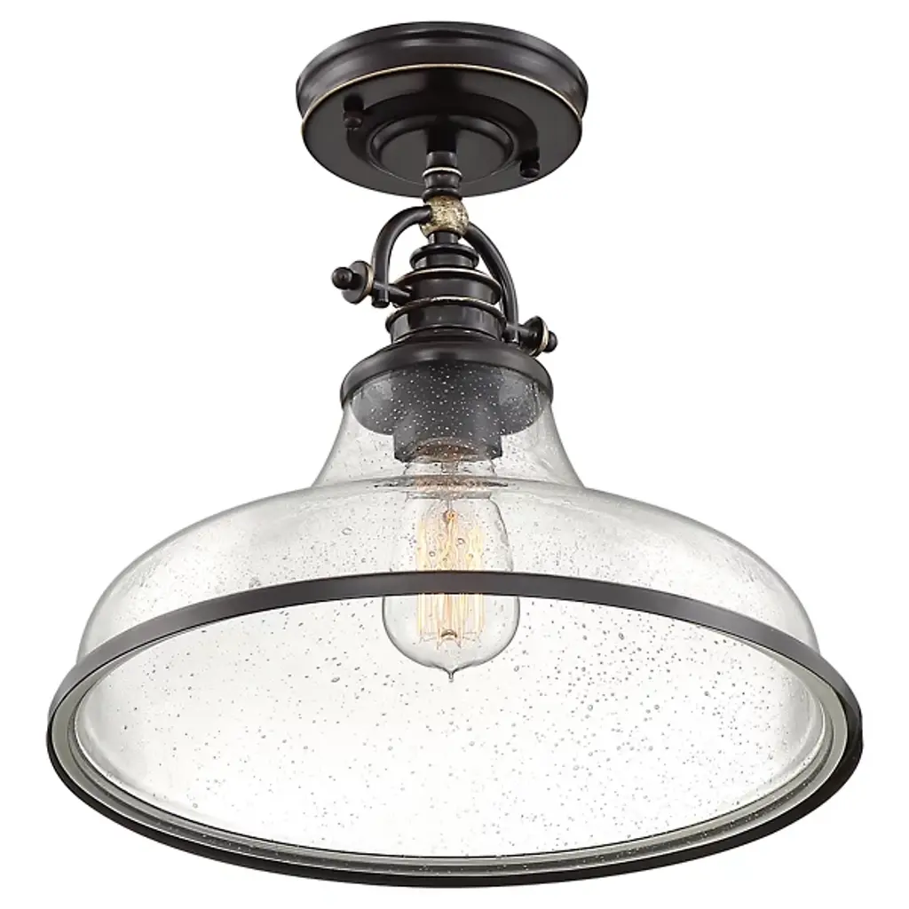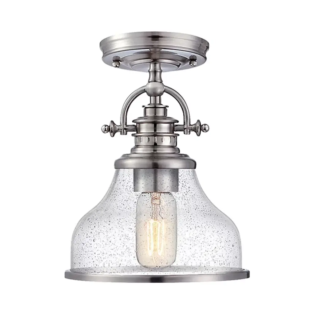 The Grant Semi Flushmount by Quoizel draws inspiration from vintage fixtures while offering a transitional twist for the modern home. A stepped steel canopy drops a segmented socket base suited with visible fasteners for an industrial element. A clear seeded glass shade flares outward widely, covering a single incandescent bulb inside. The glass is finished with a steel ring, offering a bold touch that modernizes the piece and adds contrast.