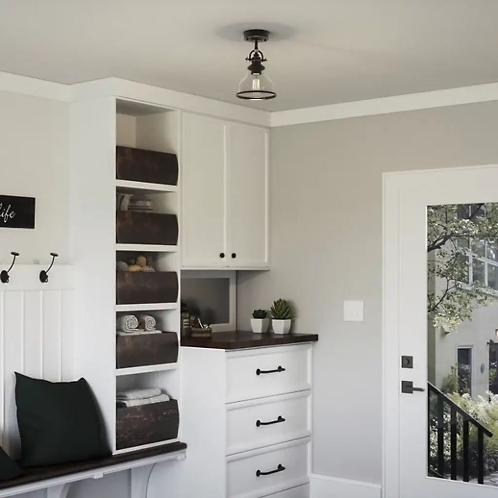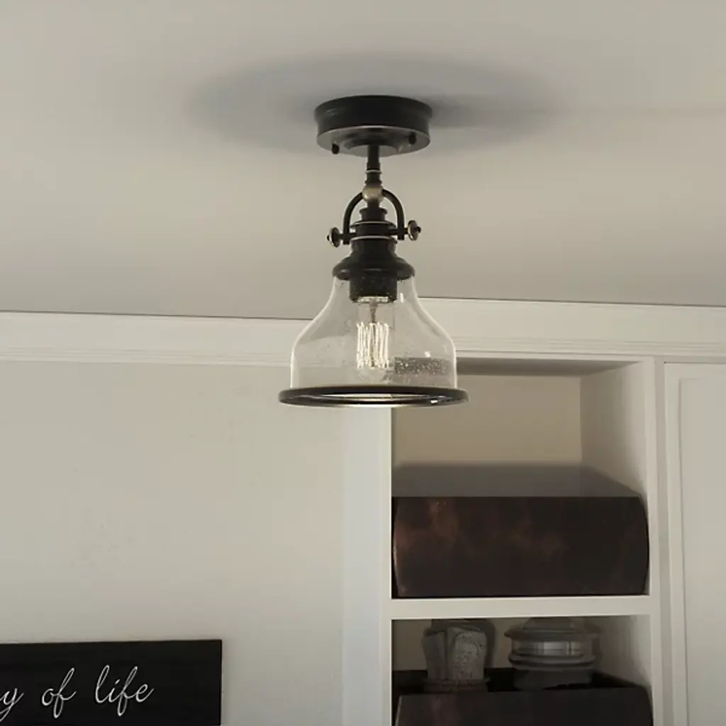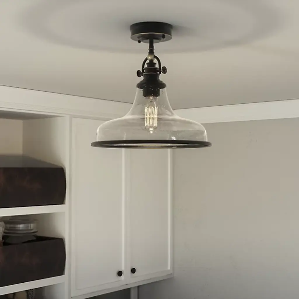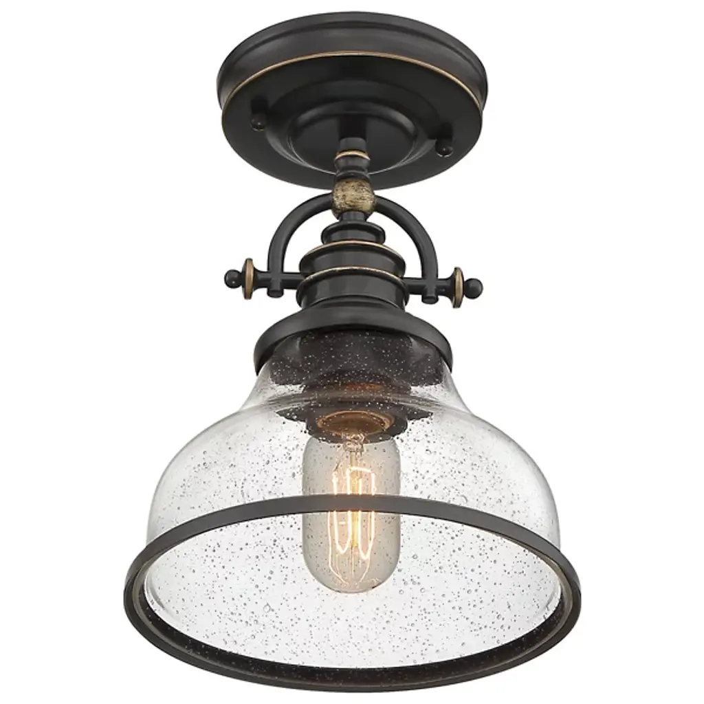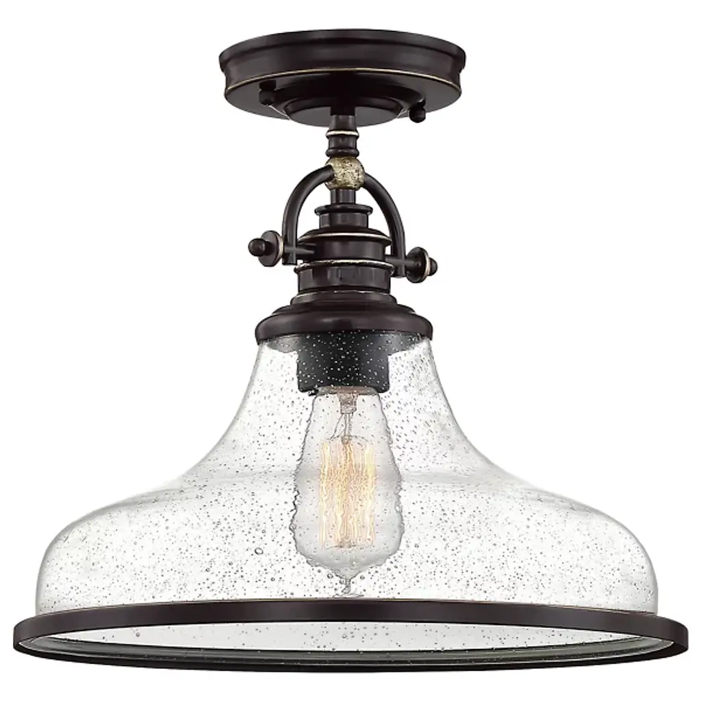 The Grant Semi Flushmount by Quoizel draws inspiration from vintage fixtures while offering a transitional twist for the modern home. A stepped steel canopy drops a segmented socket base suited with visible fasteners for an industrial element. A clear seeded glass shade flares outward widely, covering a single incandescent bulb inside. The glass is finished with a steel ring, offering a bold touch that modernizes the piece and adds contrast.