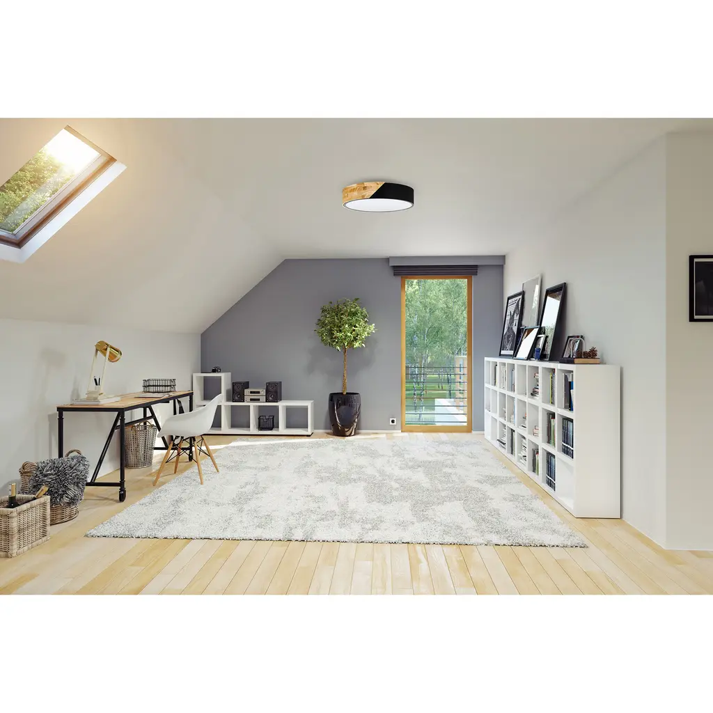The Grimaldino ceiling light by Eglo offers a decorative shade made of black fabric and natural wood and a white plastic diffuser. With its special design this ceiling light offers a highlight in any room.