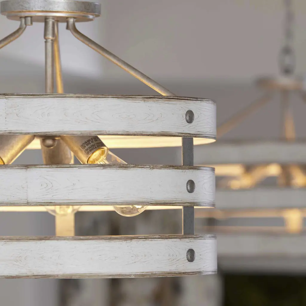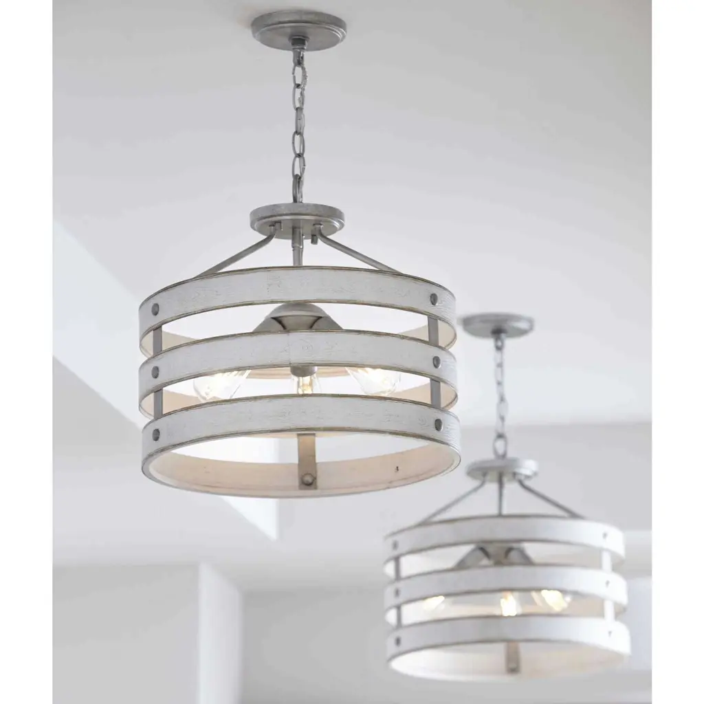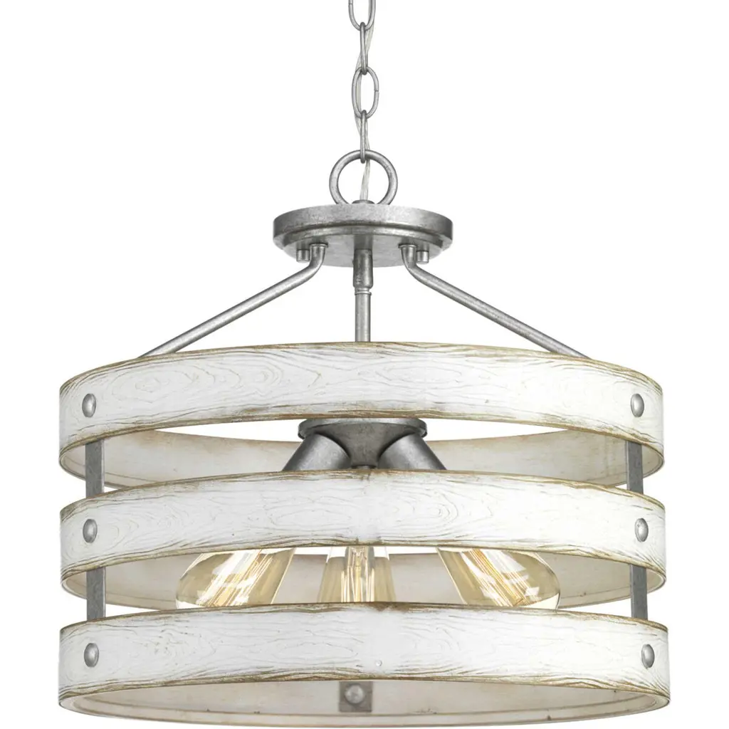 Three circular bands wrap together to create an open design for Gulliver's 17" three-light semi-flush convertible. Dual toned frame color combinations of Galvanized with antique white accents. A hand painted wood grained texture complements Rustic and Modern Farmhouse home decor, as well as Urban Industrial and Coastal interior settings.