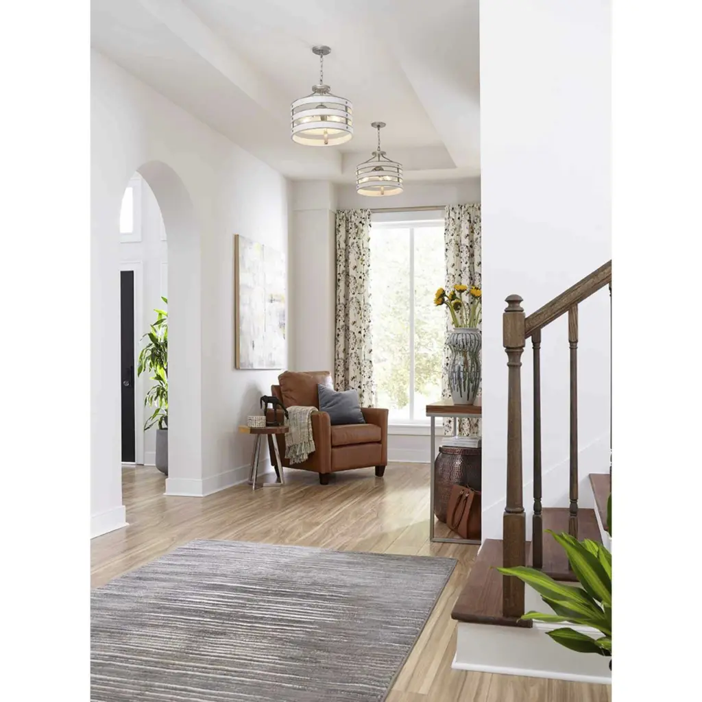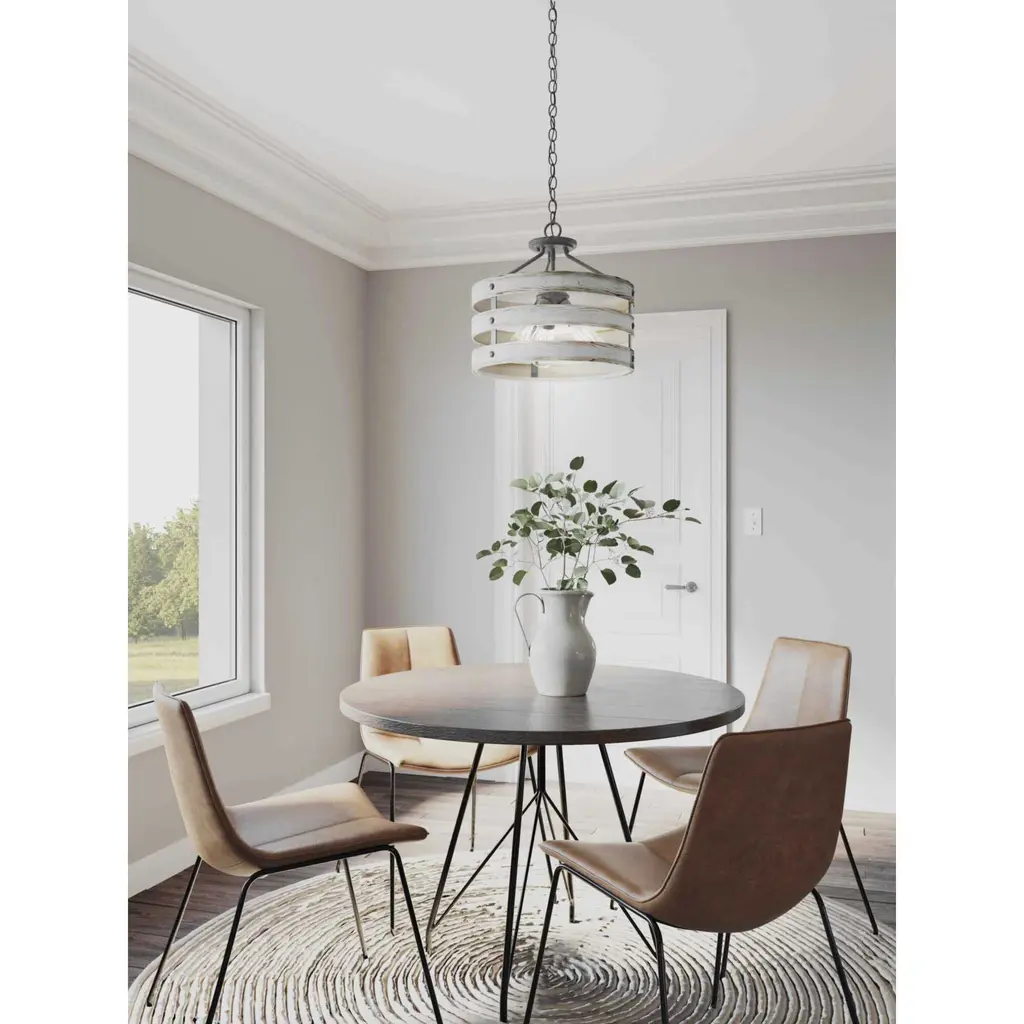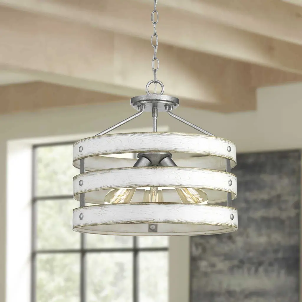 Three circular bands wrap together to create an open design for Gulliver's 17" three-light semi-flush convertible. Dual toned frame color combinations of Galvanized with antique white accents. A hand painted wood grained texture complements Rustic and Modern Farmhouse home decor, as well as Urban Industrial and Coastal interior settings.