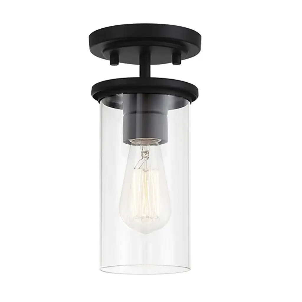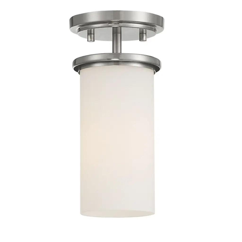 The Haisley Pendant / Semi-Flushmount by Minka-Lavery is a simply composed, contemporary addition to spaces. With a uniform finish, a round canopy and single stem support a circular top, creating clean lines as they hold up a cylindrical glass shade. Evenly filtering light throughout its form and directing a layer of illumination down onto surroundings, this pendant brings a bright, practical touch to its environment while effortlessly complementing a range of design and décor styles.
