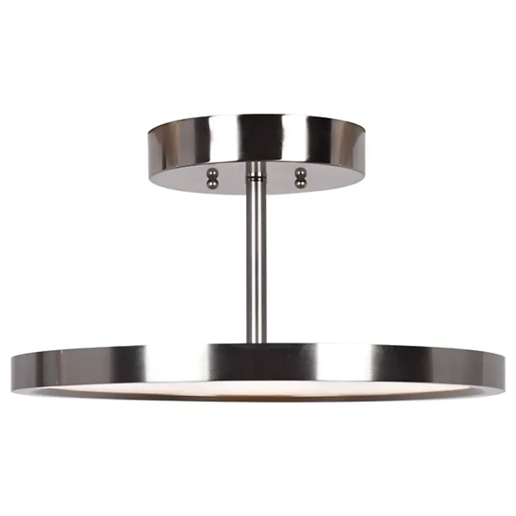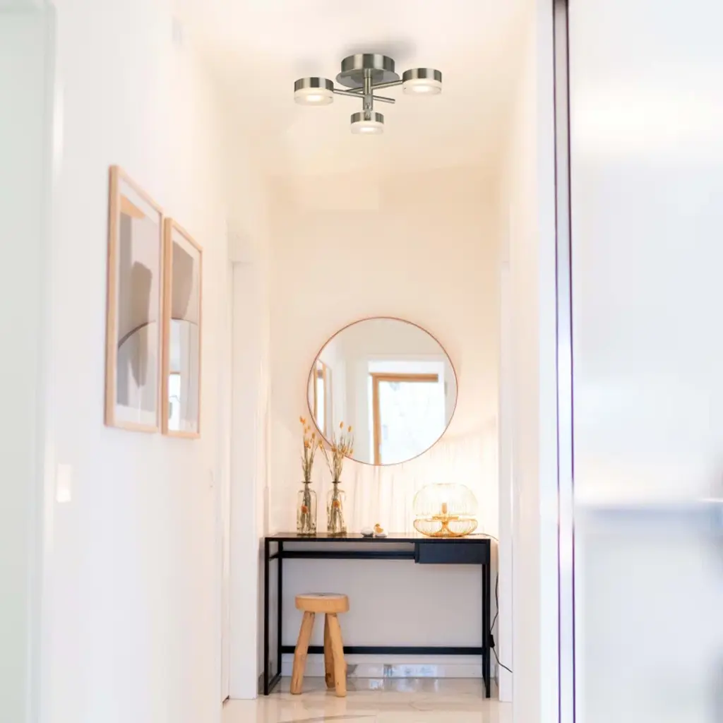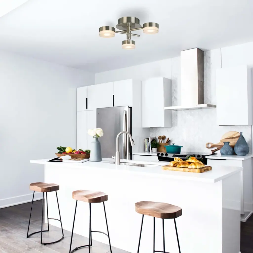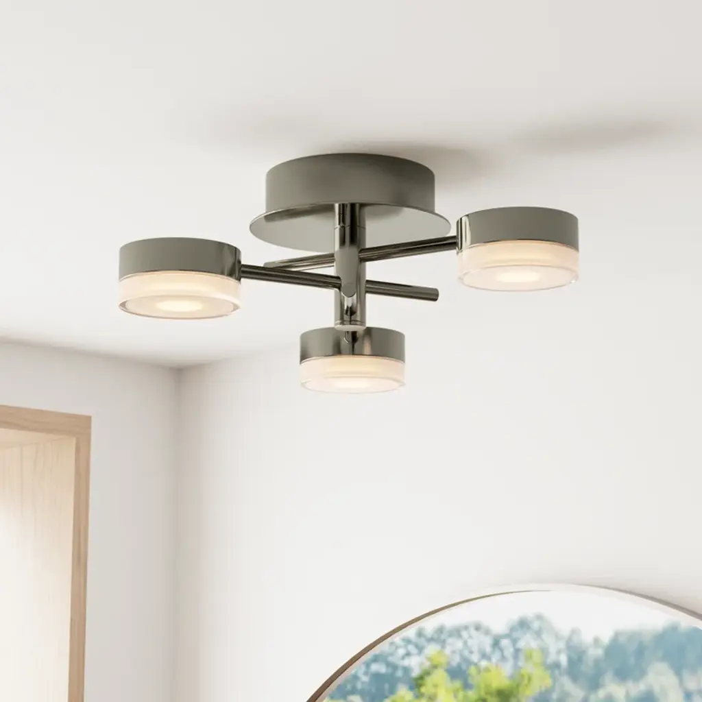 A streamlined take on space-age style, this semi-flush mount light balances three cylindrical shades on rod-like arms which radiate from a central downrod. It’s built from sturdy steel in a brushed nickel finish, with white shades to diffuse the glow from integrated – and dimmable – LED bulbs.