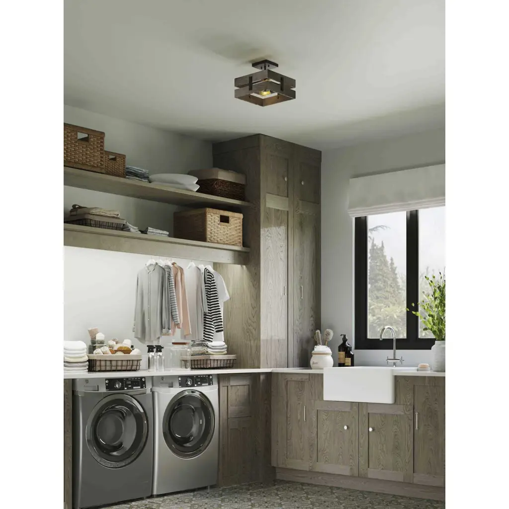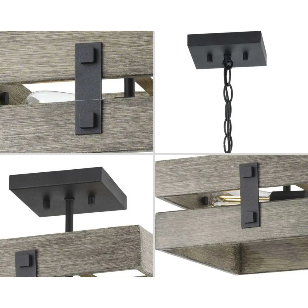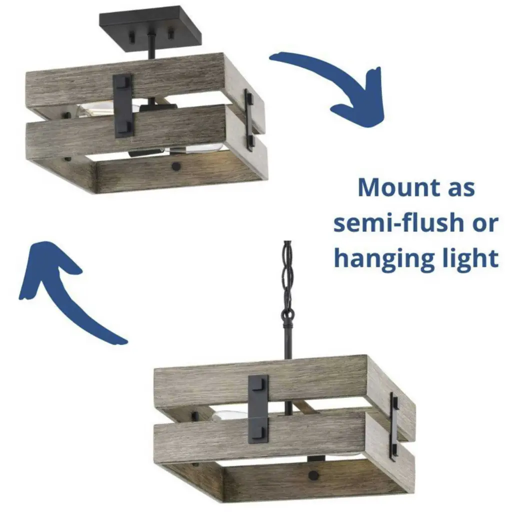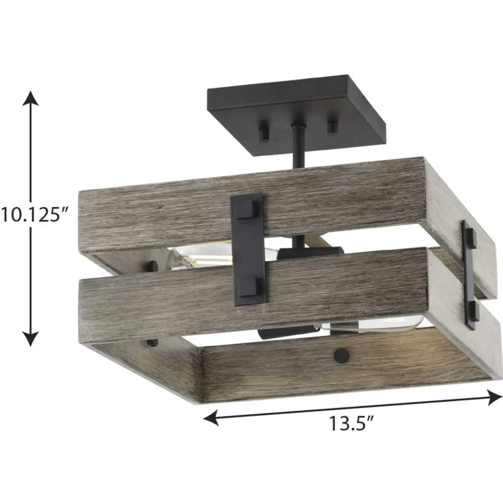 Create an extension of your personality and lifestyle with the rustic charm of this semi-flush mount. Country character is the cornerstone of this light fixture that features a crate-like frame composed of faux painted aged oak. Black barn-inspired metal details complete this must-have farmhouse design.