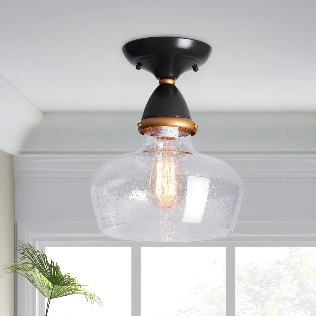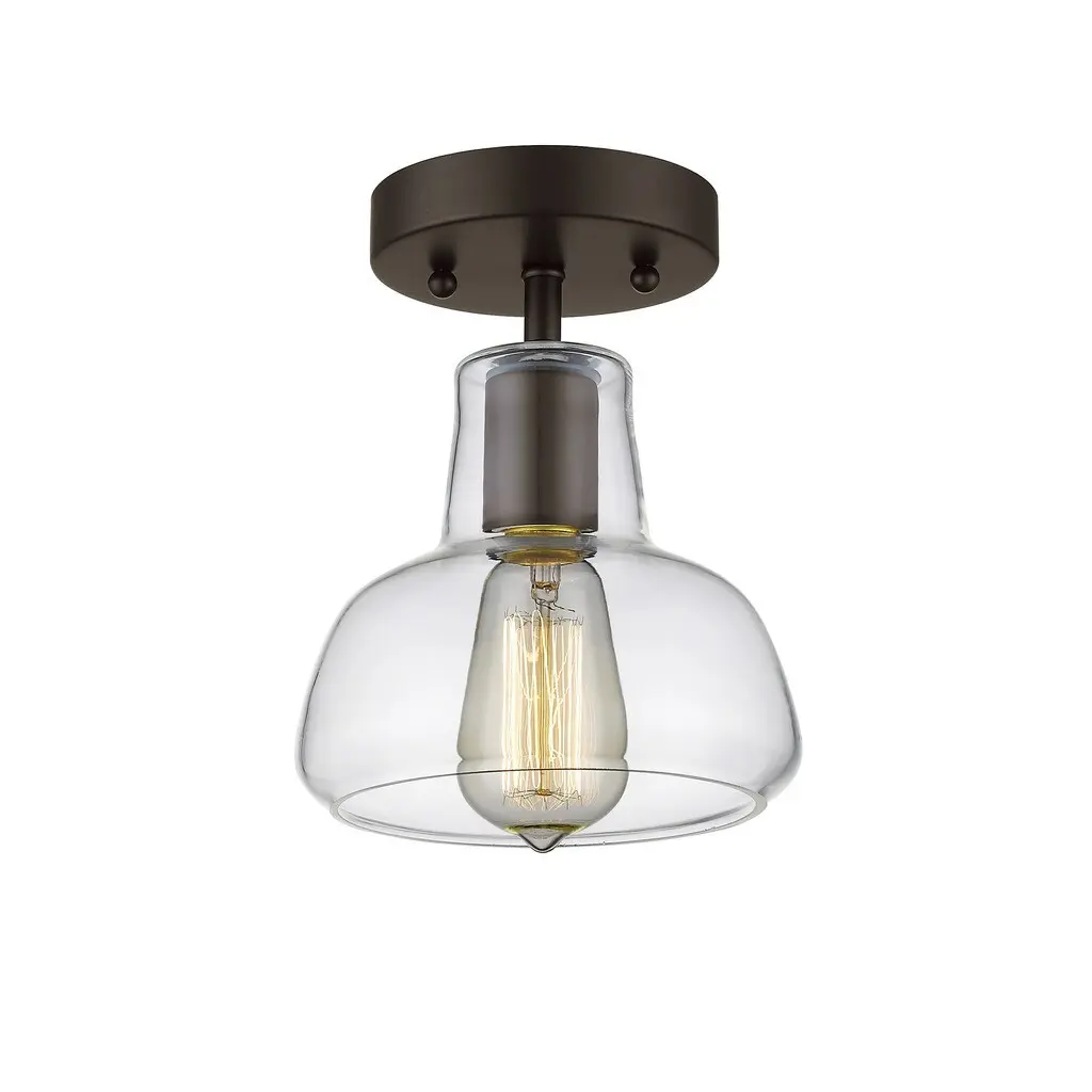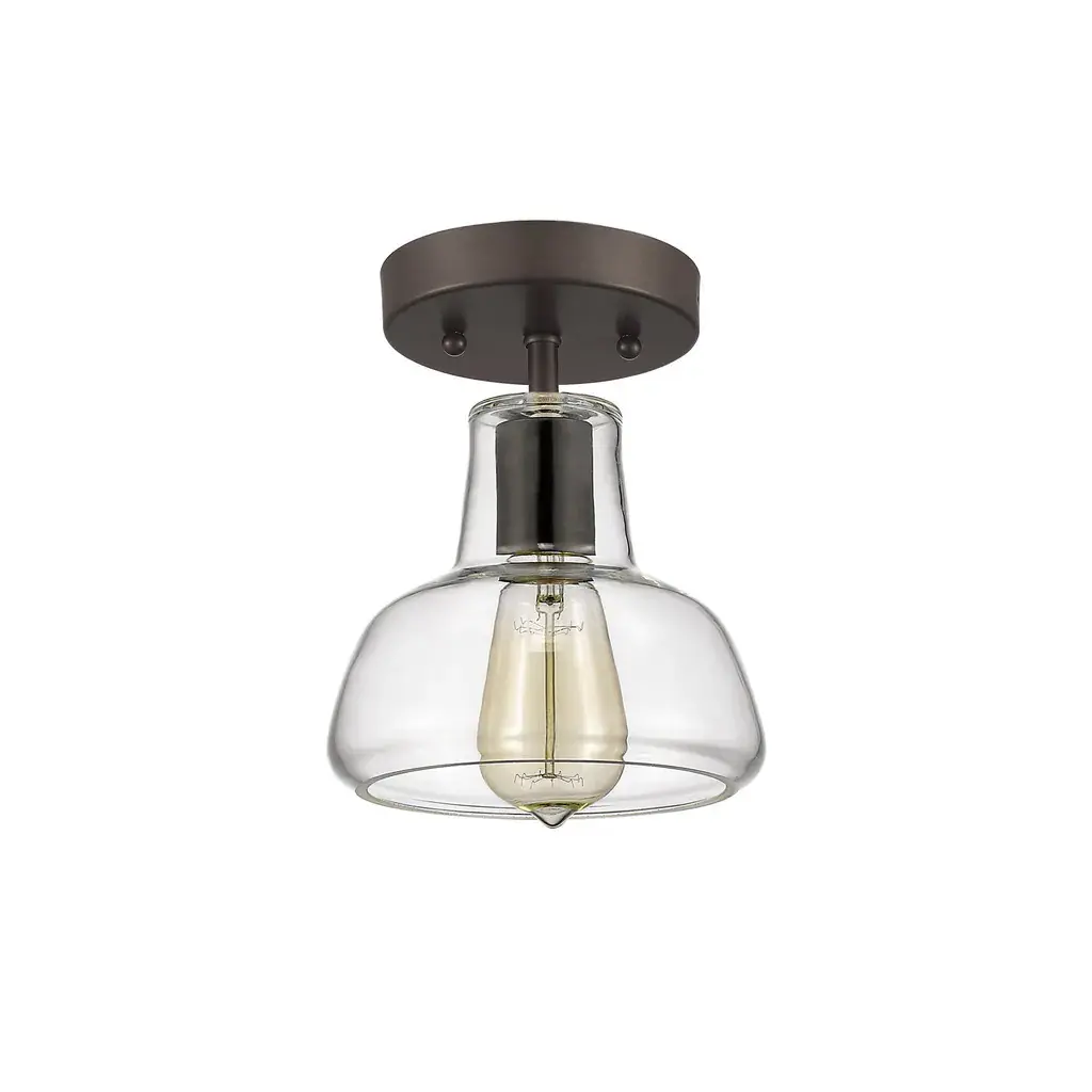 This 1-light semi flush mount features a oil rubbed bronze finish that will complement many loft, urban, industrial and transitional decors. The unique shape of the clear glass shade adds interest and showcases the old fashioned Edison bulb. One (1) 60 watt Edison bulb included. 8.19 inches high x 6.7 inch diameter.Number of Light: 1 LightShade Material: Clear GlassBulb Wattage: 100 Watt maximumLight Bulb Type: IncandescentLighting Type: Semi-FlushBulbs Included, UL ListedMaterial: SteelLight Direction: Multi-directionalCeiling Light Fixture Type: Flush mountSwitch Type: HardwiredLighting Style: TransitionalHeight: 14 inches or lessFinish: Bronze FinishWidth: 16 inches or lessColor: BrownAssembly RequiredThis fixture does need to be hard wired. Professional installation is recommended.