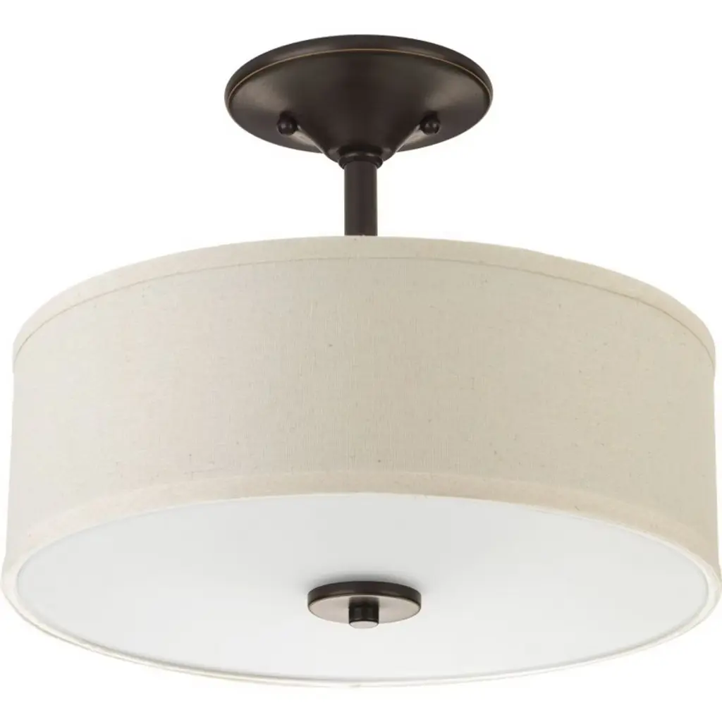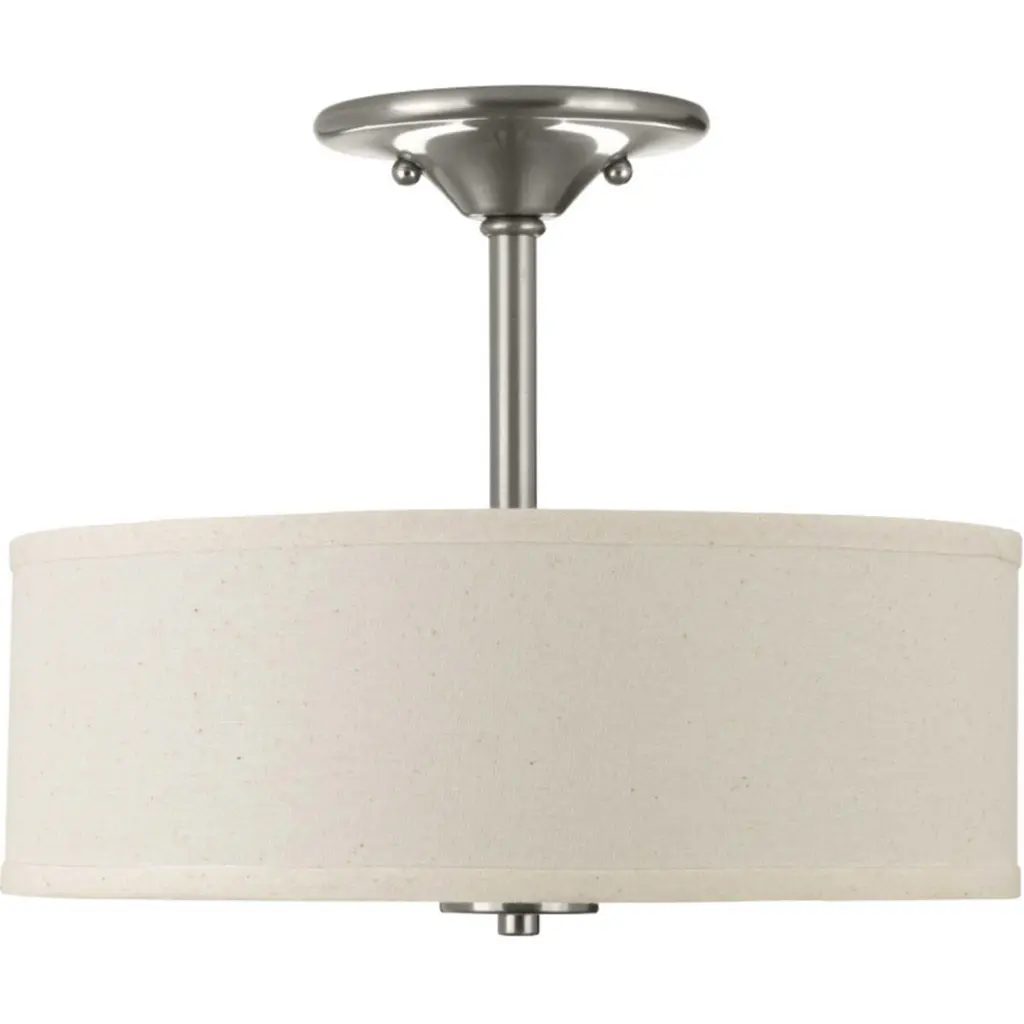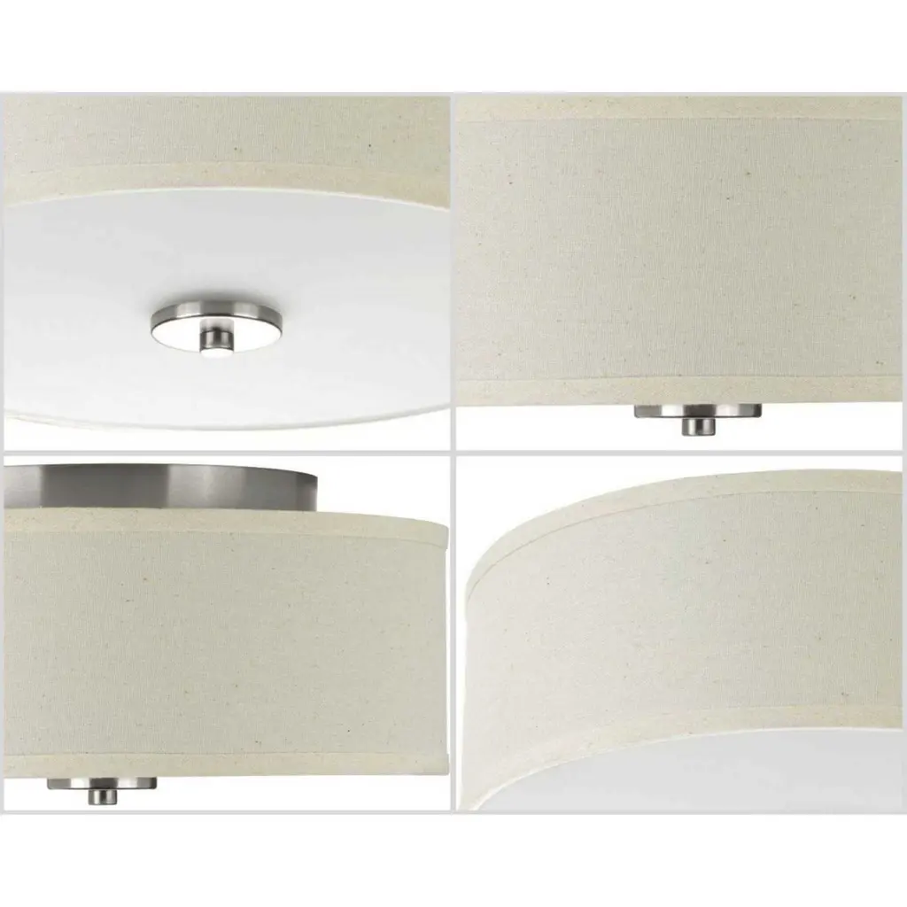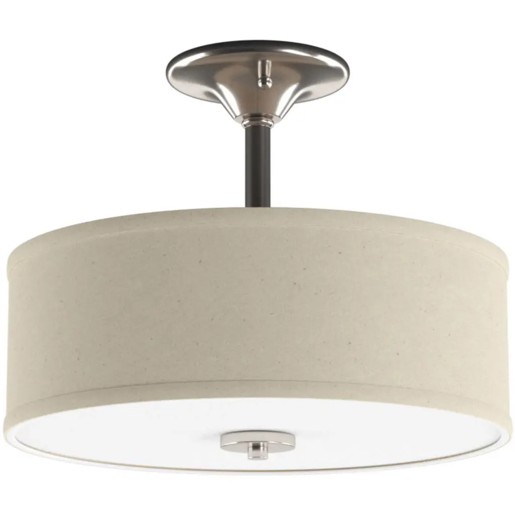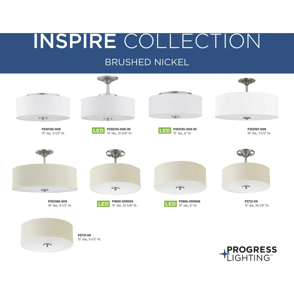 Harkening back to a simpler time, the Inspire Collection freshens traditional forms with flowing lines. The two-light Brushed Nickel LED semi-flush mount Inspire features an etched glass diffuser with an off-white linen shade.