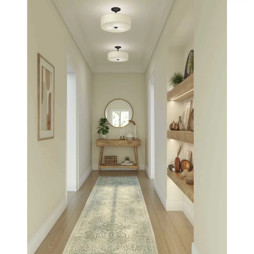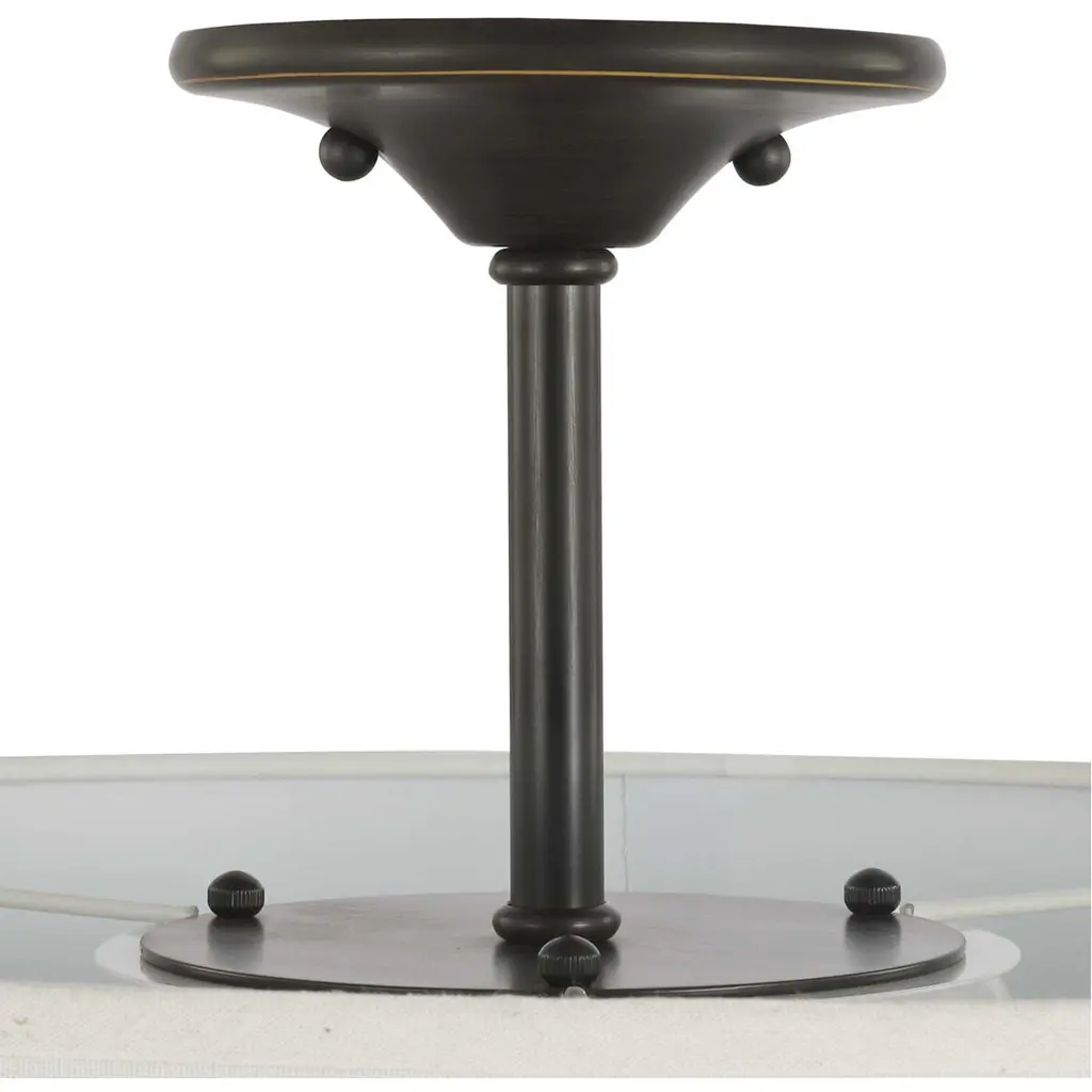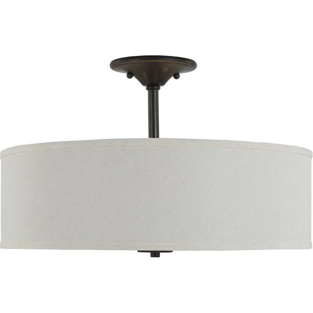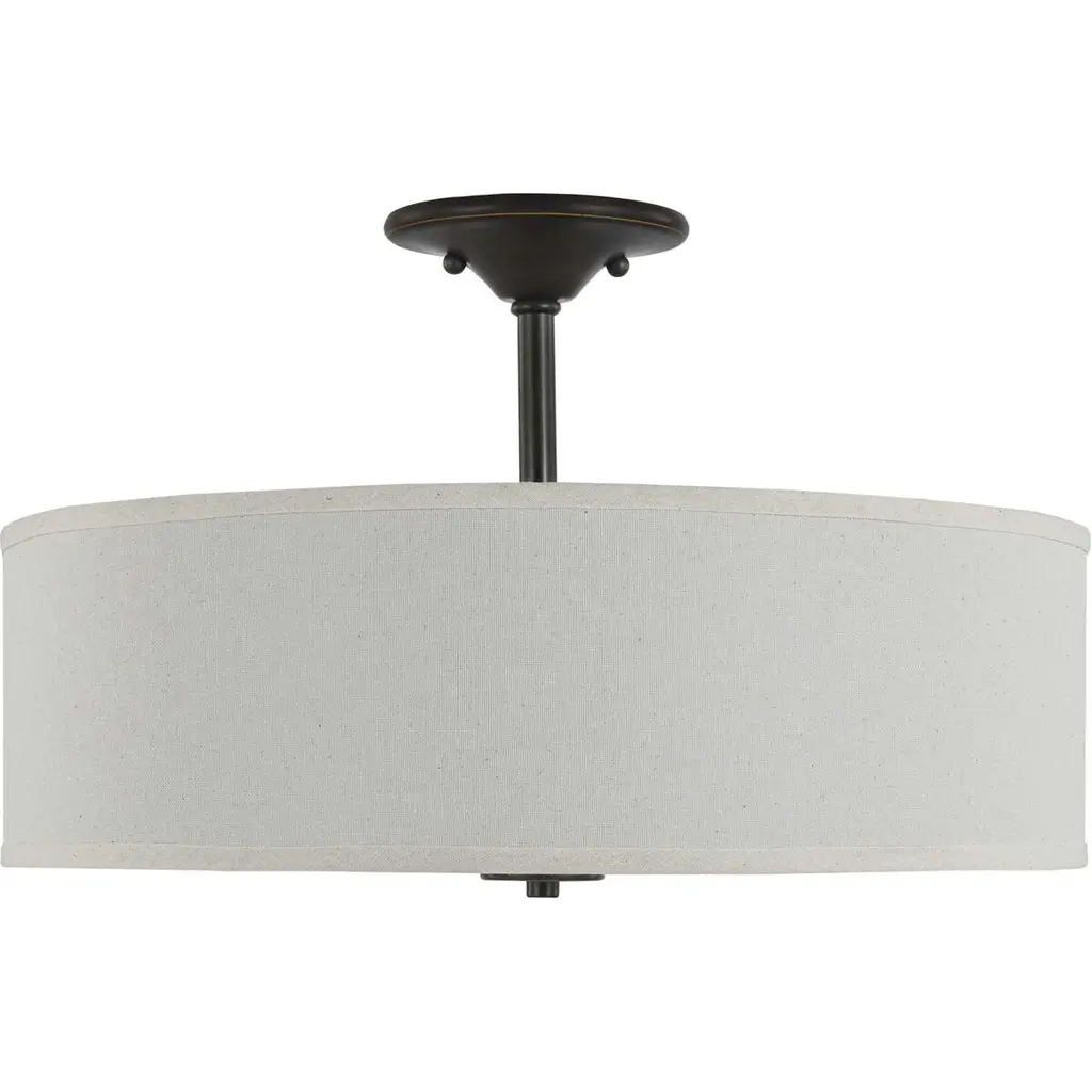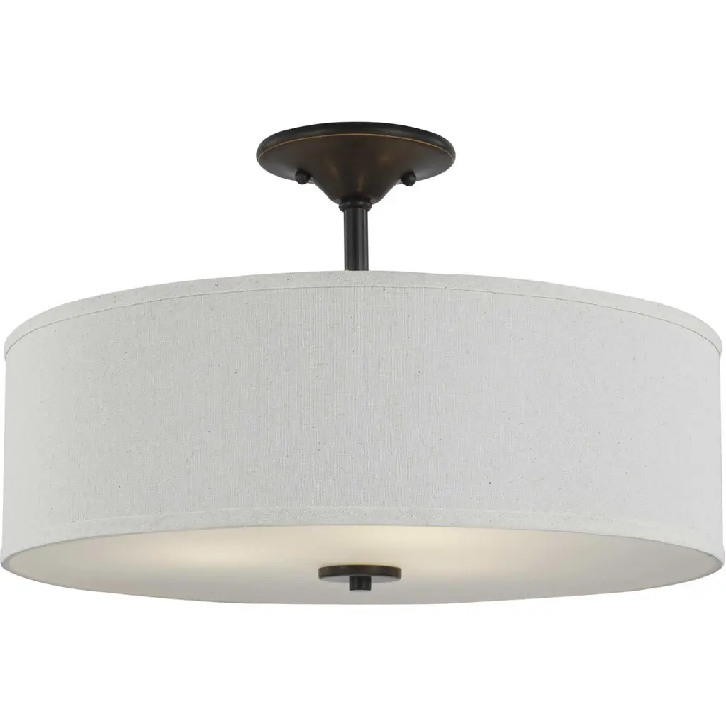 Harkening back to a simpler time, the Inspire Collection Antique Bronze Three-Light Semi-Flush Mount's timeless demeanor is sure to become a favorite for generations. A round, off-white linen shade with an etched glass diffuser steals the show and creates a beautiful muted glow. Understated metal accents complement the light fixture as it fosters a casual, friendly atmosphere.