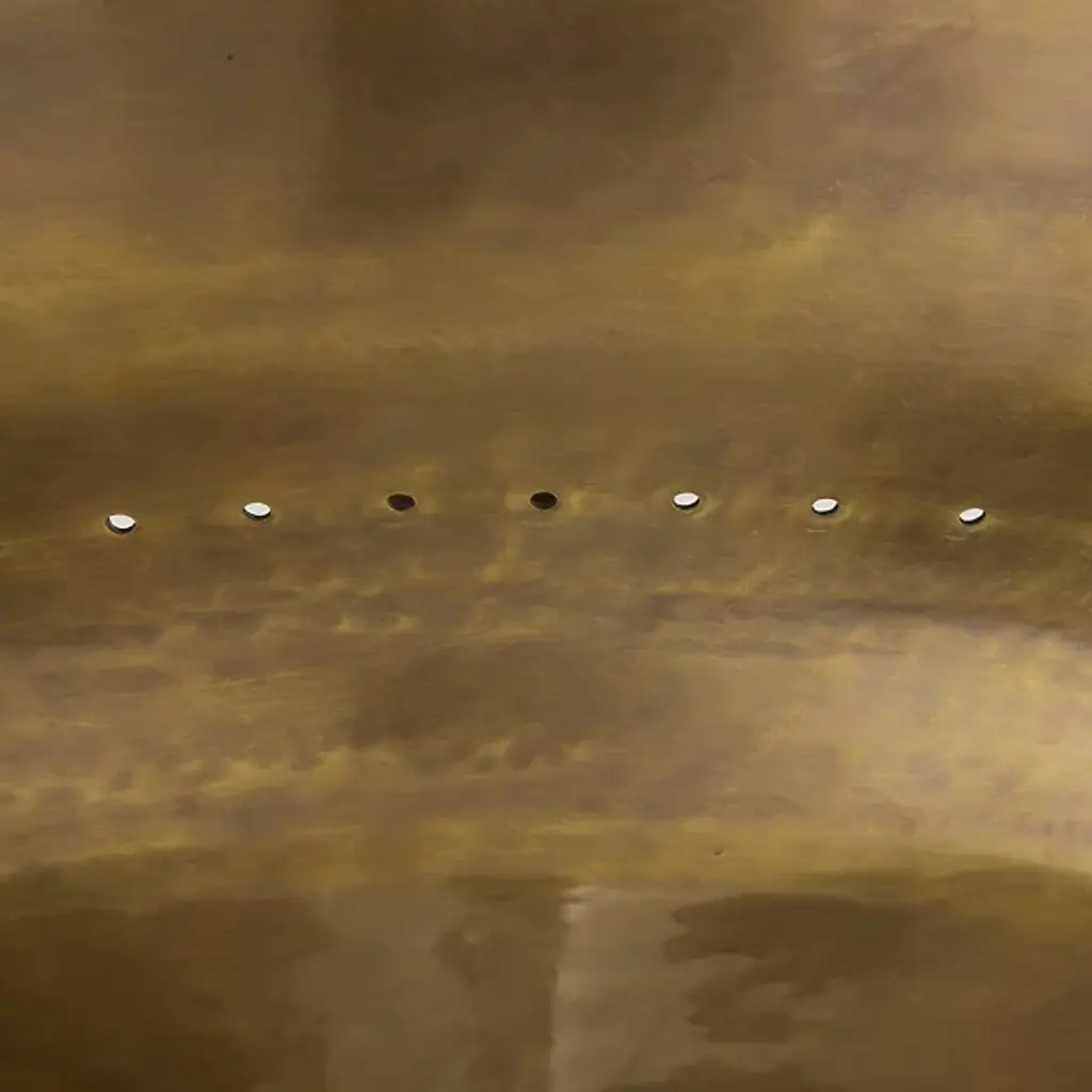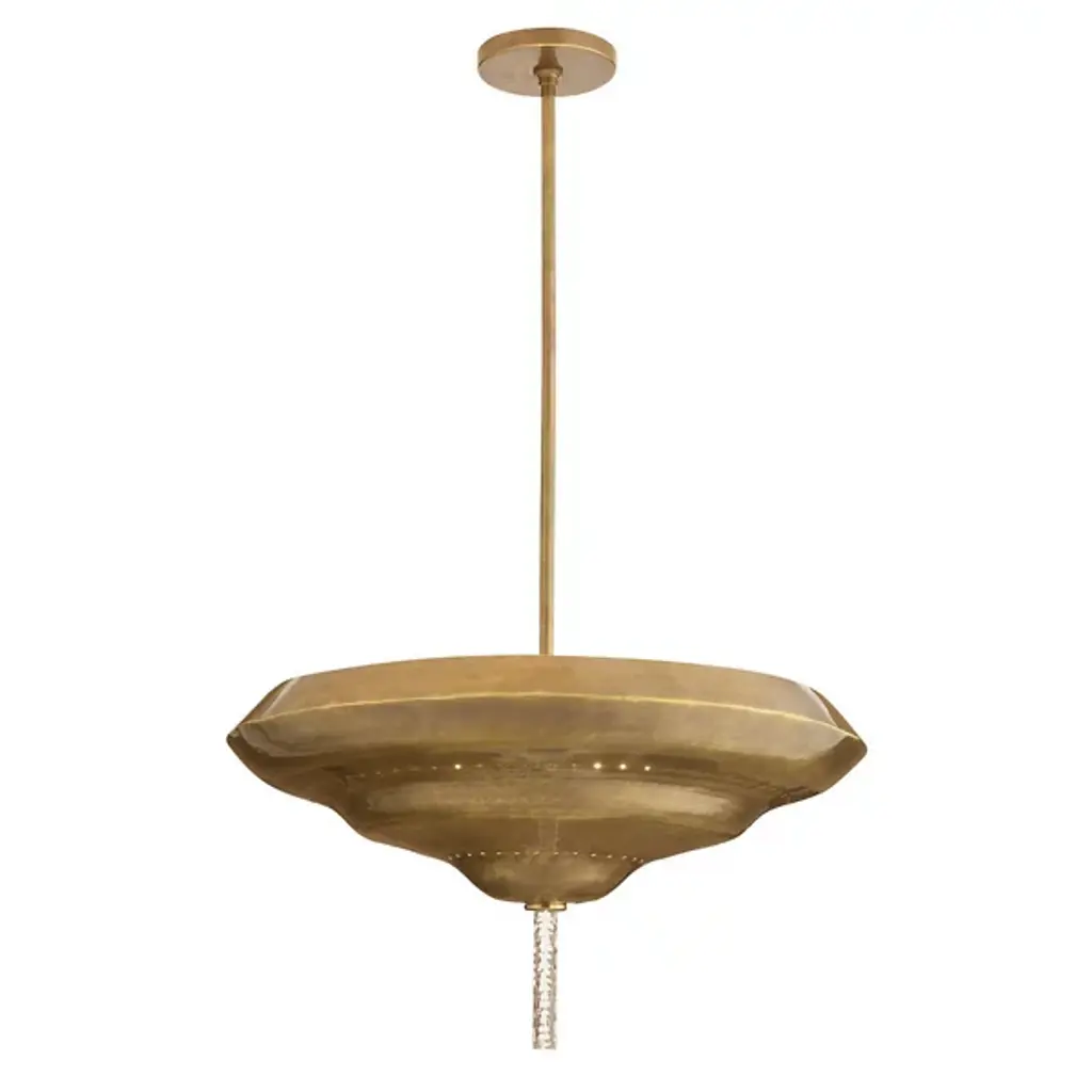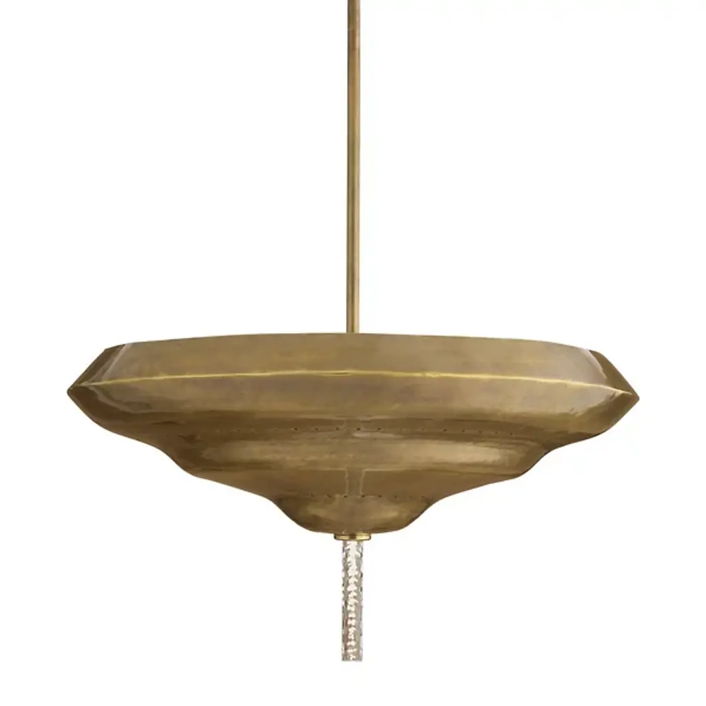 The Istanbul Semi-Flushmount / Pendant from Arteriors draws inspiration from ceremonial plates through its burnished iron construction, pierced by a textured smoke-luster glass column. Hand-formed metalwork includes pierced details that allow illumination to shine through, creating intriguing light patterns. This exotic fixture brings an industrial character to kitchens, dining spaces, or living areas, where its round form serves as a conversation piece. The damp-rated construction makes it suitable for covered outdoor applications while adding dramatic architectural presence to any setting.