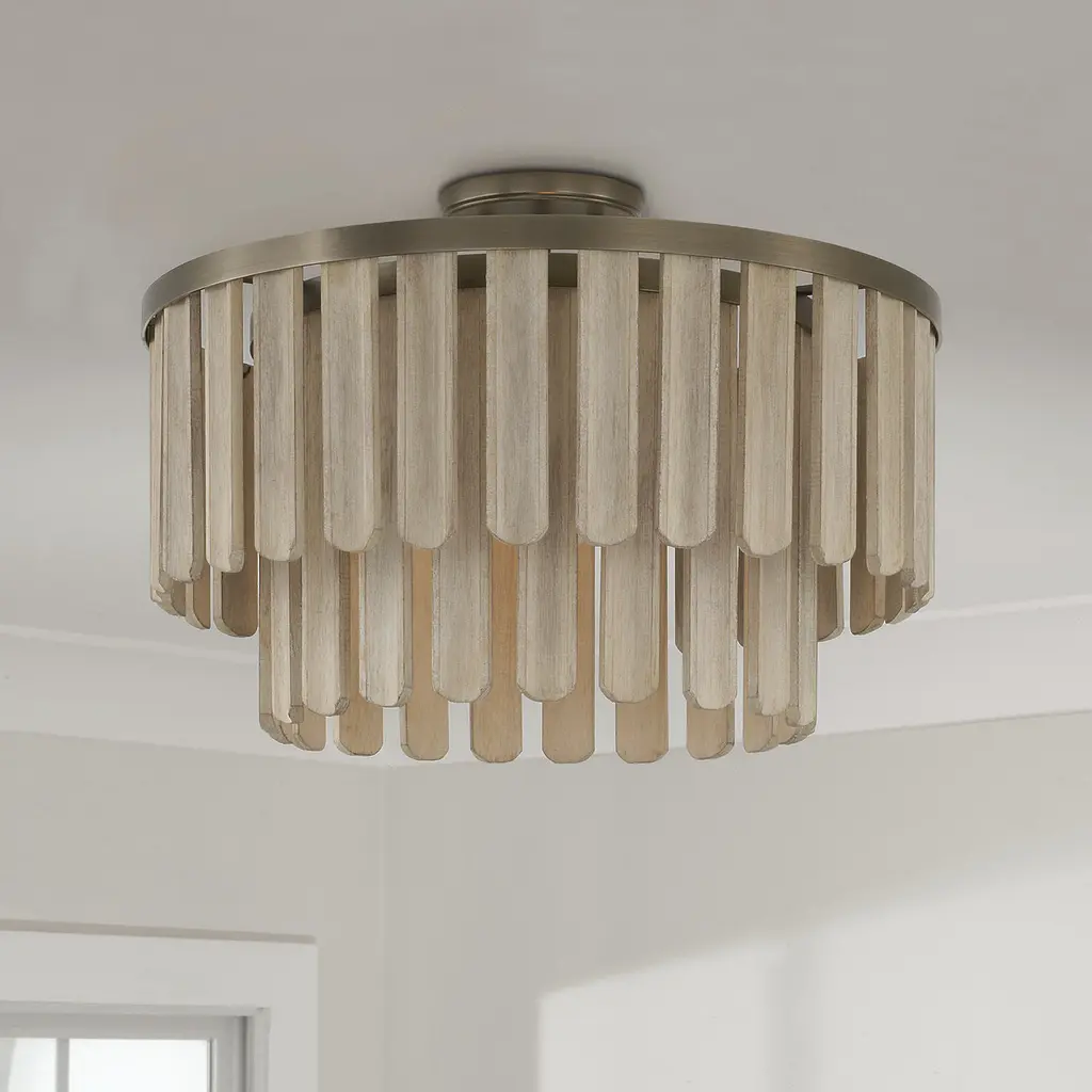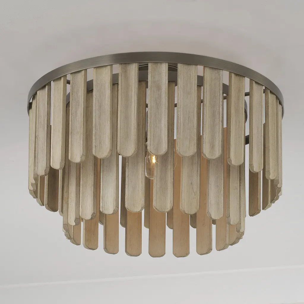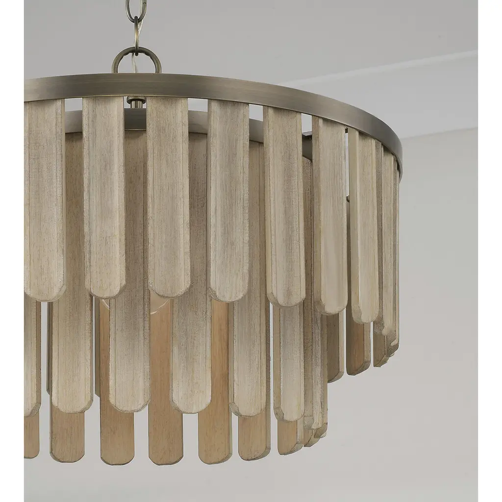 Handcrafted of mango wood, the Jada Dual Mount celebrates muted earthtones and modern organic style. The subtly distressed Nordic Grey wood adornments are carved to bring elegant texture and depth to the tiered form, complemented with the Dark Brass metal frame. Can be hung as a pendant or semi flush.