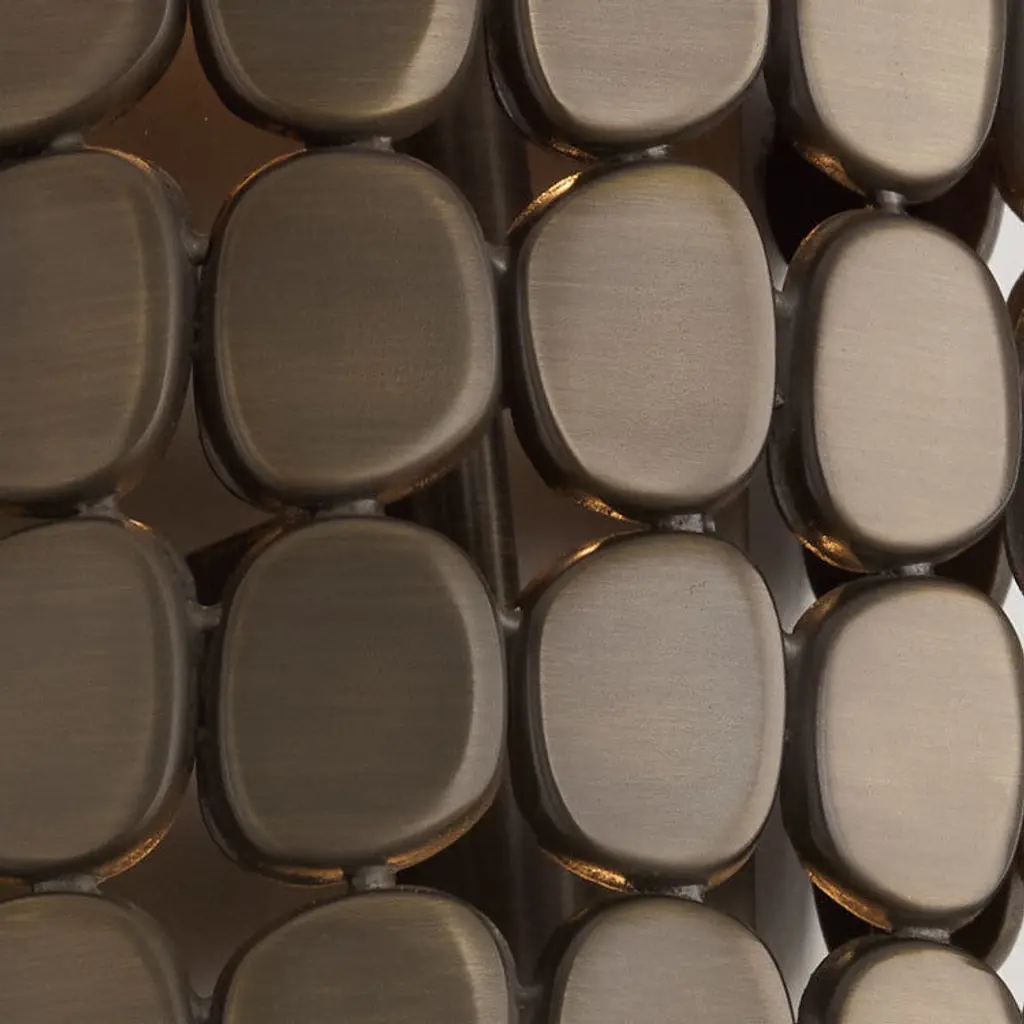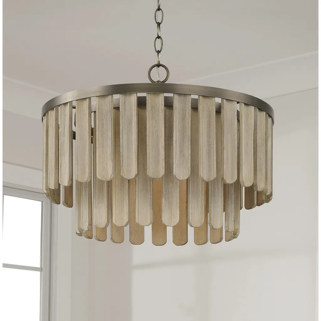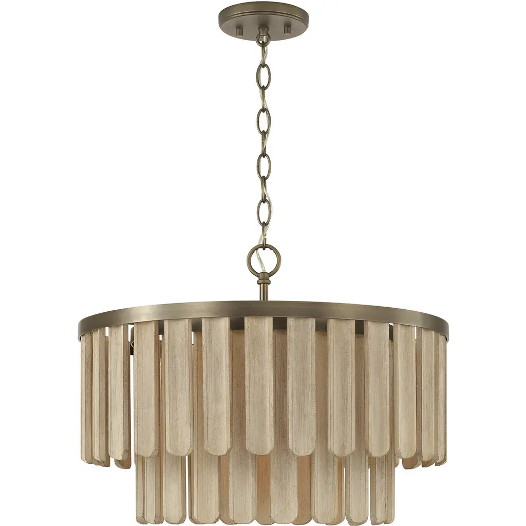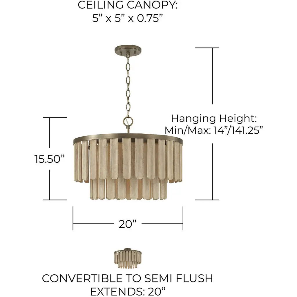 Handcrafted of mango wood, the Jada Dual Mount celebrates muted earthtones and modern organic style. The subtly distressed Nordic Grey wood adornments are carved to bring elegant texture and depth to the tiered form, complemented with the Dark Brass metal frame. Can be hung as a pendant or semi flush.