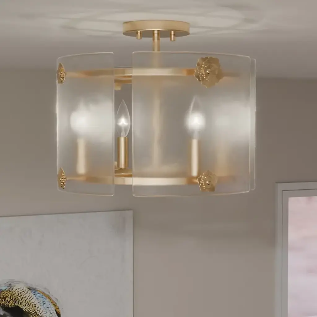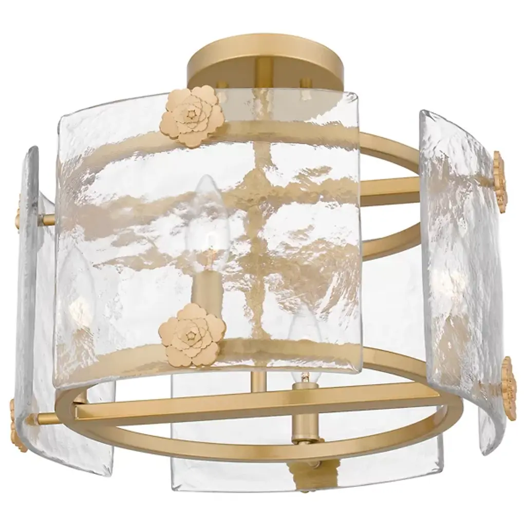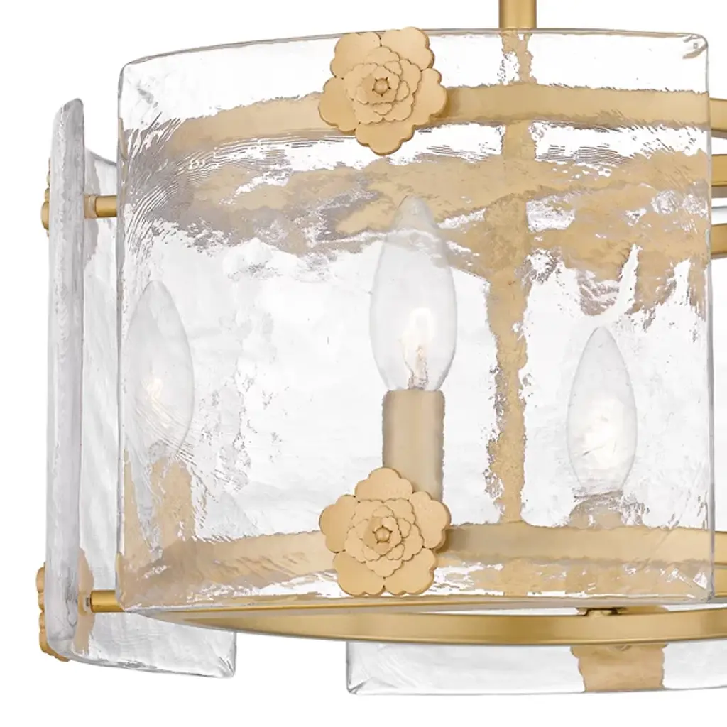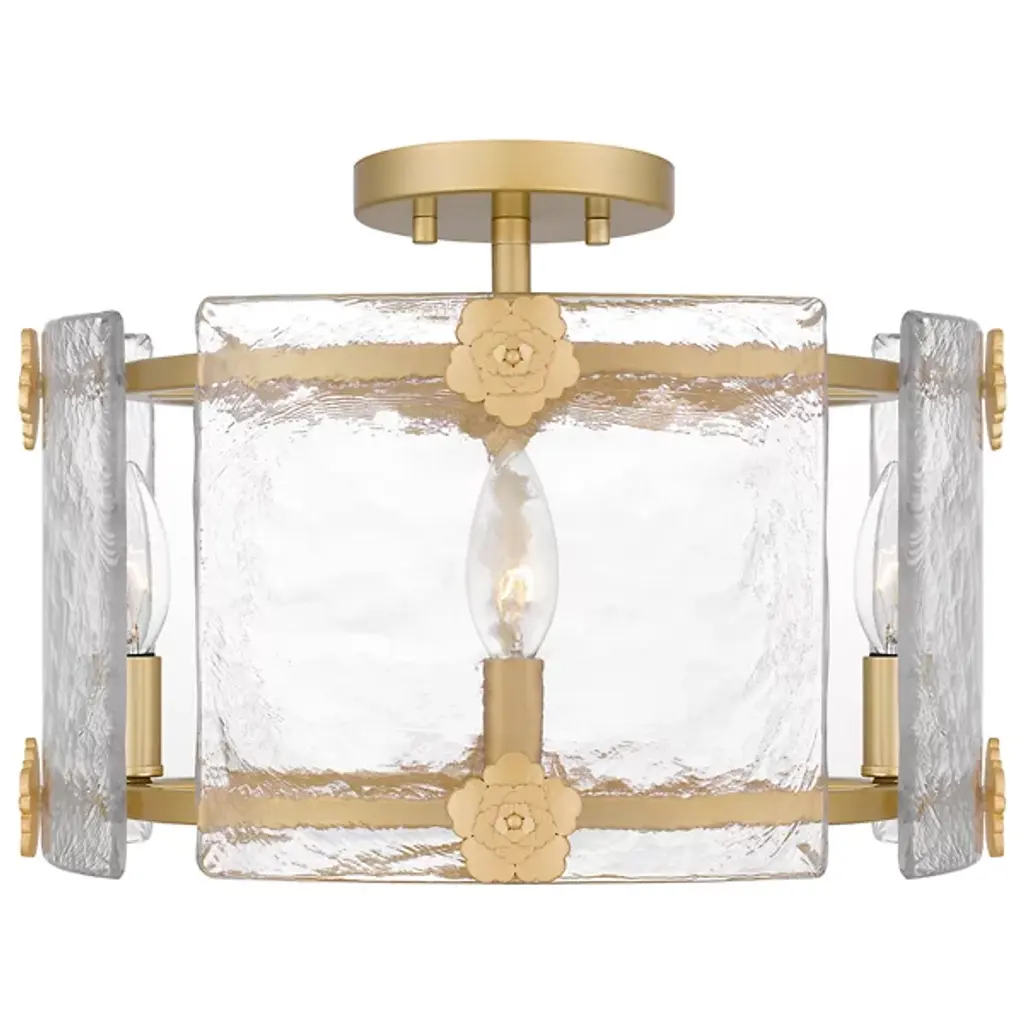 The Jolie Semi-Flushmount from Quoizel shines with its elegant light gold finish and intricate clear textured glass, making it the stylish centerpiece of any space. Delicate gold flowers embellish the corners of the glass panels, infusing a hint of natural allure into the timeless design. Suspended from a circular canopy, it features a central stem that extends to candelabra-style lamping mounted in a ring, creating a captivating visual display. Crafted from durable steel with clear textured glass shades, the Jolie Semi-Flushmount embodies transitional style, seamlessly blending classic charm with contemporary sophistication.