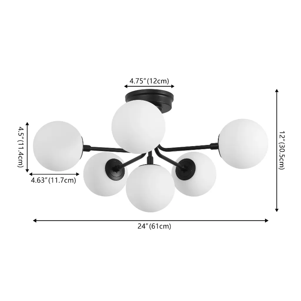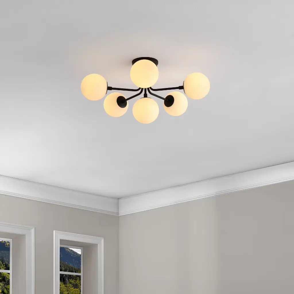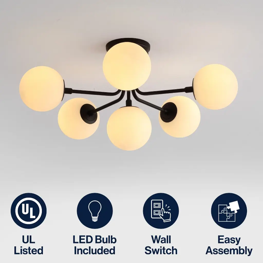 Bring on the mid-century Parisian flair with our classic bistro ceiling light. Six LED bulbs in frosted glass globes provide a warm, inviting glow, while clean lines and your choice of finishgold, black, almond, or whiteadd a touch of modern French bistro style. Perfect for elevating your dining room, living room, bedroom, or entry, this fixture blends timeless elegance with contemporary charm.