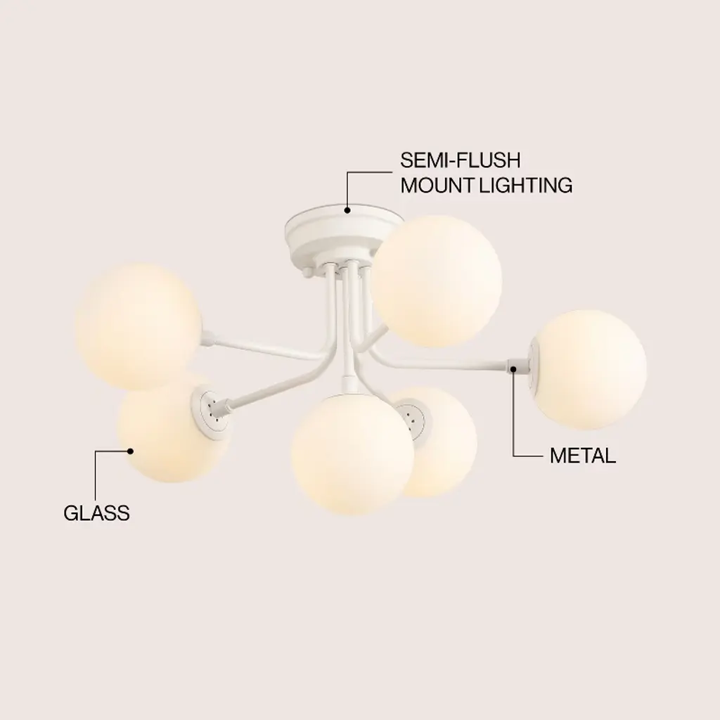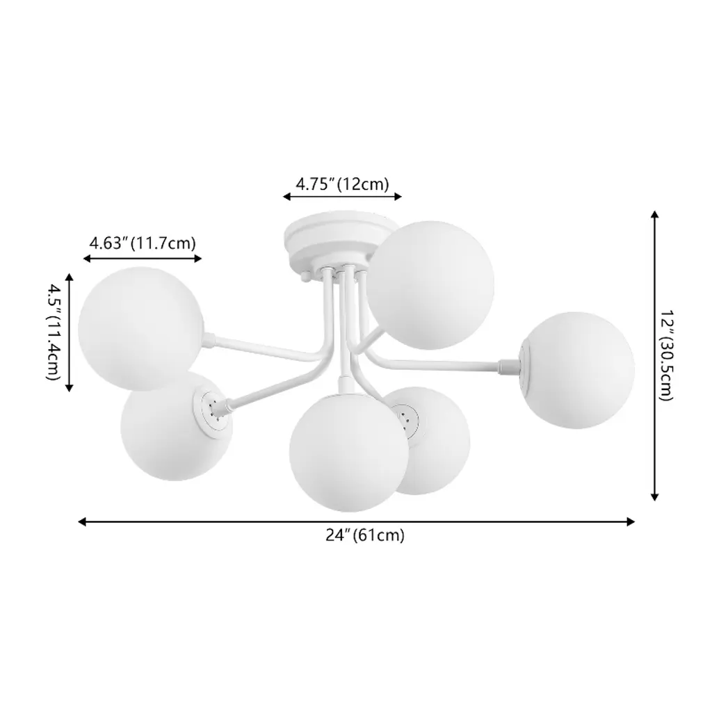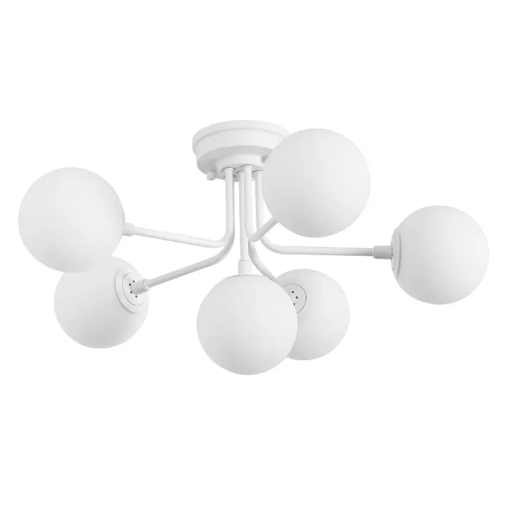 Bring on the mid-century Parisian flair with our classic bistro ceiling light. Six LED bulbs in frosted glass globes provide a warm, inviting glow, while clean lines and your choice of finishgold, black, almond, or whiteadd a touch of modern French bistro style. Perfect for elevating your dining room, living room, bedroom, or entry, this fixture blends timeless elegance with contemporary charm.