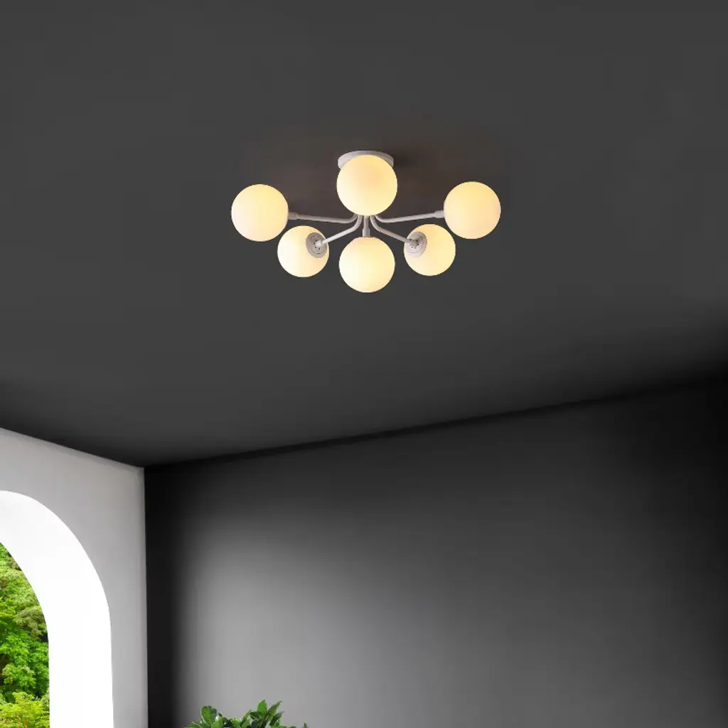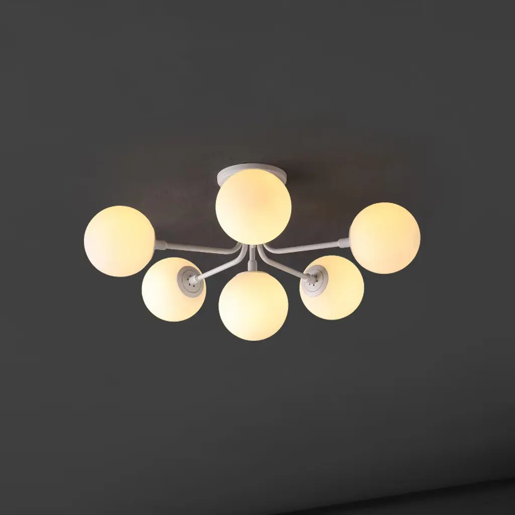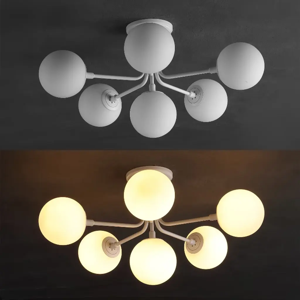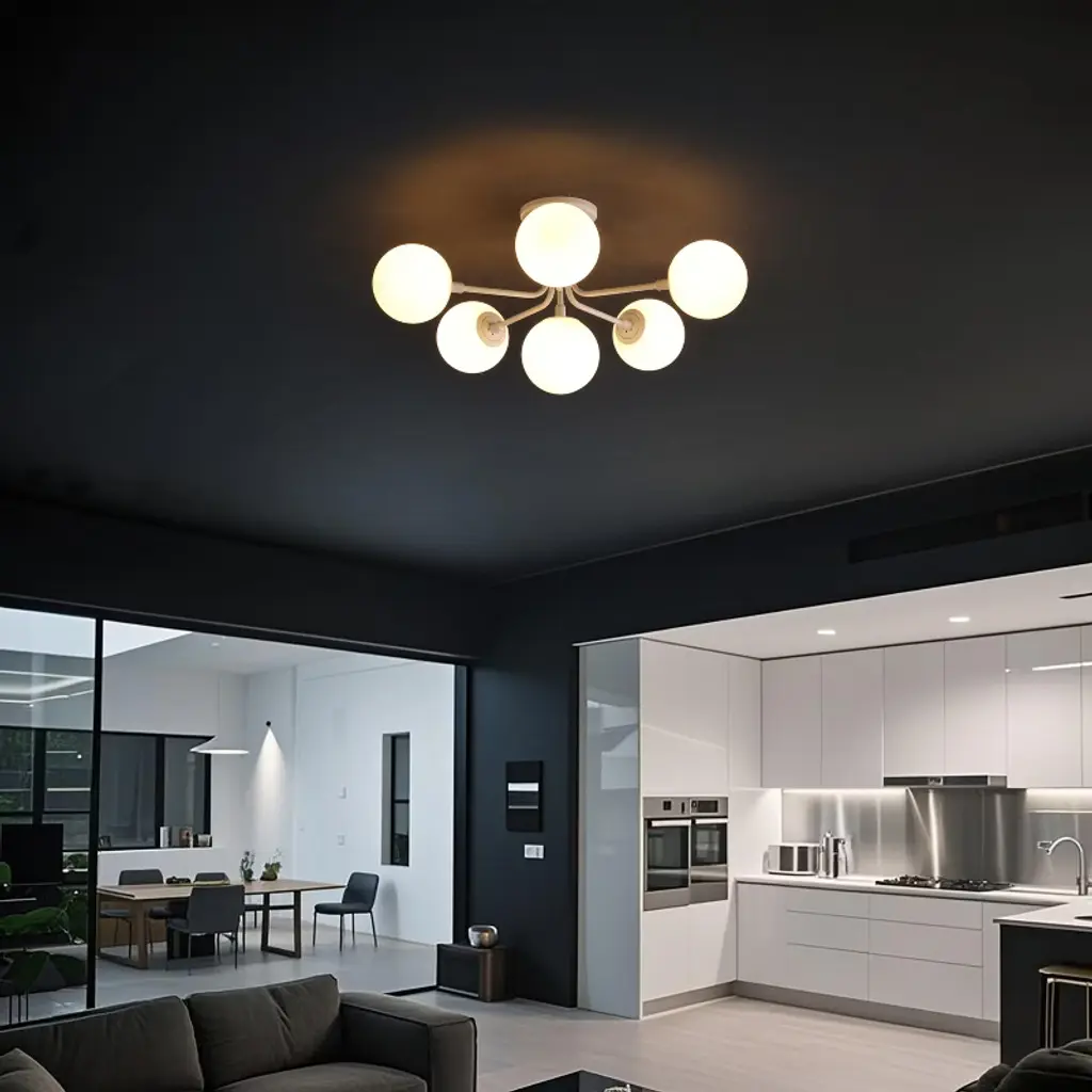 Bring on the mid-century Parisian flair with our classic bistro ceiling light. Six LED bulbs in frosted glass globes provide a warm, inviting glow, while clean lines and your choice of finishgold, black, almond, or whiteadd a touch of modern French bistro style. Perfect for elevating your dining room, living room, bedroom, or entry, this fixture blends timeless elegance with contemporary charm.