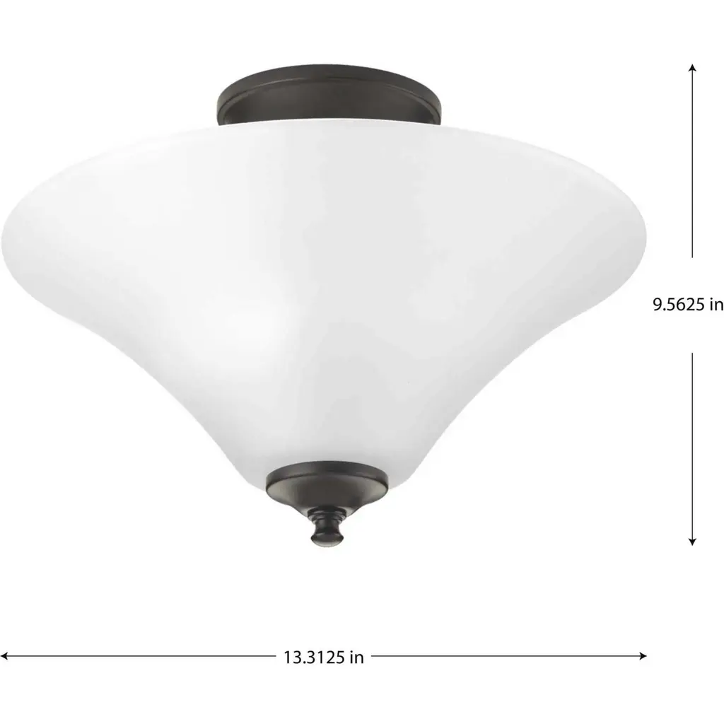 Gleeful simplicity defines this two-light semi-flush from the Joy Collection. Refreshing and fashionable arcing forms of Antique Bronze metal arms enhance the etched white fluted glass. Coordinating fixtures from this collection let you decorate an entire home with confidence and style.
