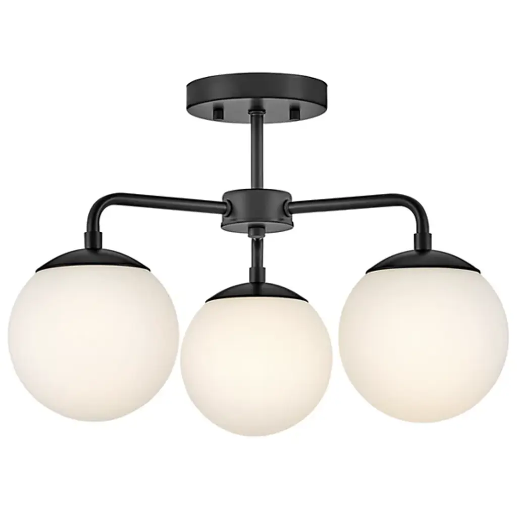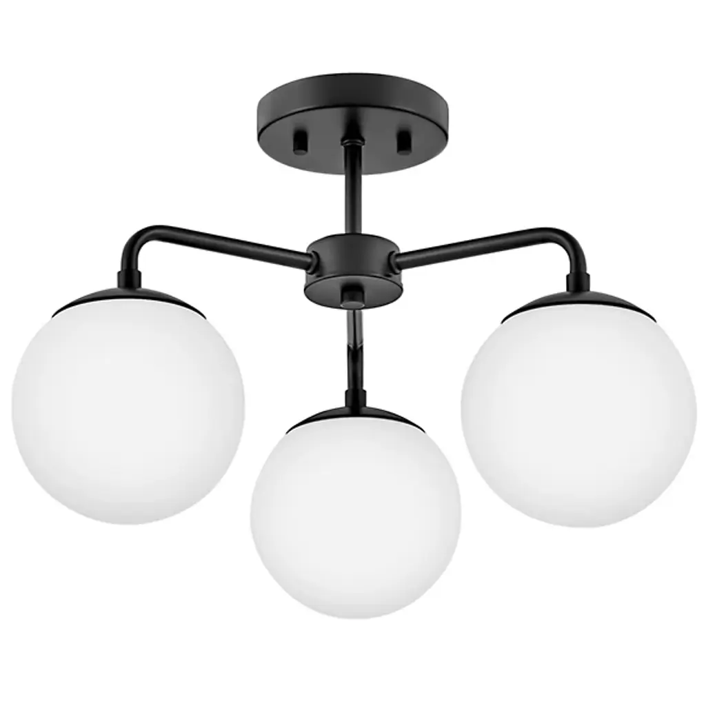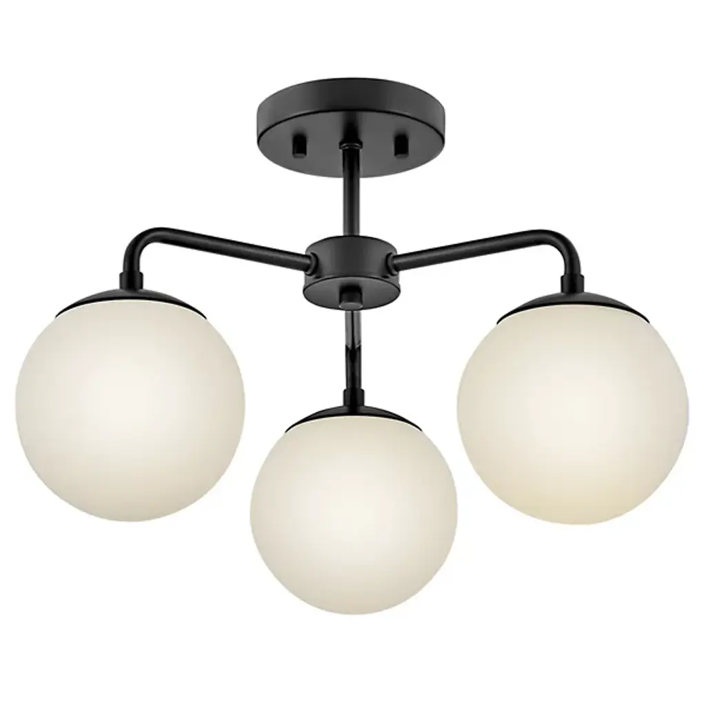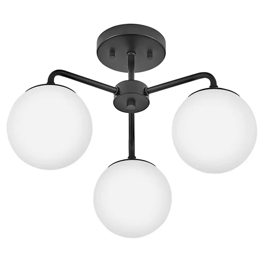 The Julep Semi-Flushmount from Lark welcomes one into the intimate or open space with familiar globes of pristine light. Elementary shapes and contrasting finishes underscore this mid-century-inspired piece. A short metal structure makes the piece easy to appreciate over the low-ceiling foyer or living space. This structure impresses with a triangulating setup of curving arms. Dish-shaped lamp holders top the always charming etched opal globes below. While on, these globes transform into radiant orbs for a spacious light.