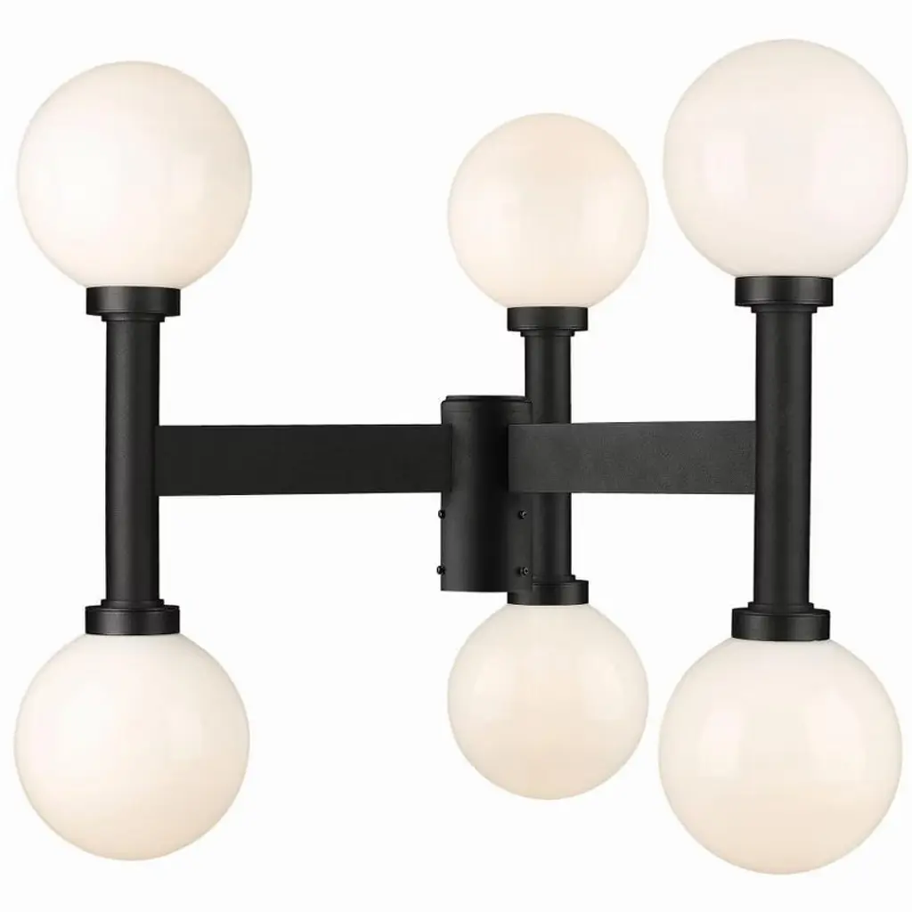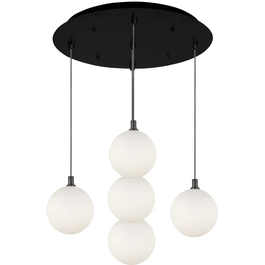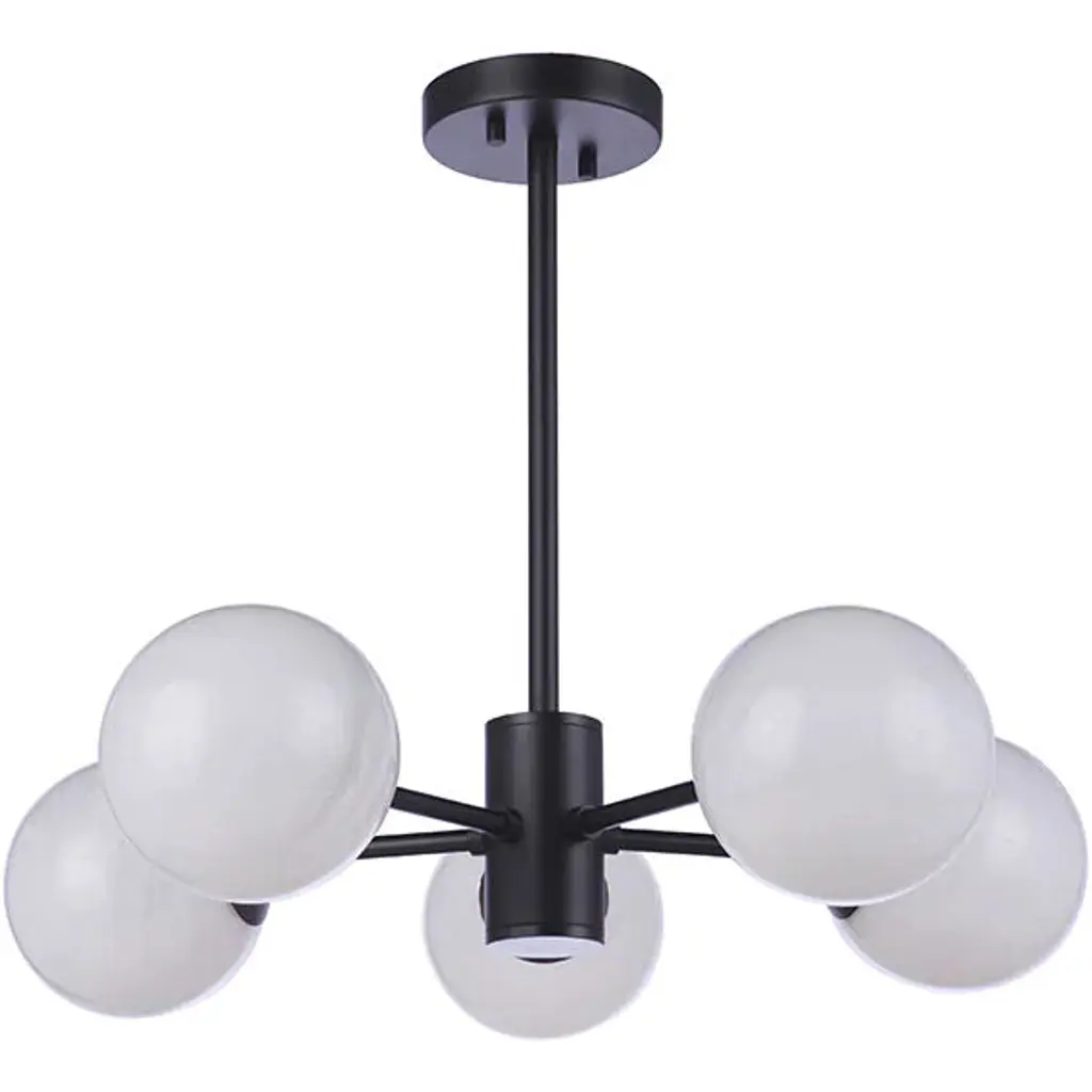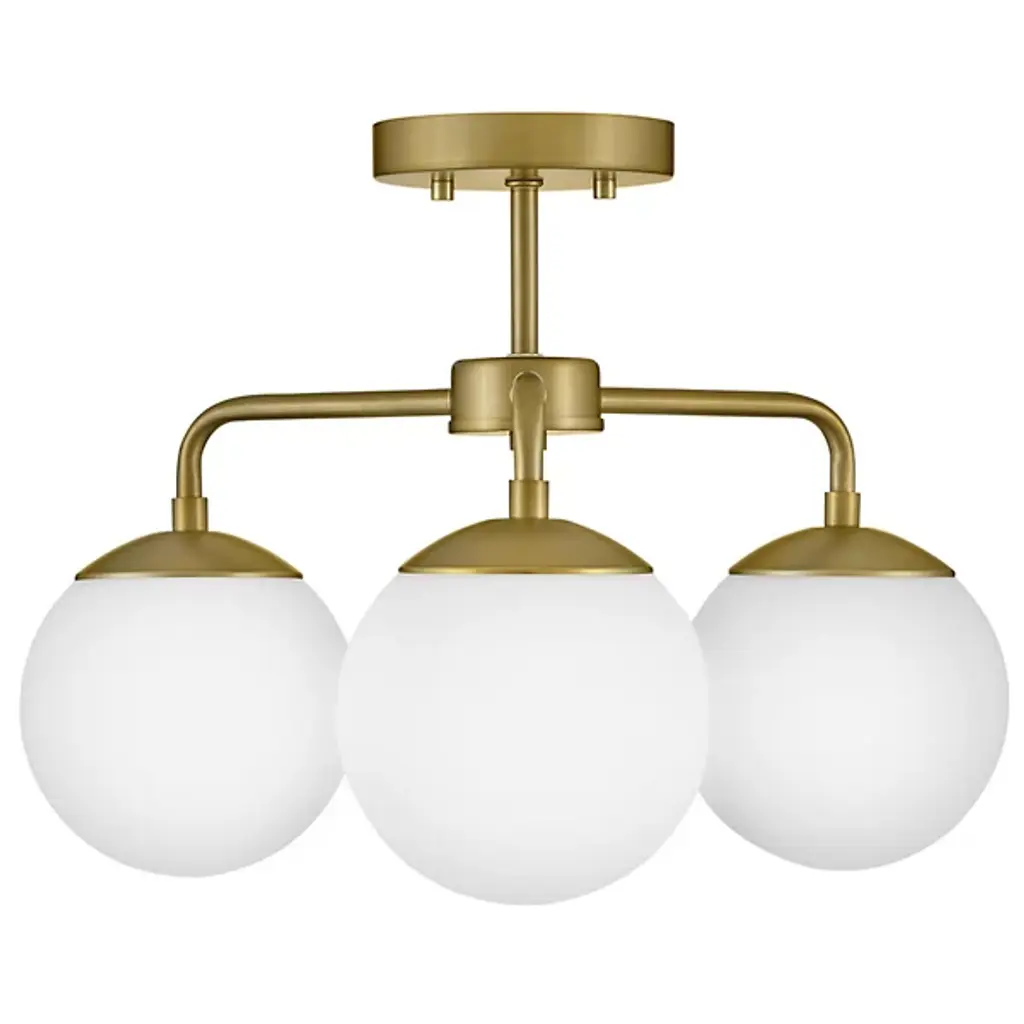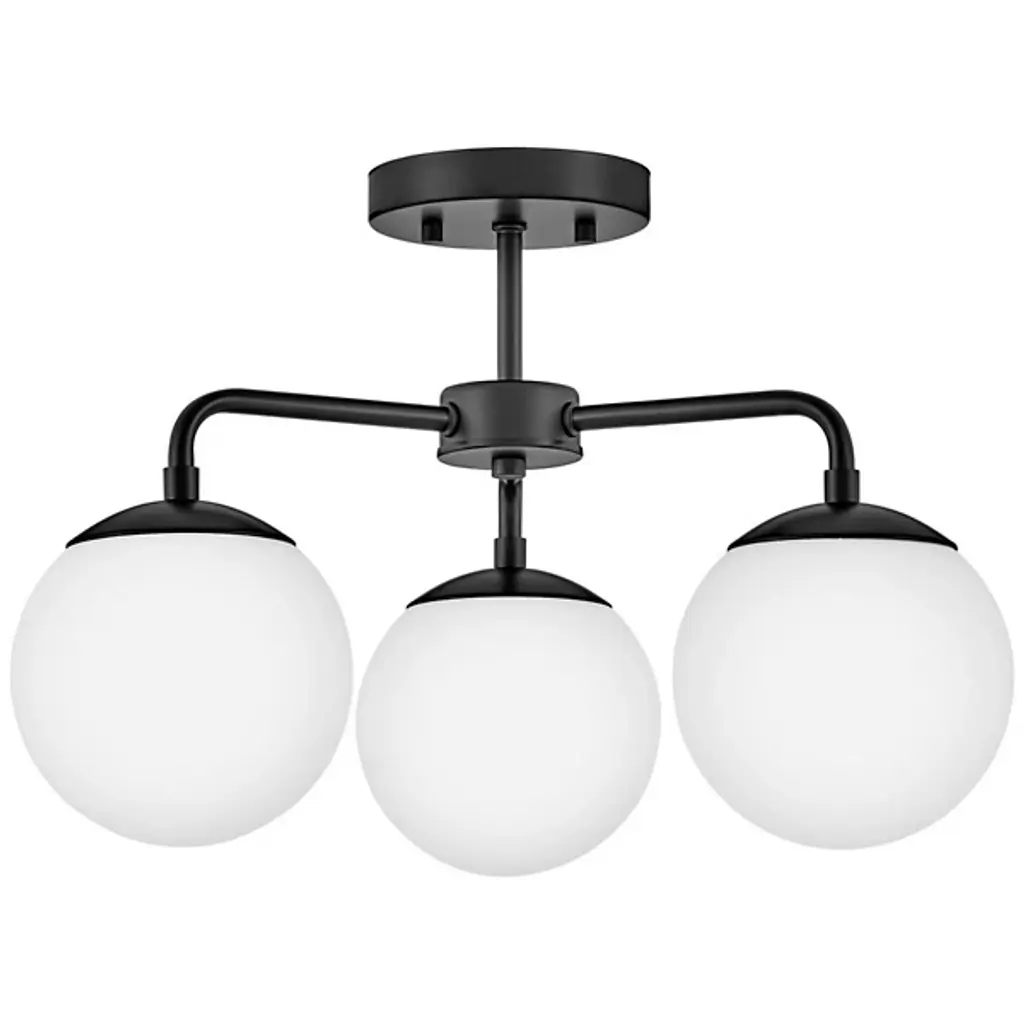 The Julep Semi-Flushmount from Lark welcomes one into the intimate or open space with familiar globes of pristine light. Elementary shapes and contrasting finishes underscore this mid-century-inspired piece. A short metal structure makes the piece easy to appreciate over the low-ceiling foyer or living space. This structure impresses with a triangulating setup of curving arms. Dish-shaped lamp holders top the always charming etched opal globes below. While on, these globes transform into radiant orbs for a spacious light.