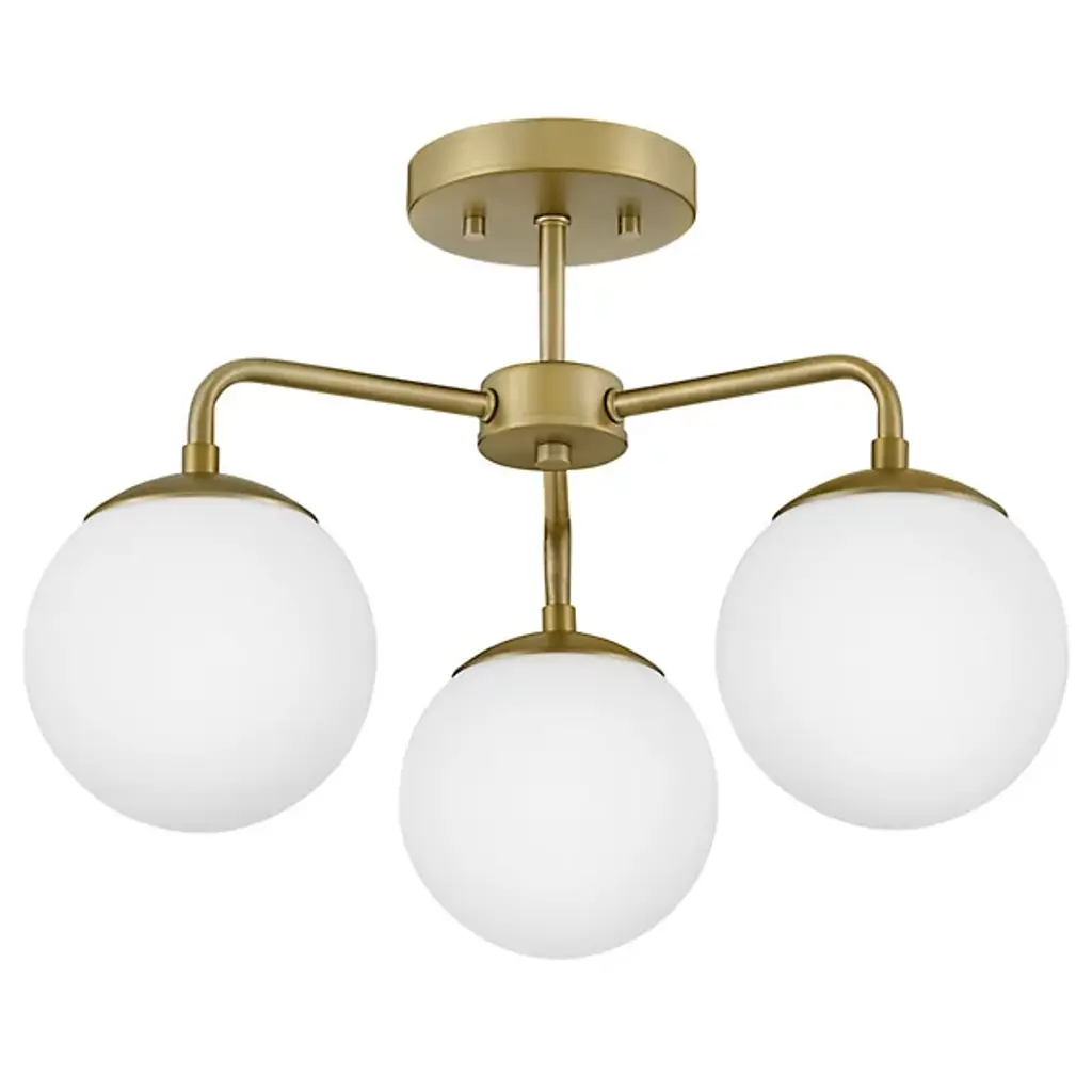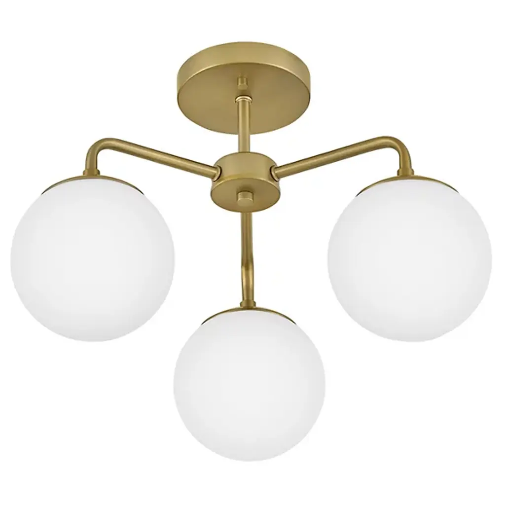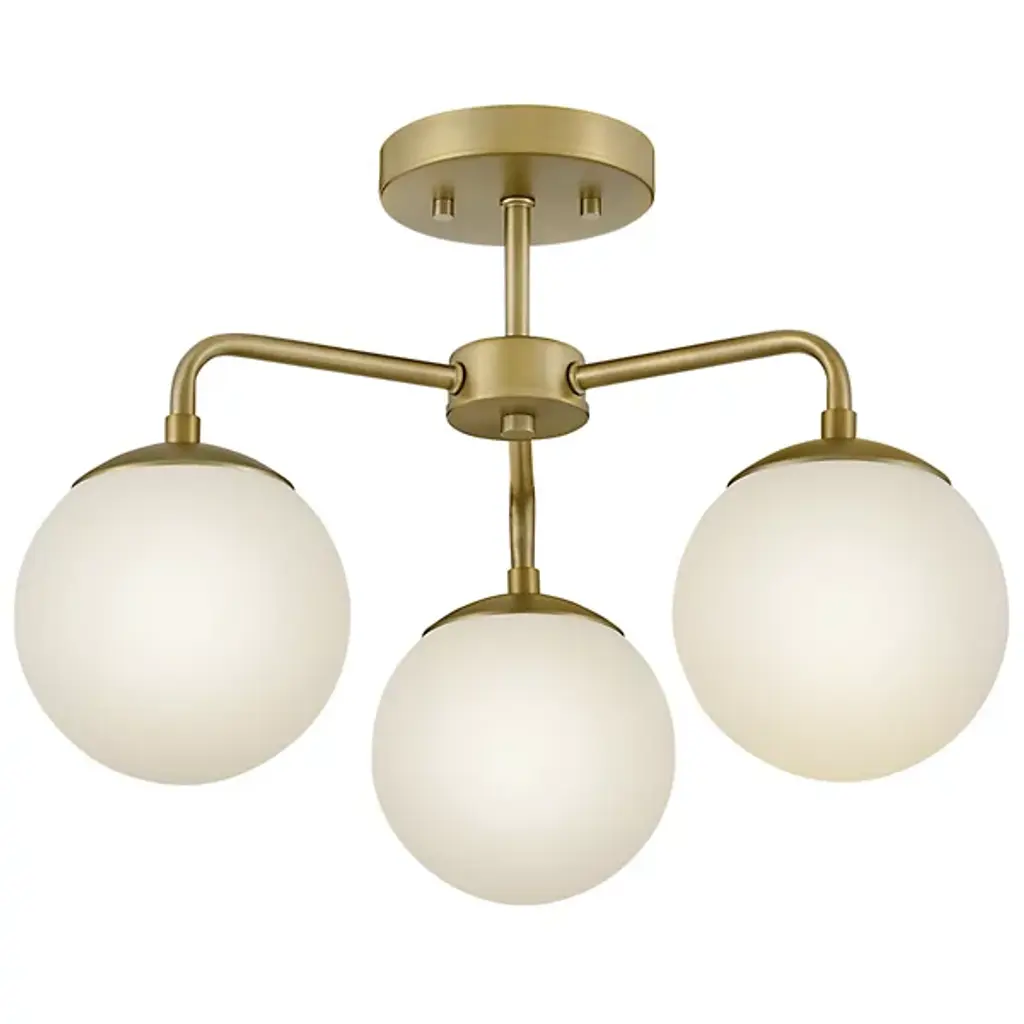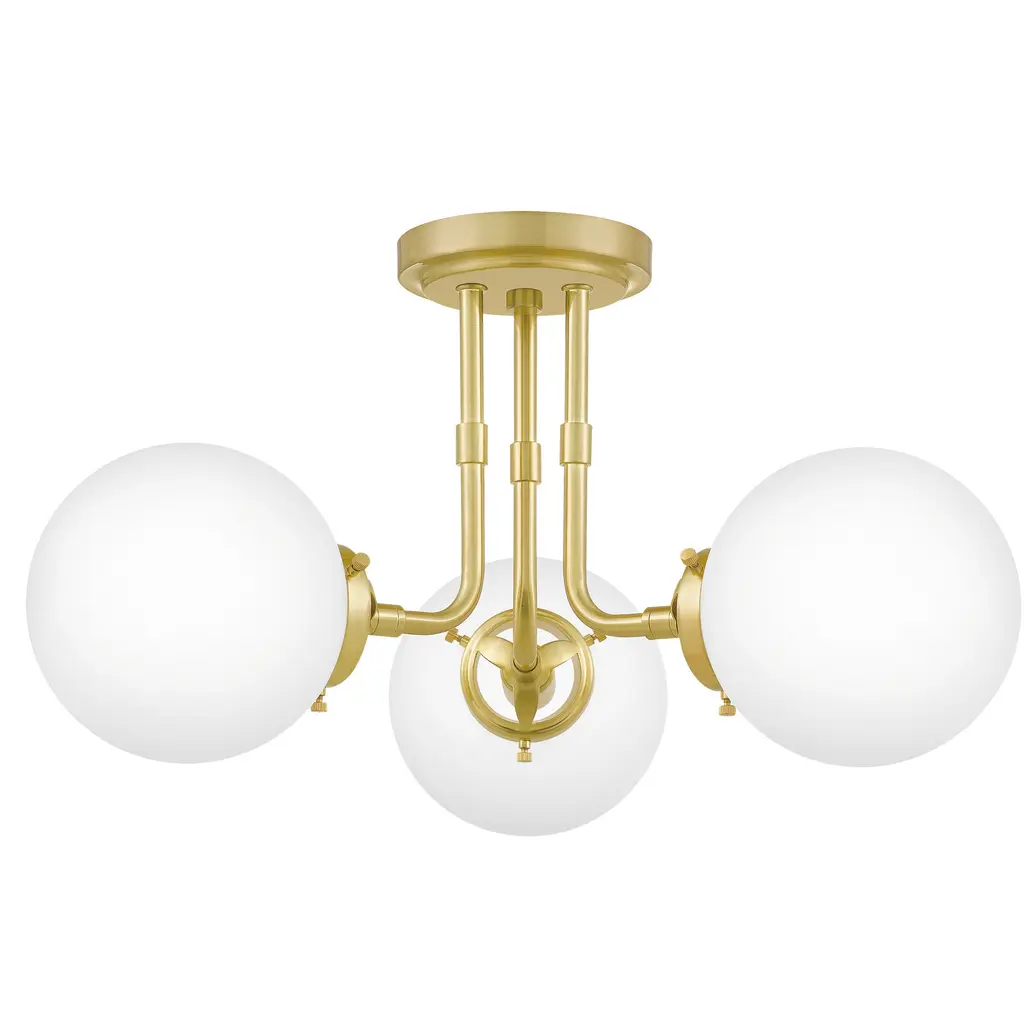 The Julep Semi-Flushmount from Lark welcomes one into the intimate or open space with familiar globes of pristine light. Elementary shapes and contrasting finishes underscore this mid-century-inspired piece. A short metal structure makes the piece easy to appreciate over the low-ceiling foyer or living space. This structure impresses with a triangulating setup of curving arms. Dish-shaped lamp holders top the always charming etched opal globes below. While on, these globes transform into radiant orbs for a spacious light.