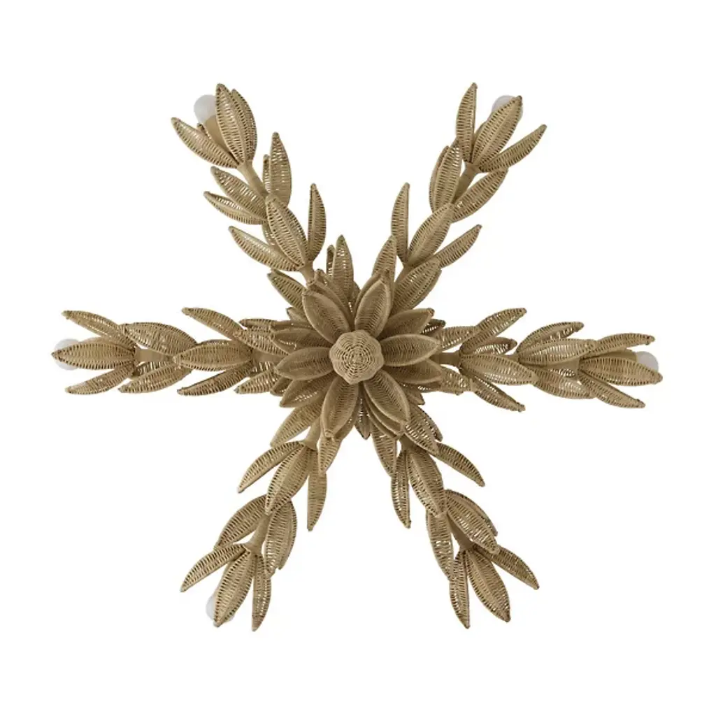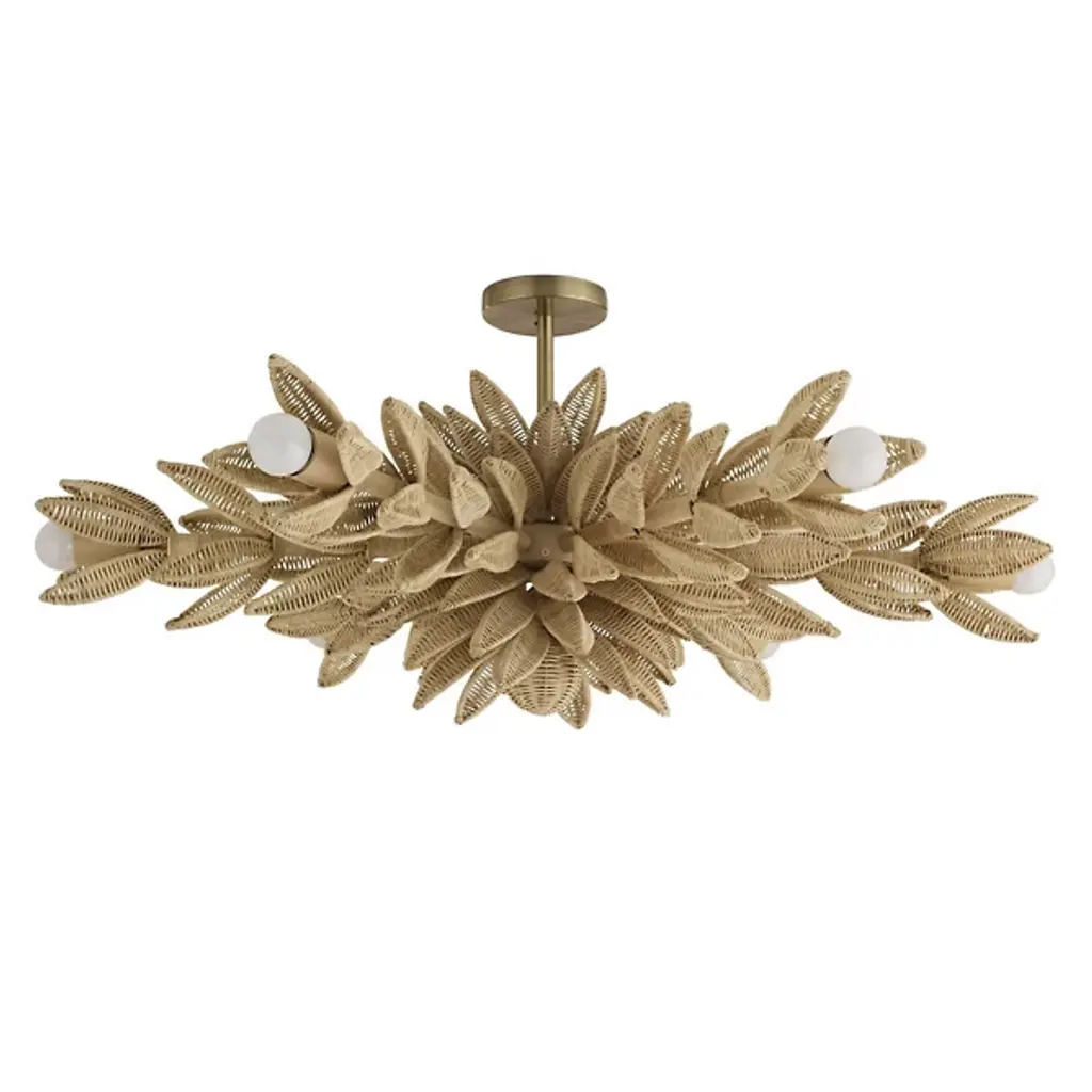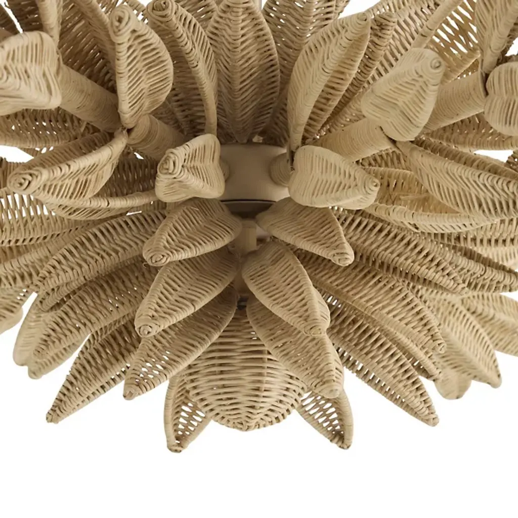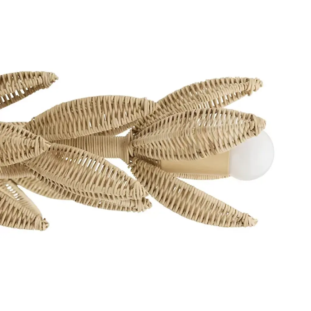 The Kasai Semi-Flushmount from Arteriors captures intricate botanical growth patterns through hand-woven natural rattan, where each leaf receives individual attention during the construction process. The layered design ensures a visual impact from every viewing angle, with organic textures that shift and overlap as light filters through. Kitchens, dining areas, and entryways benefit from its natural warmth and handcrafted character. This fixture provides practical illumination while enhancing interior environments with artistry that celebrates traditional weaving techniques. Rattan construction brings authentic material presence that softens modern spaces with earthy sophistication.