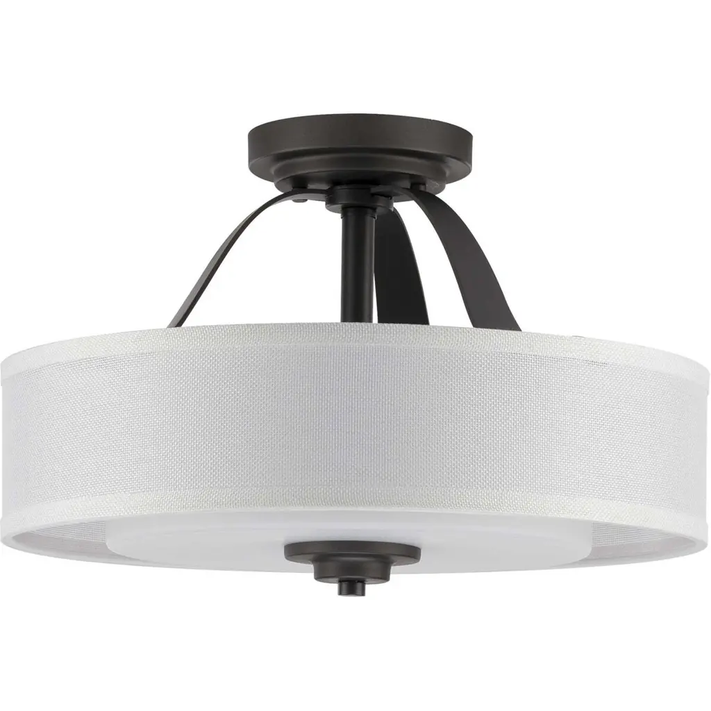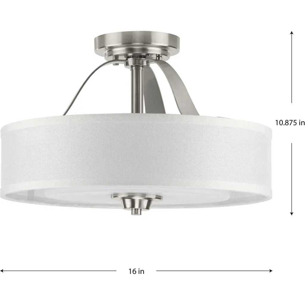 Add a modern romance to the heart of your home with this lovely semi-flush mount. A quiet linen shade fosters a soft, luxurious touch. The shade is held in place by beautiful brushed nickel arms that flow down from a round ceiling plate.