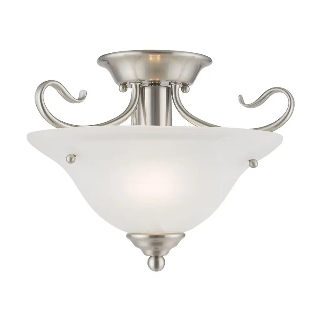 Three Light Semi Flush Mount from Dover collection in Brushed Nickel finish. Number of Bulbs 3. Max Wattage 60.00. No bulbs included. The Dover Collection takes classic design and offers its own unique, modern twist. Characterized by its sweeping arms, Dover fixtures offer a clean look while remaining fresh and exciting. With our Brushed Nickel finish over its hand-wrought steel frame, you can be sure of a high quality fit and finish that is second to none. This 3 light Dover Semi-Flush uses 60-watt (max.) bulbs for everyday lighting. With its etched seedy glass base, this fixture brings a timeless design into any room. It measures 15 ?in. in diameter with a 14in. body height. No UL Availability at this time.