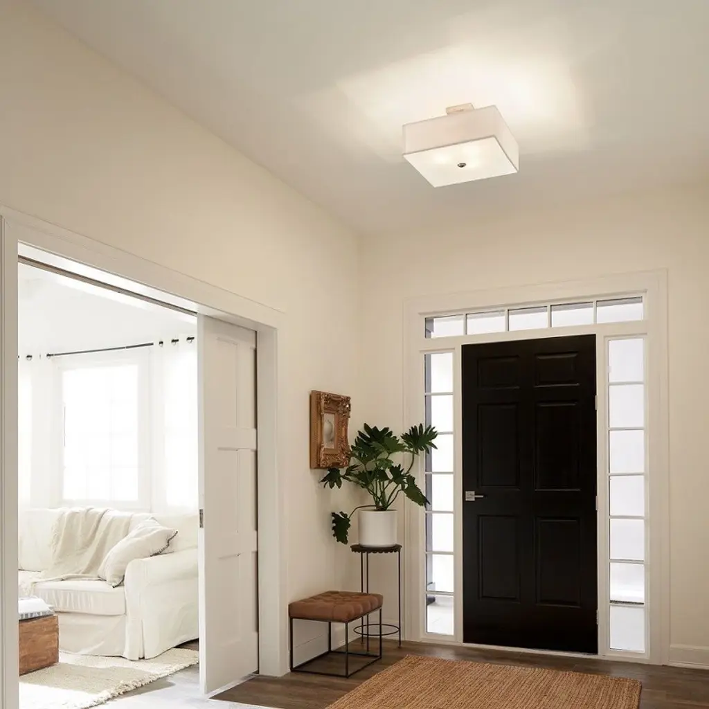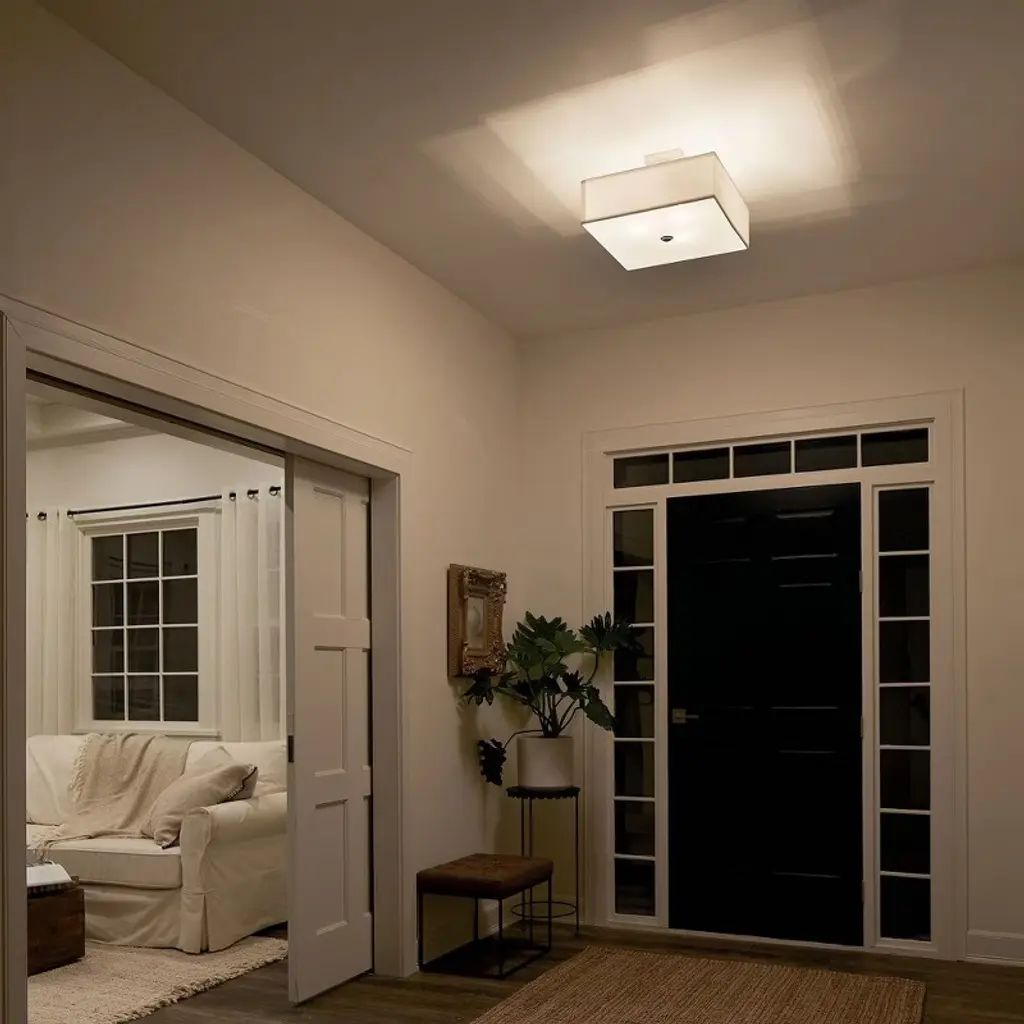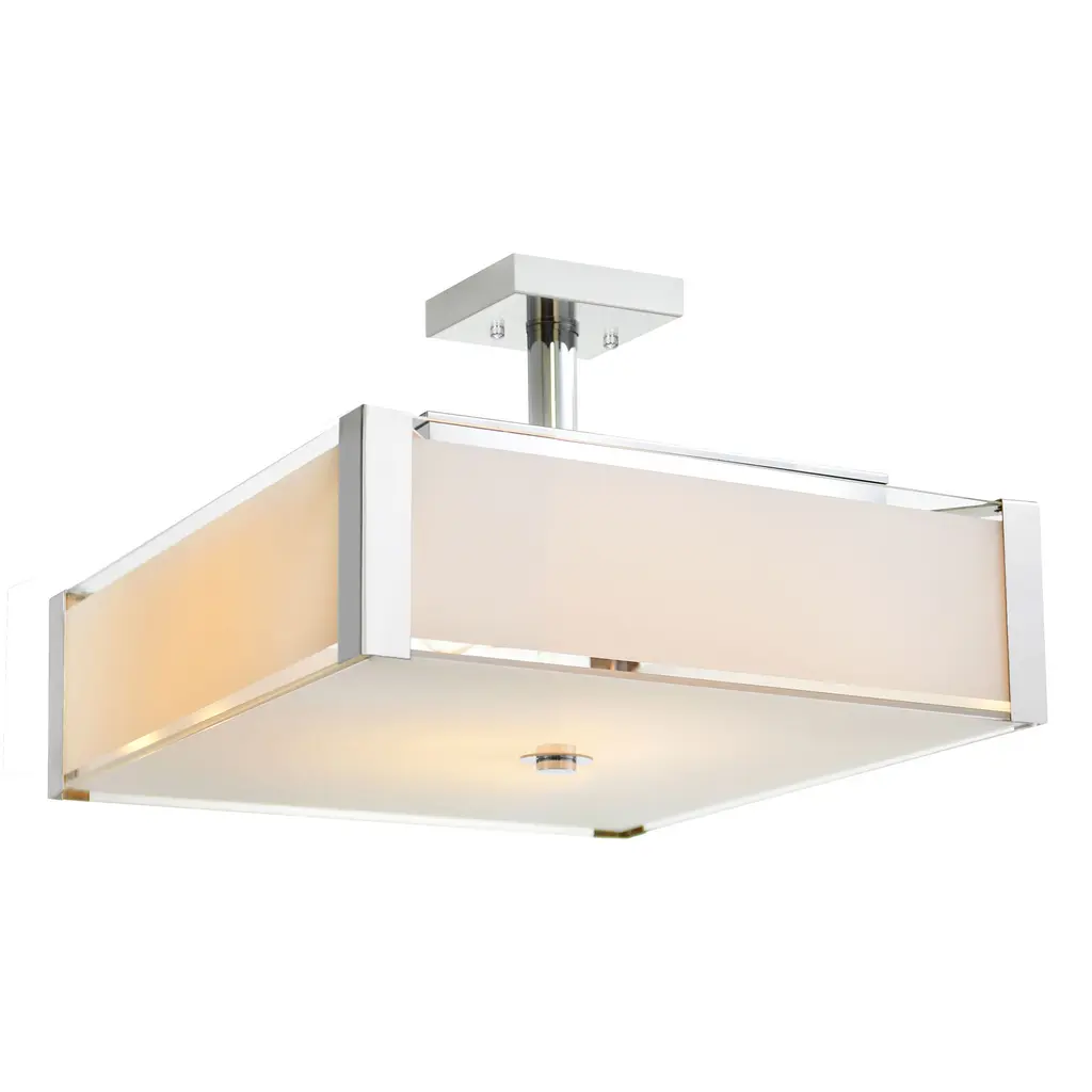 The straight lines and up-sized Satin Etched glass of this Brushed Nickel 18in. 3-light semi flush ceiling light from the Shailene(TM) collection create the perfect casual look for the updated urban lifestyle. Material: Steel, Finish Color: Brushed Nickel, Width: 18", Height: 11", Lamping Type: Incandescent, Number Of Bulbs: 3, Wattage: 75 Watts, Dimmable: No, Moisture Rating: Dry Rated