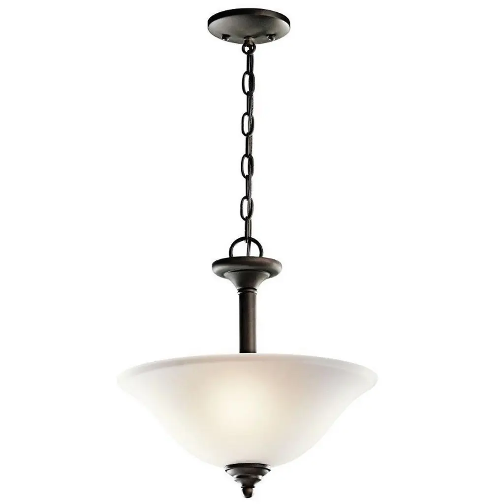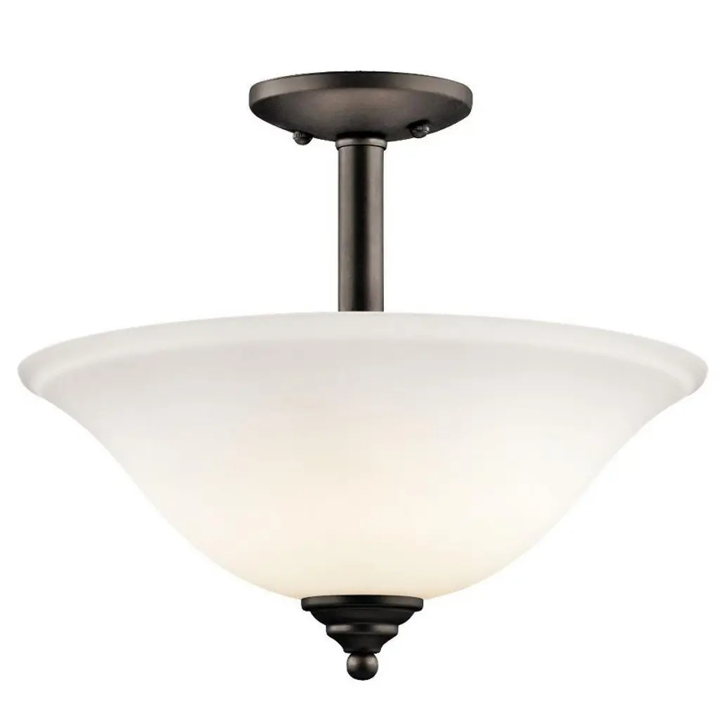 This 2 light semi flush inverted pendant from the Armida(TM) collection is filled with contemporary touches, clean lines and simple structures. The transitional silhouette brings height and dimension to the Brushed Nickel finish and Satin Etched Glass. Back Plate Width: 5.00 Chain Length: 36.00 Material: Steel, Finish Color: Olde Bronze, Width: 15", Height: 15.25", Lamping Type: Incandescent, Number Of Bulbs: 2, Wattage: 100 Watts, Dimmable: No, Moisture Rating: Dry Rated
