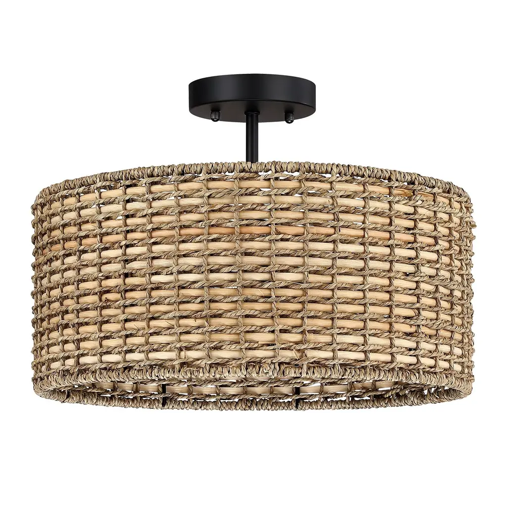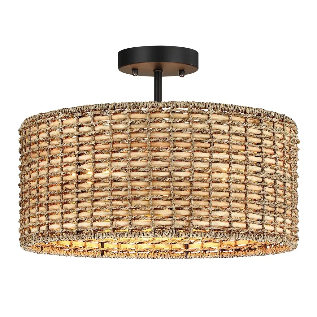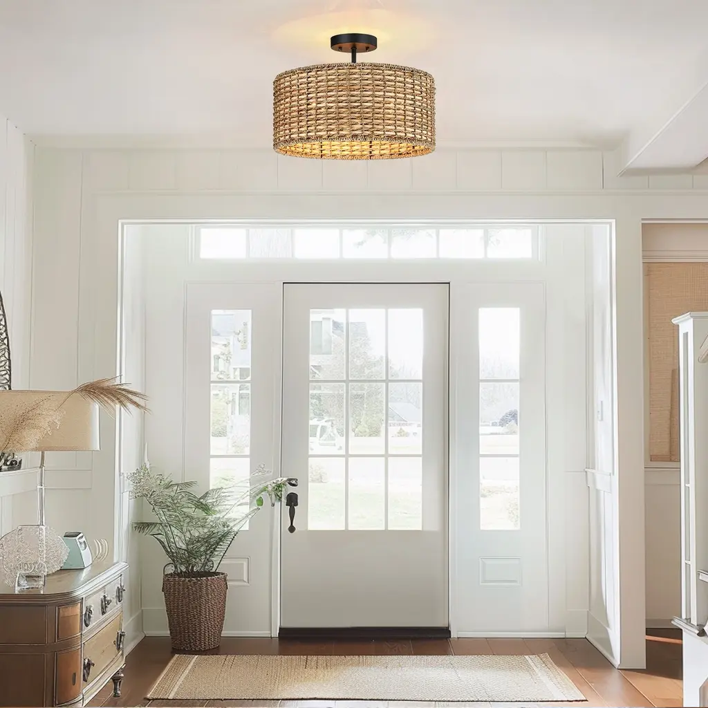 Nothing adds warmth and a casual inviting vibe like a natural woven semi-flush mount ceiling light. This flush mount is meticulously hand woven of natural rattan and seagrass in a drum silhouette. Inside, a 3-light cluster in matte black casts generous light and creates interesting shadow patterns on the walls of your entry, dining room or bedroom. This collection can work with a variety of decors, from boho, bohemian, coastal, eclectic, farmhouse to traditional styling, which is an ideal selection for hallway, entryway, stairway, door way, or a foyer to bring warmth to a living room, dinning room or bedroom