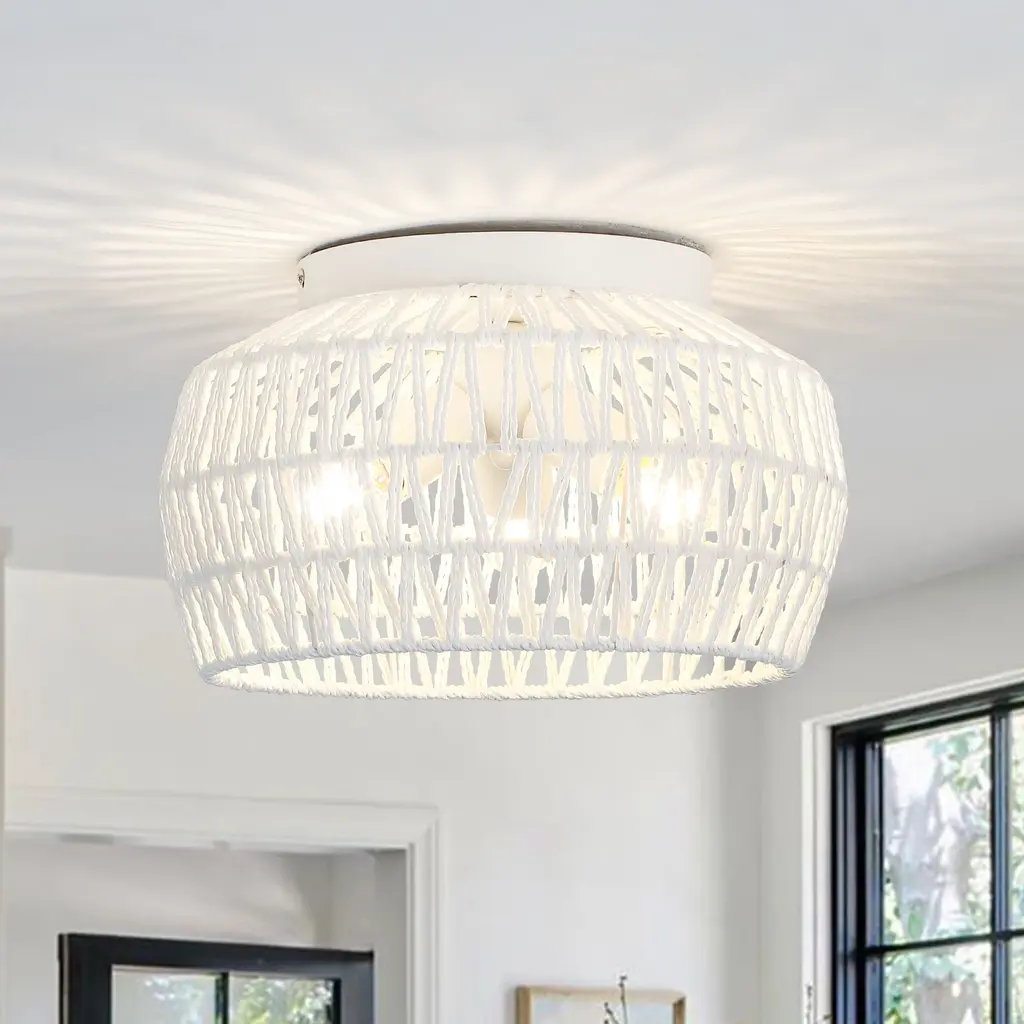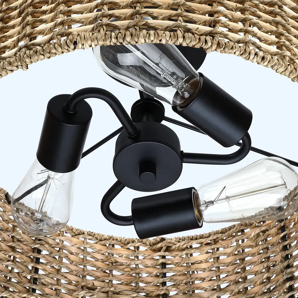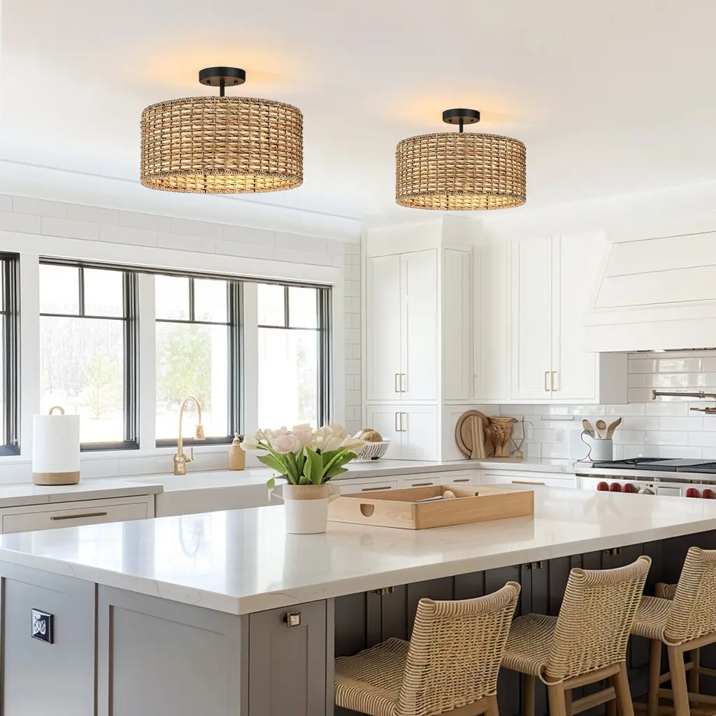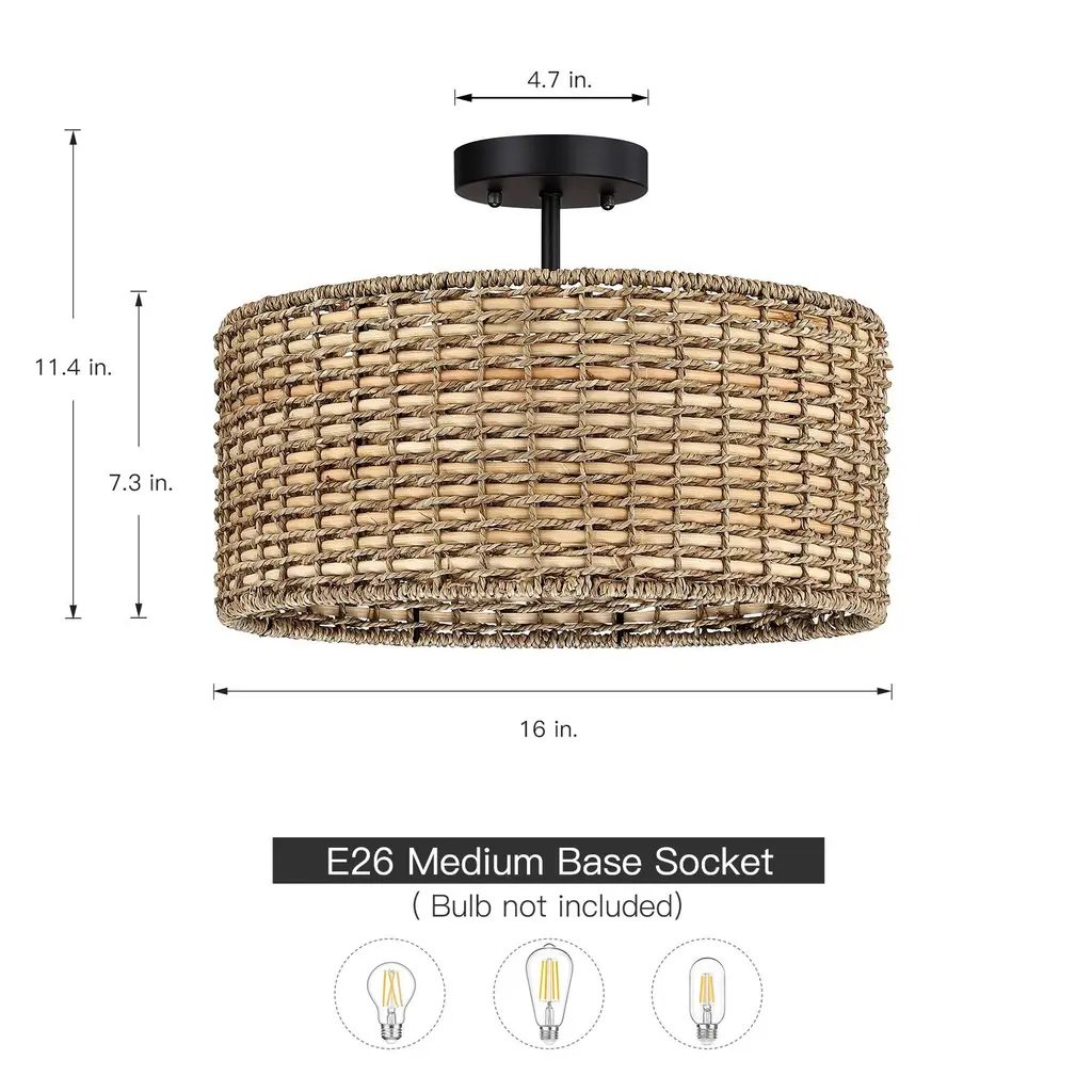 Nothing adds warmth and a casual inviting vibe like a natural woven semi-flush mount ceiling light. This flush mount is meticulously hand woven of natural rattan and seagrass in a drum silhouette. Inside, a 3-light cluster in matte black casts generous light and creates interesting shadow patterns on the walls of your entry, dining room or bedroom. This collection can work with a variety of decors, from boho, bohemian, coastal, eclectic, farmhouse to traditional styling, which is an ideal selection for hallway, entryway, stairway, door way, or a foyer to bring warmth to a living room, dinning room or bedroom