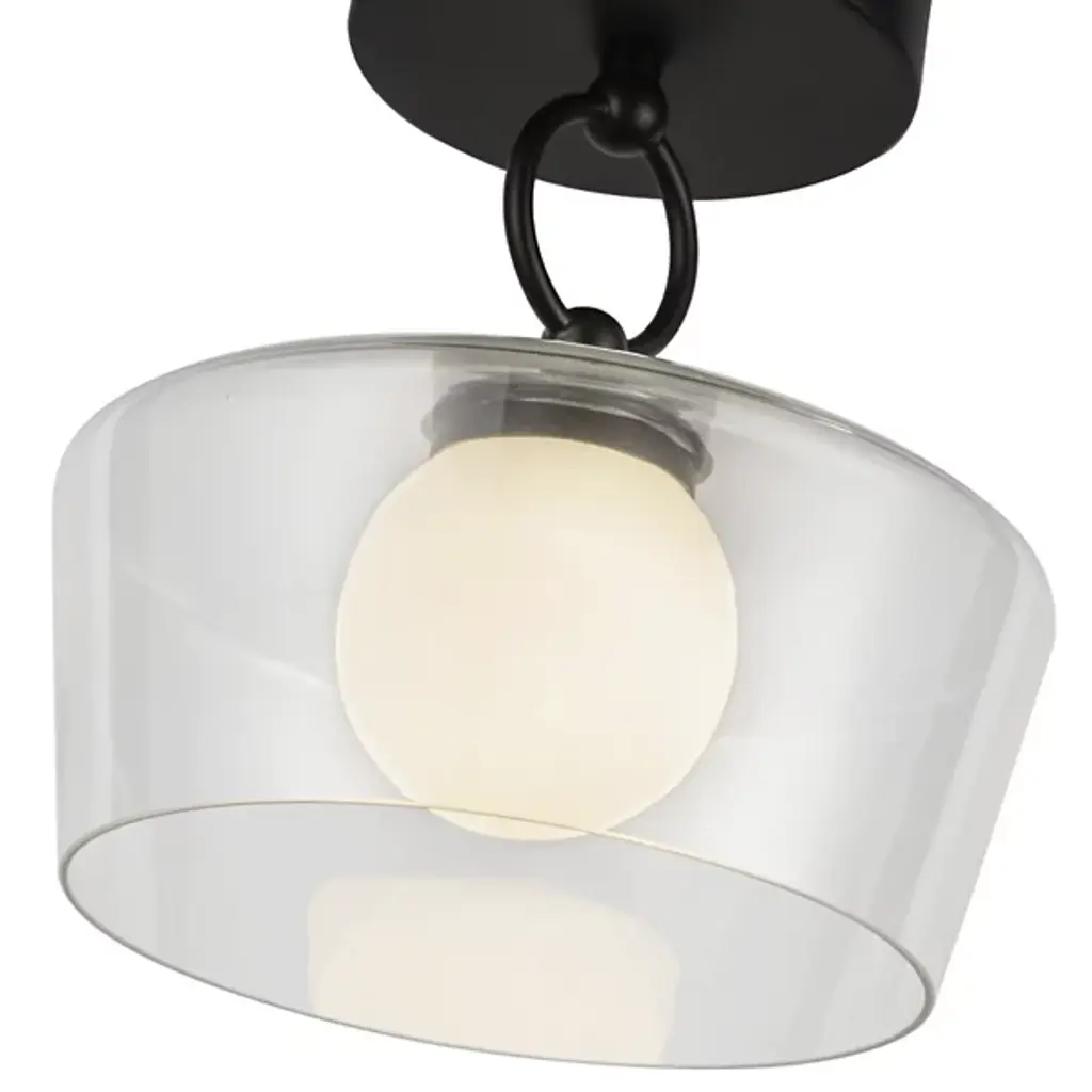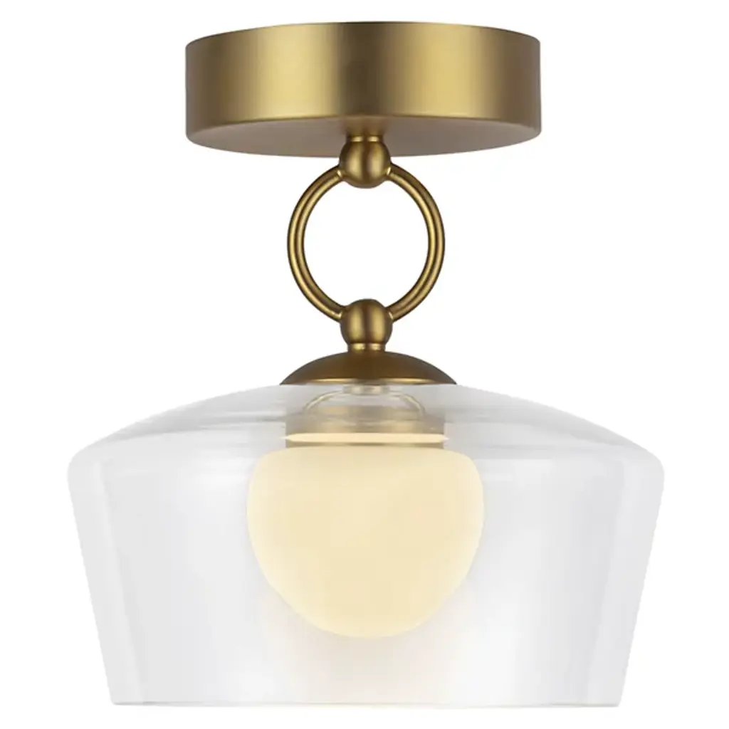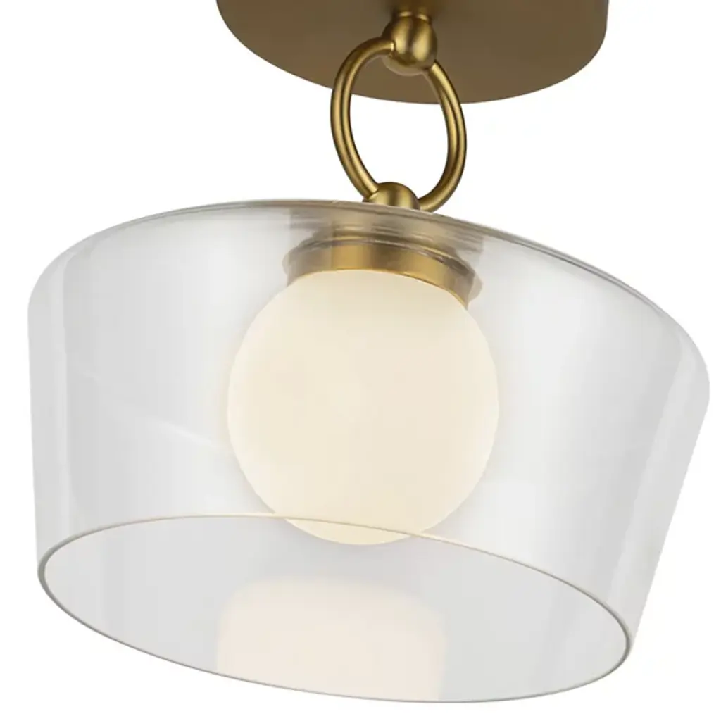 The Leota LED Semi-Flushmount from Alora Mood, designed by Kuzco NYC Studio, brings the elegance of fine jewelry into your home. It features a distinctive bangle-inspired loop that cradles a clear glass shade and adds sculptural beauty to any space. Inside, an opal glass diffuser softens and enriches the light, creating a warm and inviting glow. Its artistic design and refined details make it a functional fixture and striking decorative element for contemporary interiors.